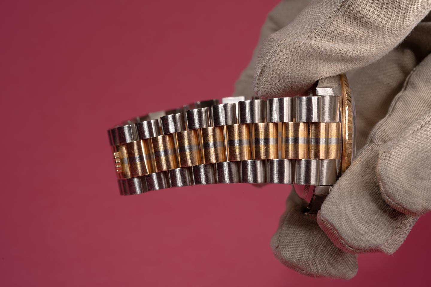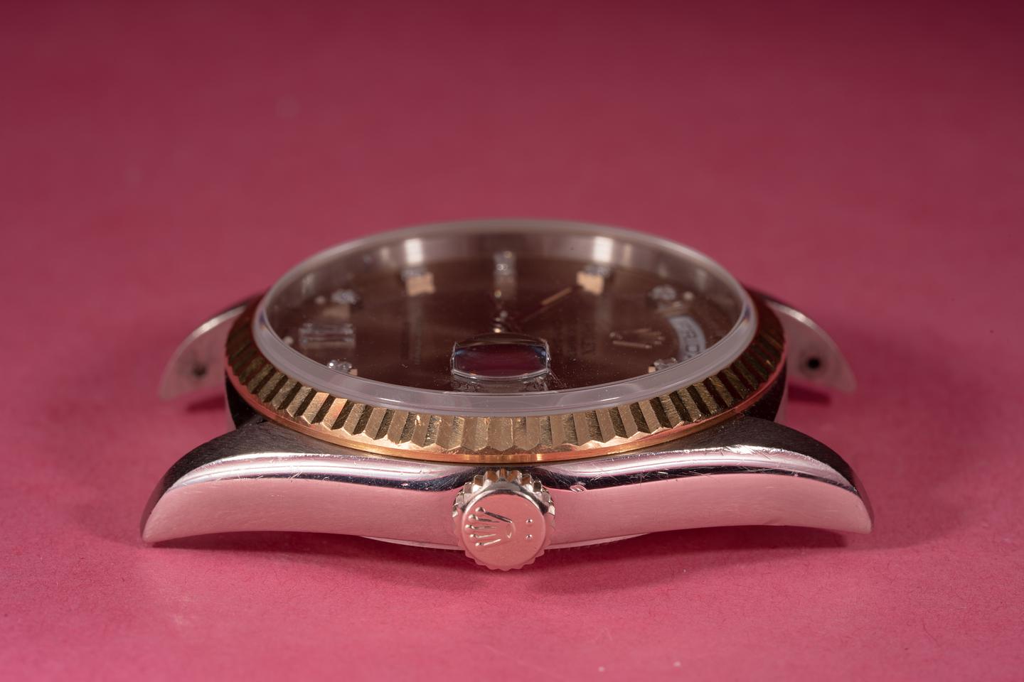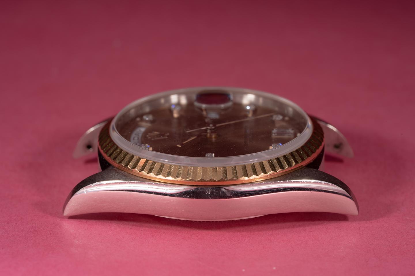 Case: The thick and even 18k white gold case is excellent with light wear from use. The 18k yellow gold fluted bezel is sharp and shows only light wear from use.