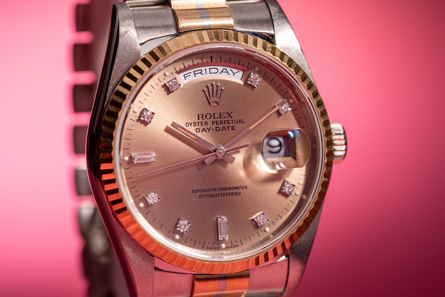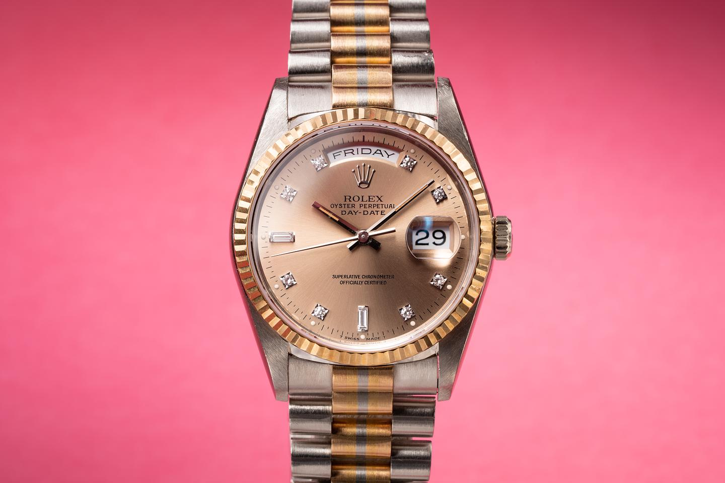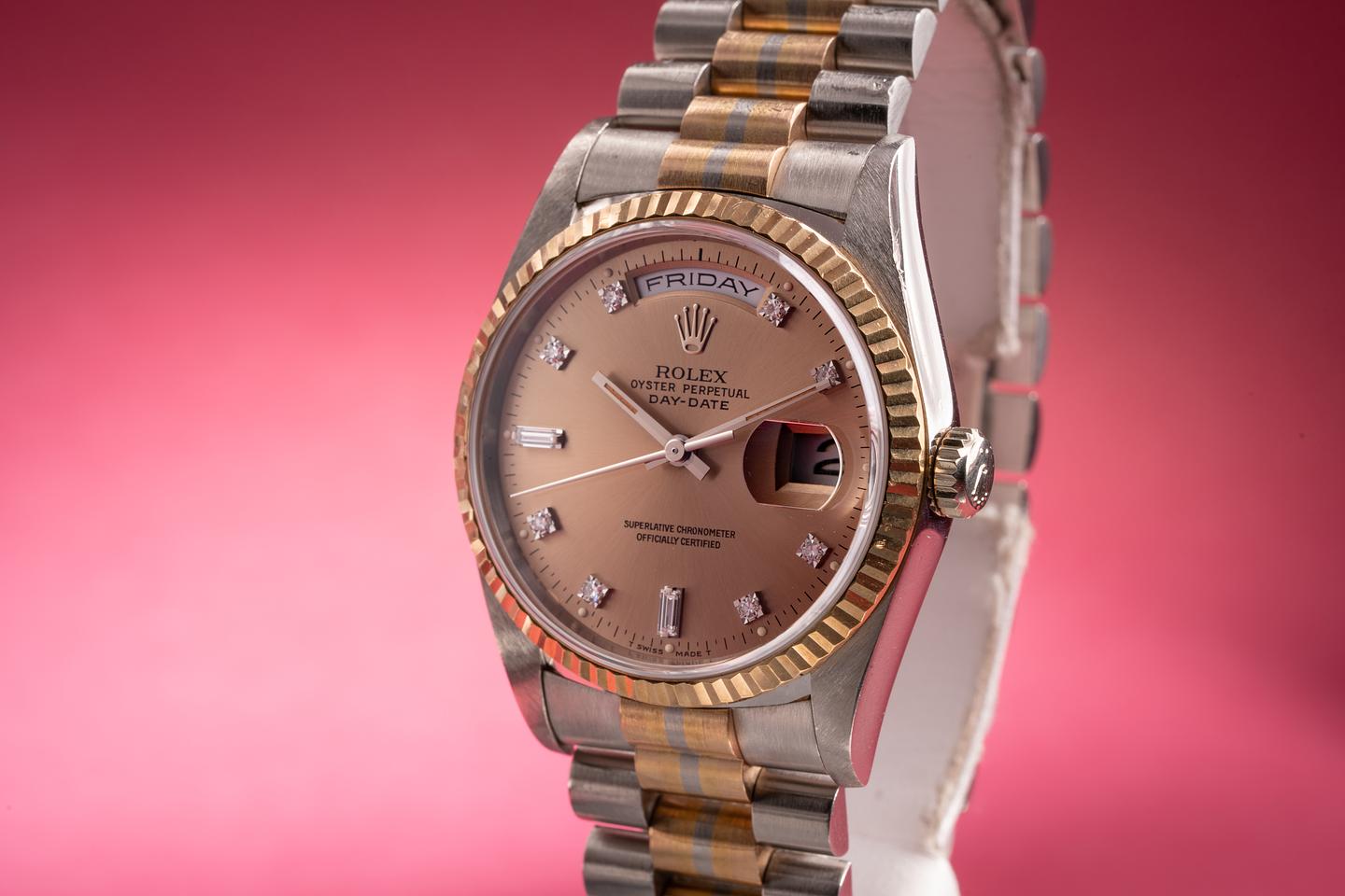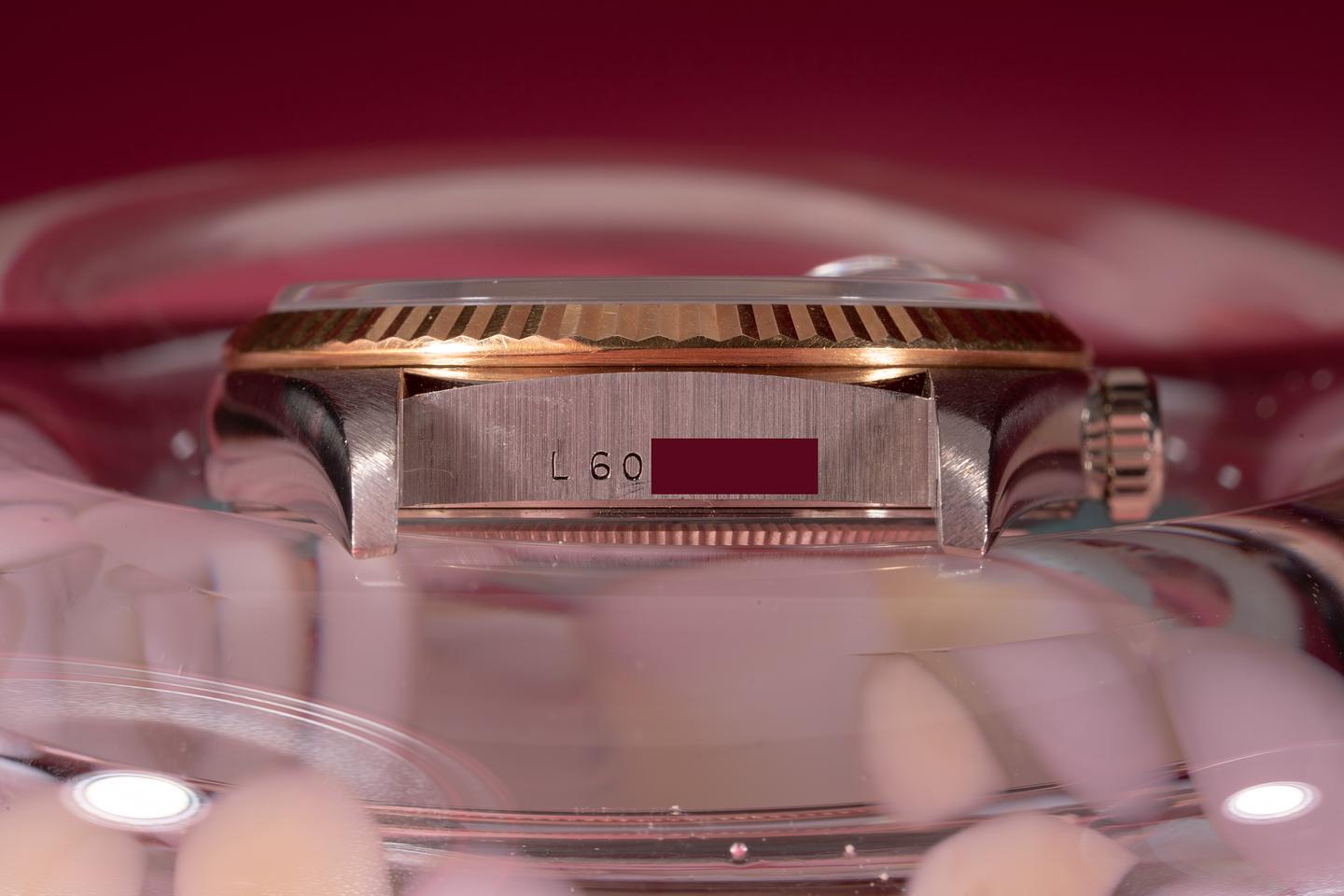 Case: The thick and even 18k white gold case is excellent with light wear from use. The 18k yellow gold fluted bezel is sharp and shows only light wear from use.