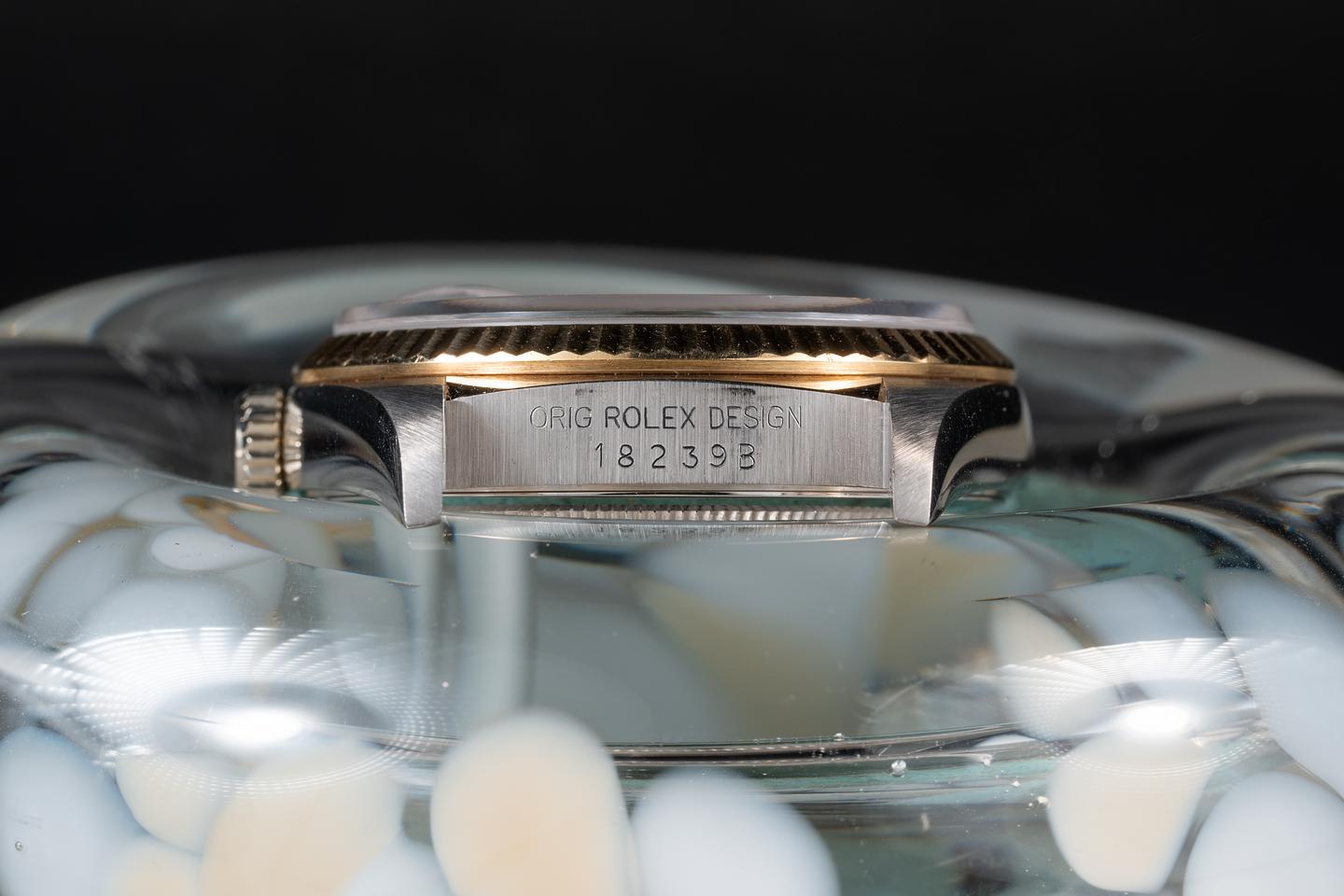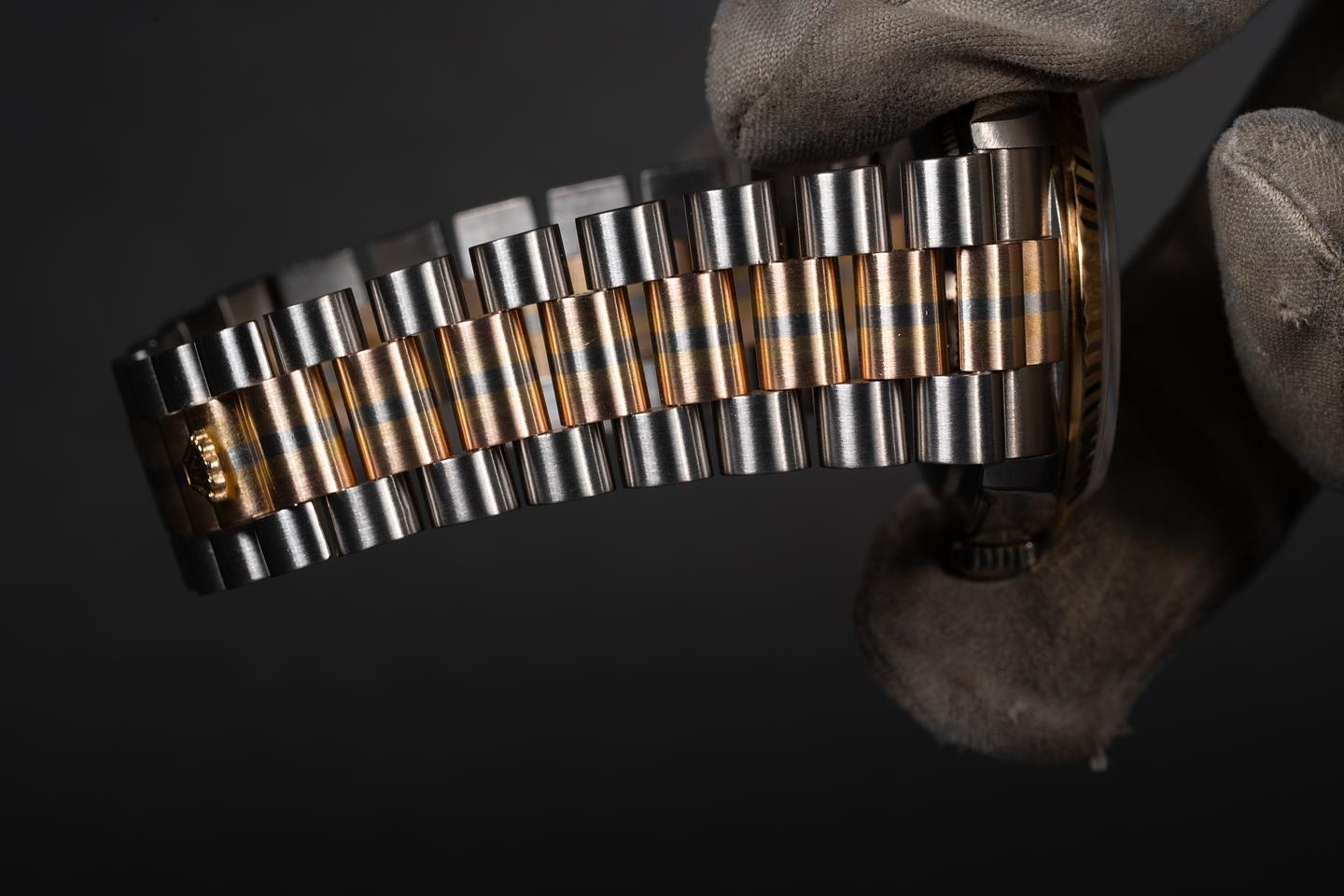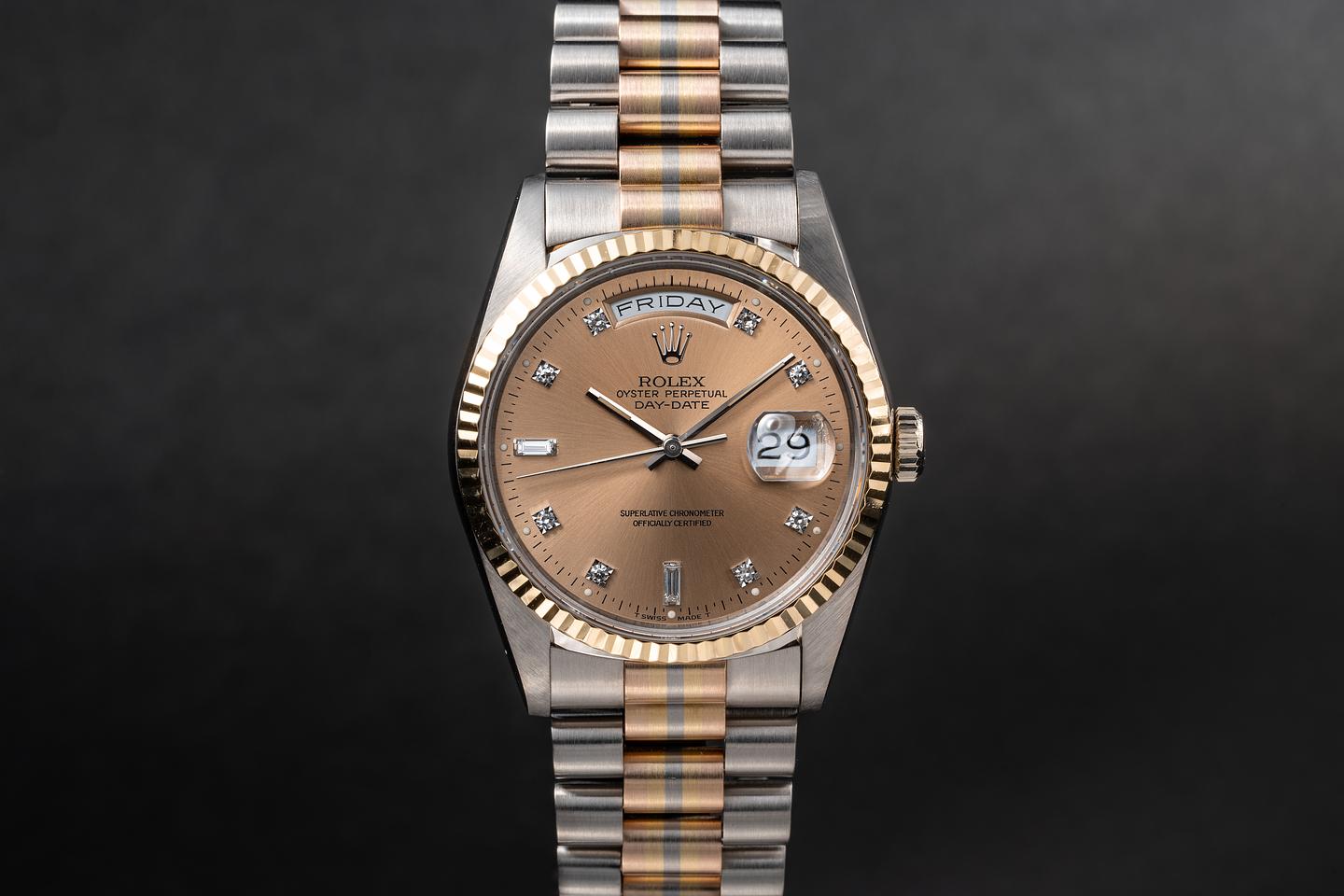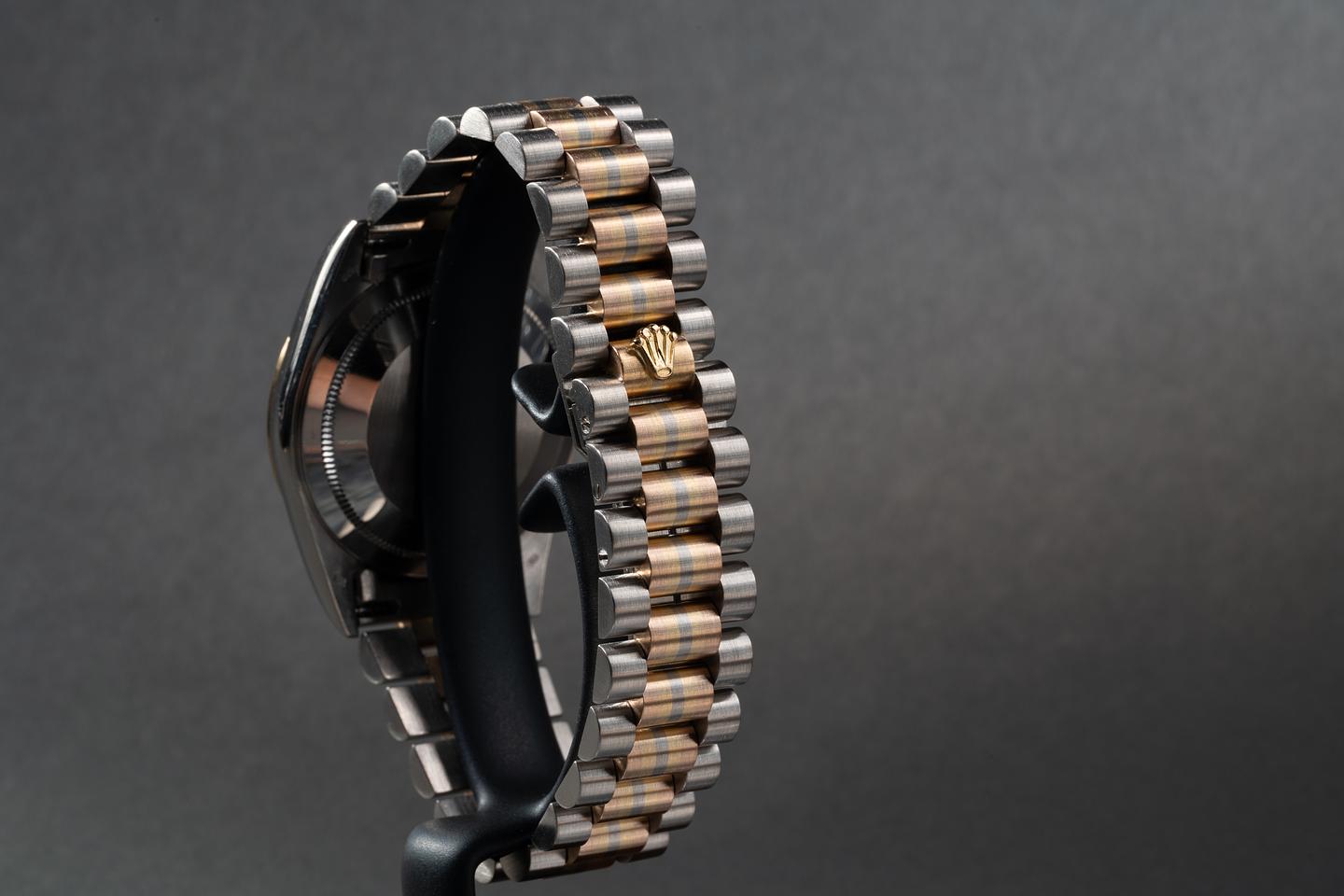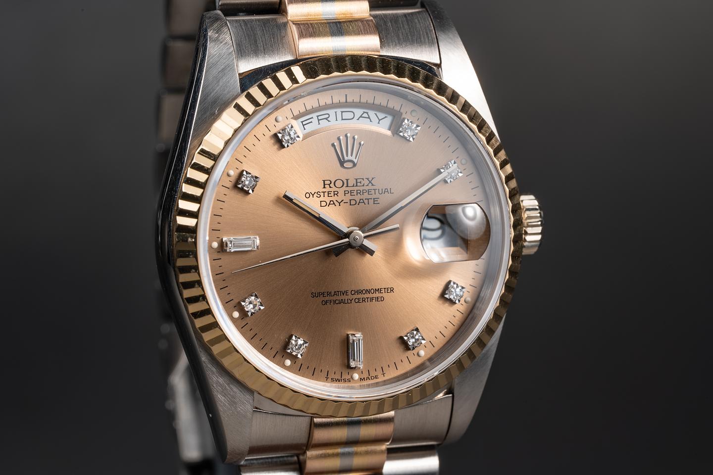 Bracelet: The 22 link 18K white, yellow, and rose gold Tridor President bracelet is excellent showing only very light stretch for its age. The clasp is stamped with a matching 1989 date code.