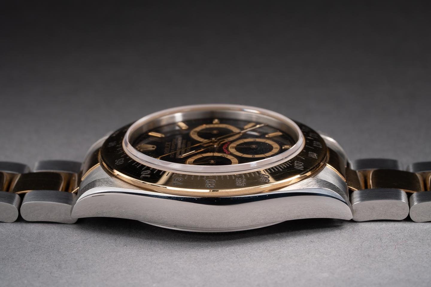 Case: The sharp unpolished case is excellent showing only extremely light wear. The 18k yellow gold bezel is also in excellent condition showing only extremely light wear.
