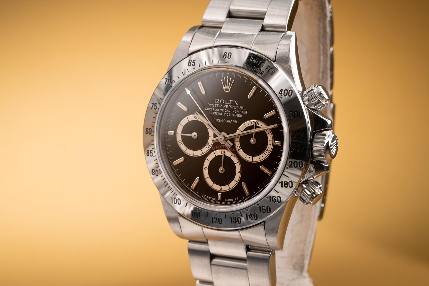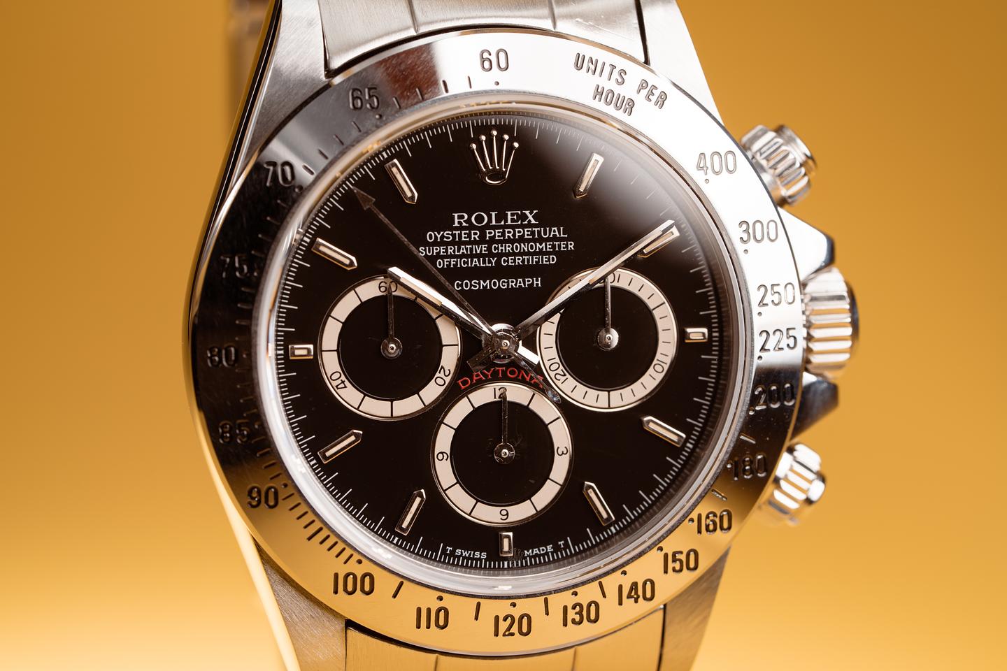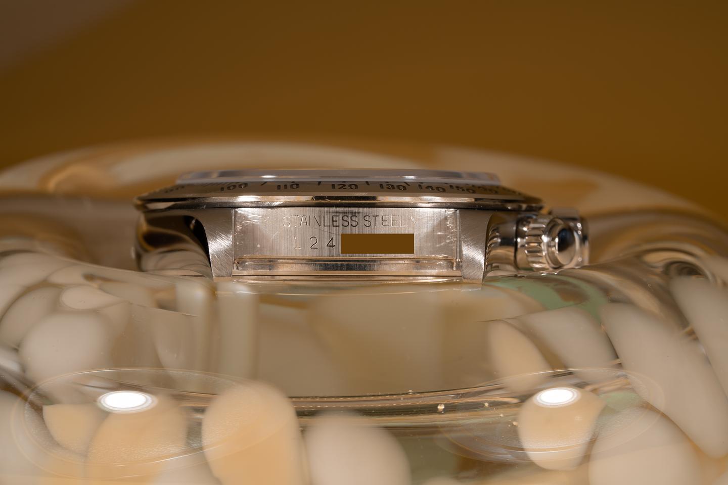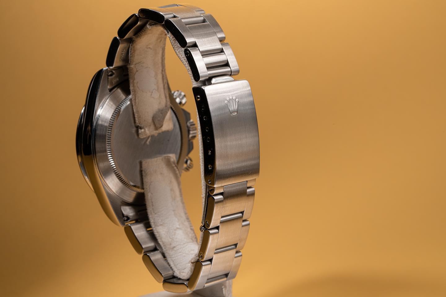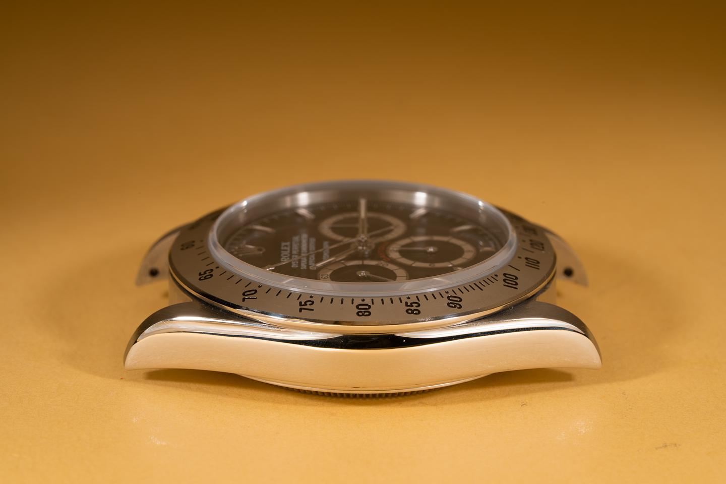Dial: The black "Floating" Cosmograph inverted 6 dial is excellent showing only very light wear overall. The lume has aged to a warm creamy hue and the hands match perfectly. The dial looks to be beginning it's turn towards tropical and appears slightly brown under direct sunlight.