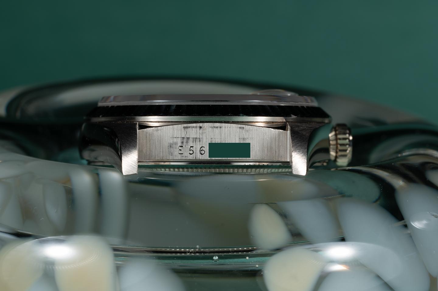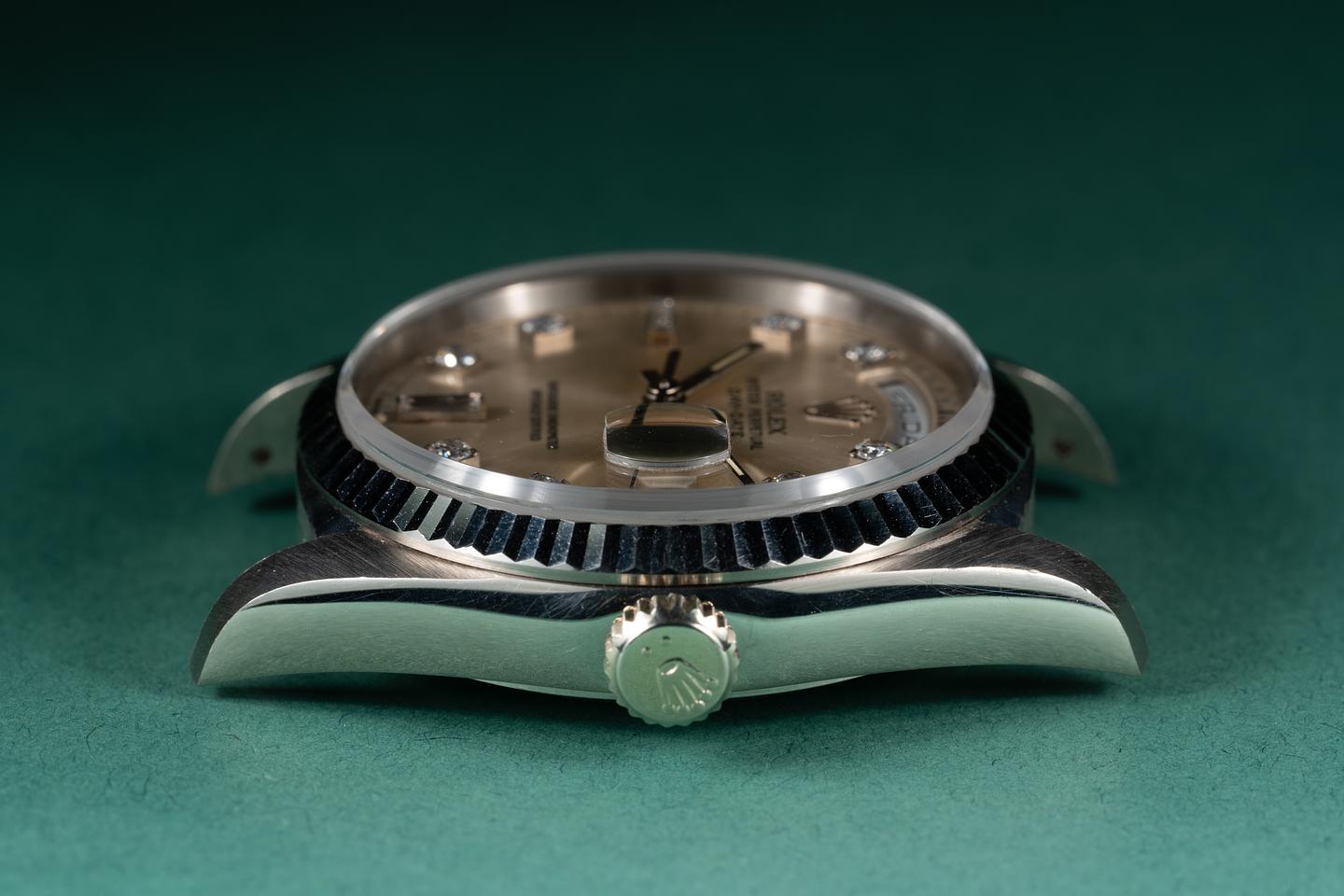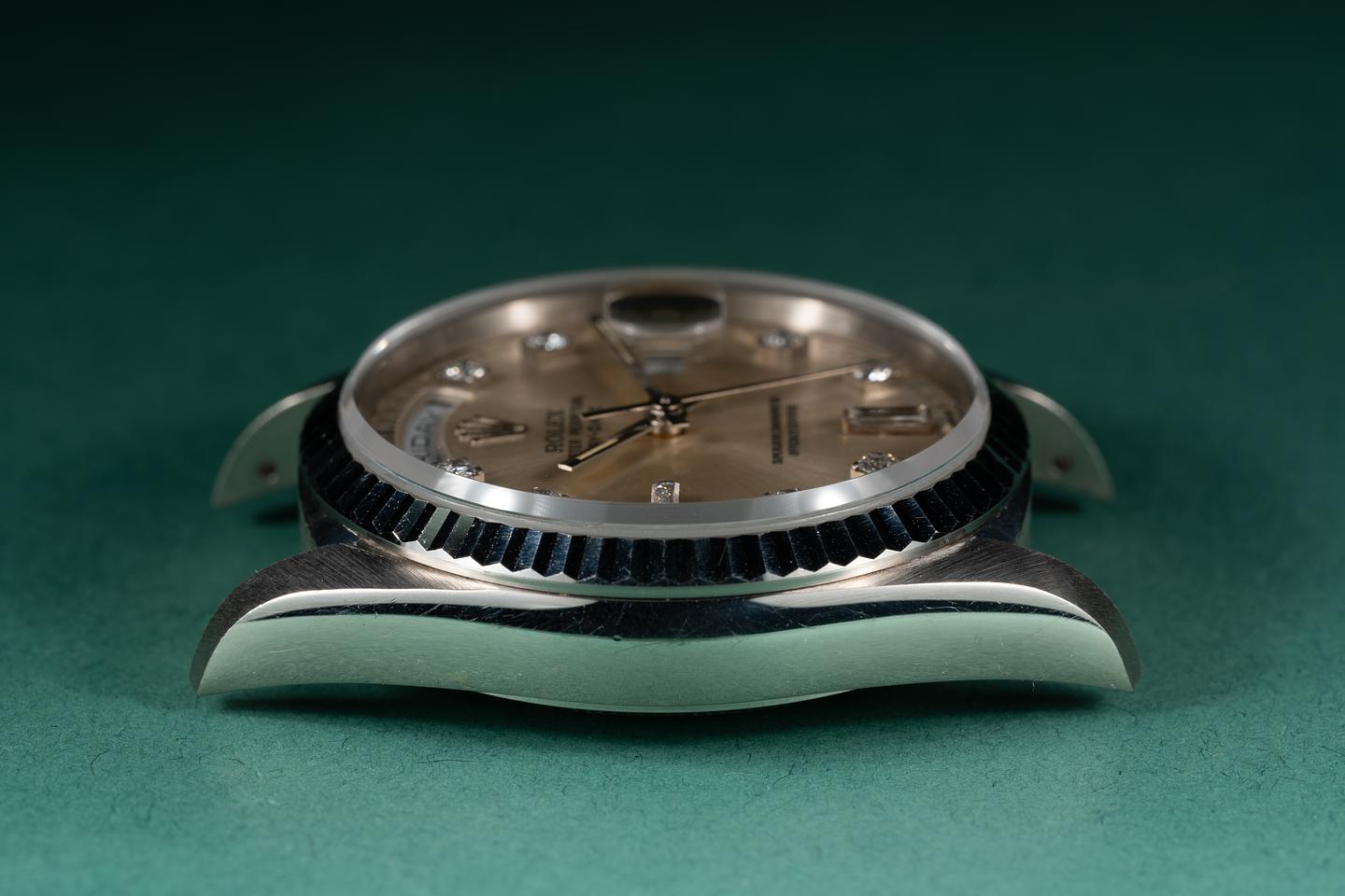Case: The 36mm 18k white gold case is excellent showing only light wear fro use. The sharp 18k white gold fluted bezel is also in excellent condition showing only light wear from use.