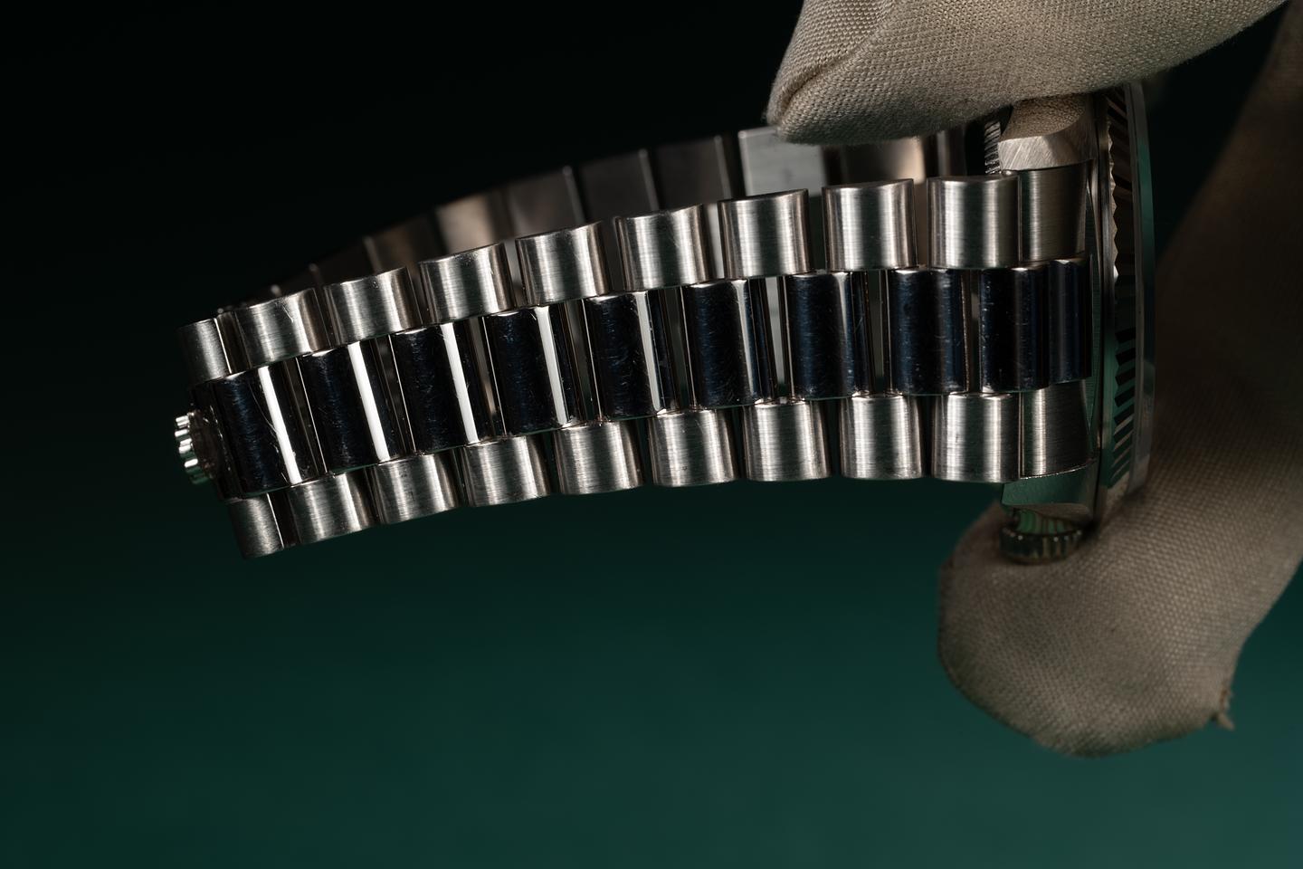 Bracelet: The 22 link 18K white gold President bracelet is excellent showing only light stretch for its age. The clasp is stamped with a matching 1990 date code.