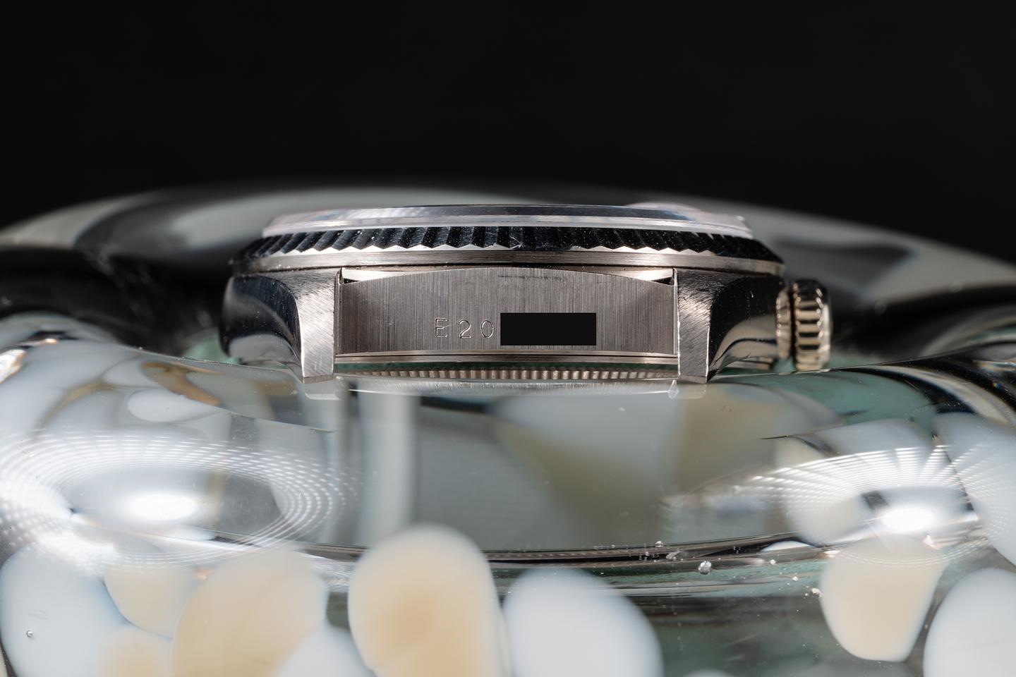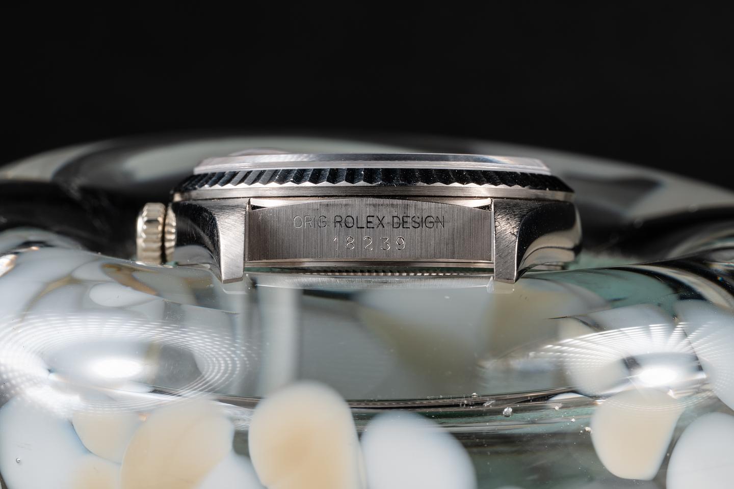 Case: The thick, sharp, and even 18K white gold case is excellent, showing only light wear from use. The sharp 18K white gold fluted bezel is also in excellent condition, showing only very light wear from use.