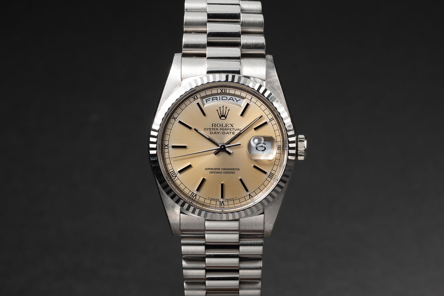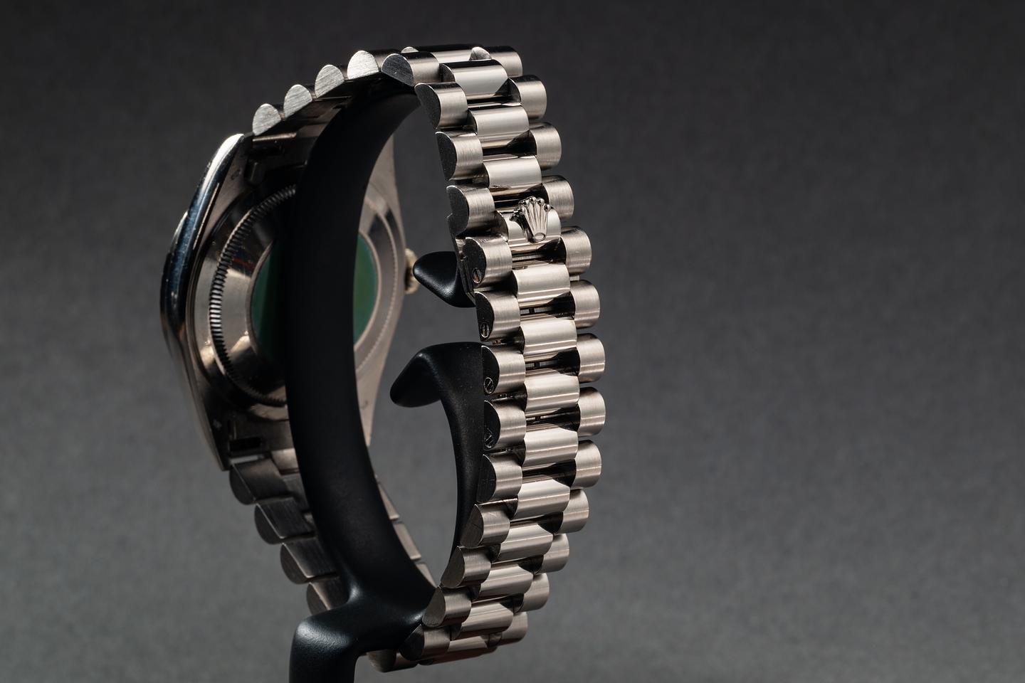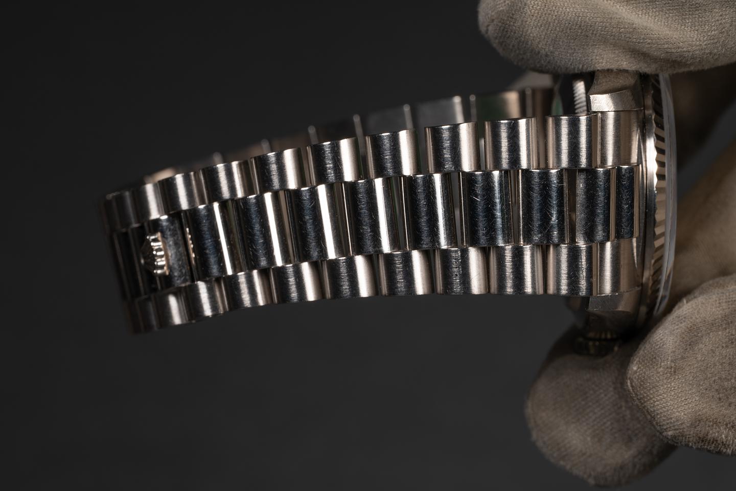 Bracelet: The 22-link 18K white gold President bracelet is excellent, showing only very light stretch for its age.