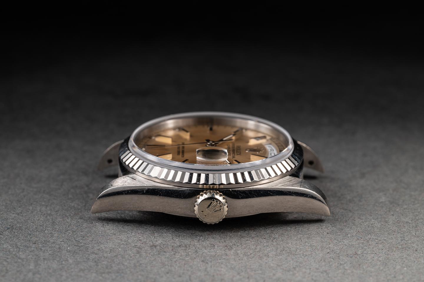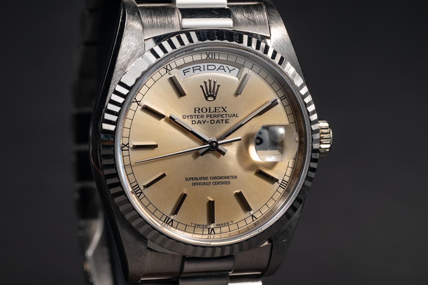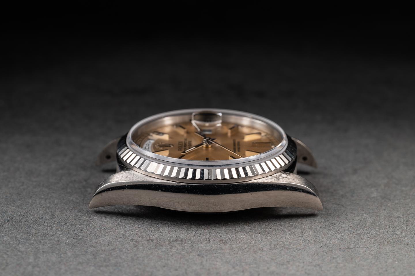 Bracelet: The 22-link 18K white gold President bracelet is excellent, showing only very light stretch for its age.