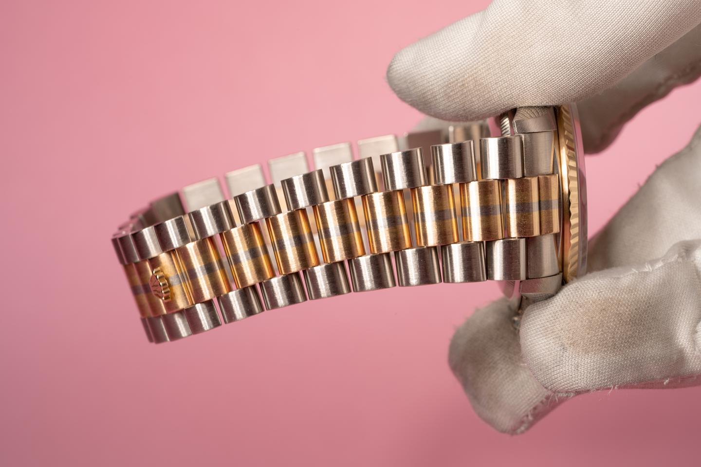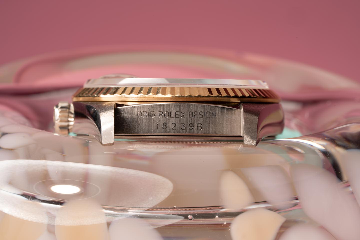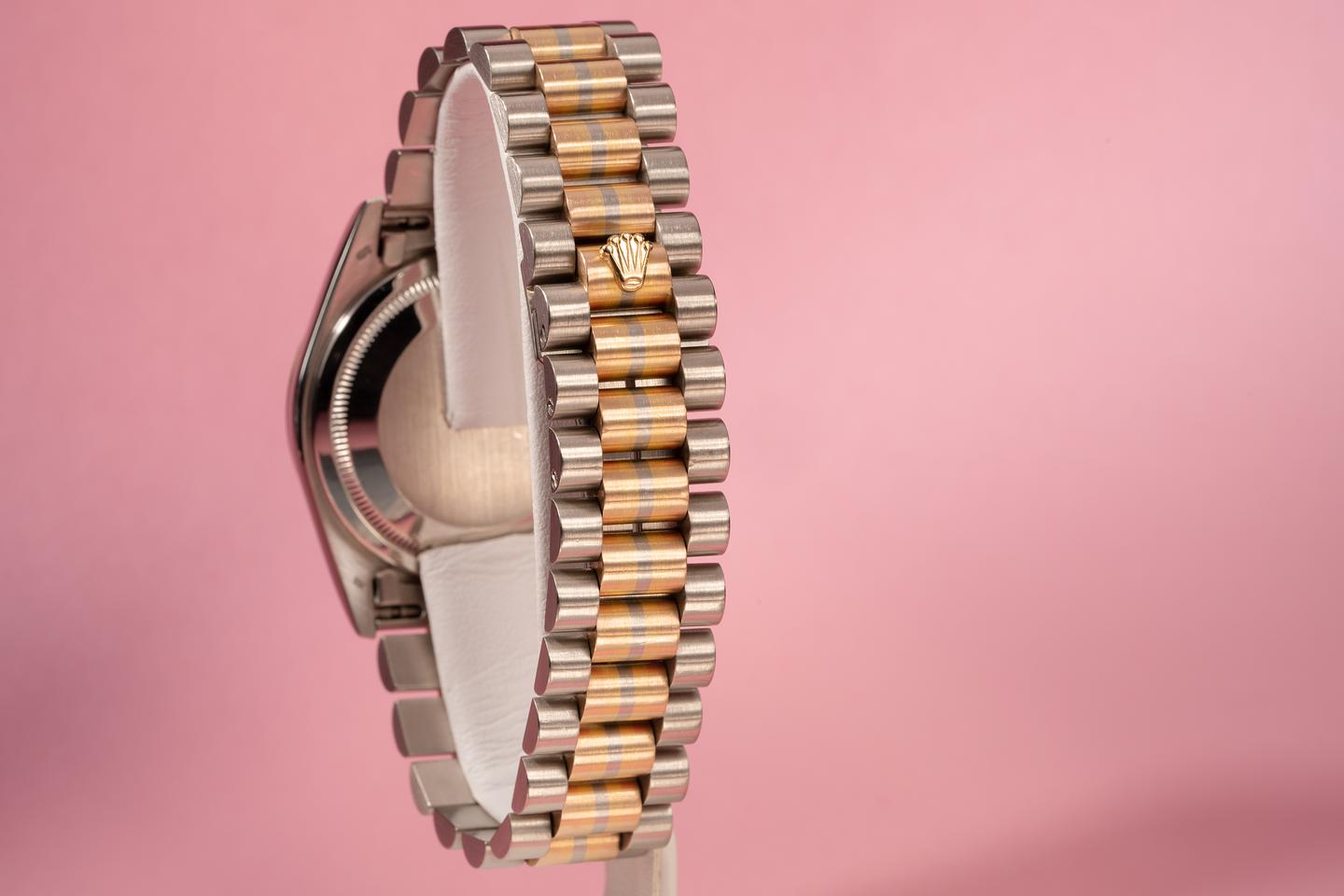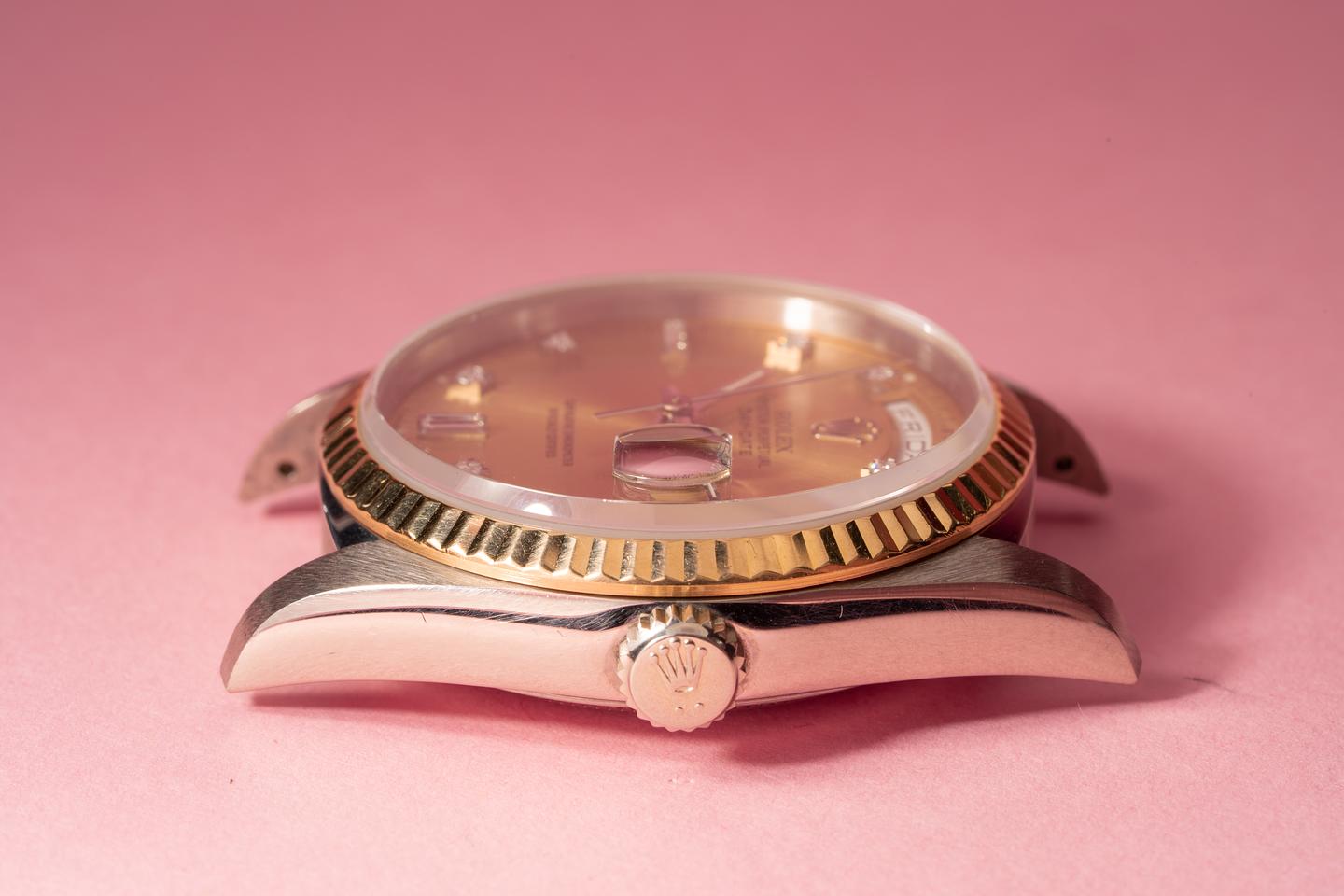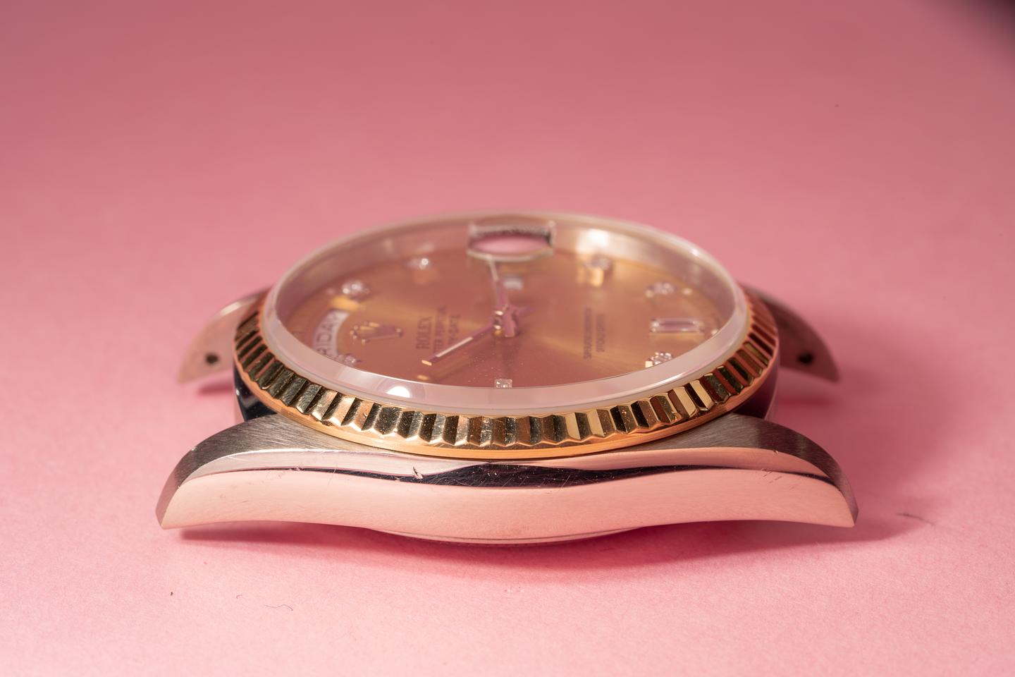 Case: The thick and even 18k white gold case is excellent and shows only very light wear from use. The 18k yellow gold fluted bezel is sharp and shows only very light wear.