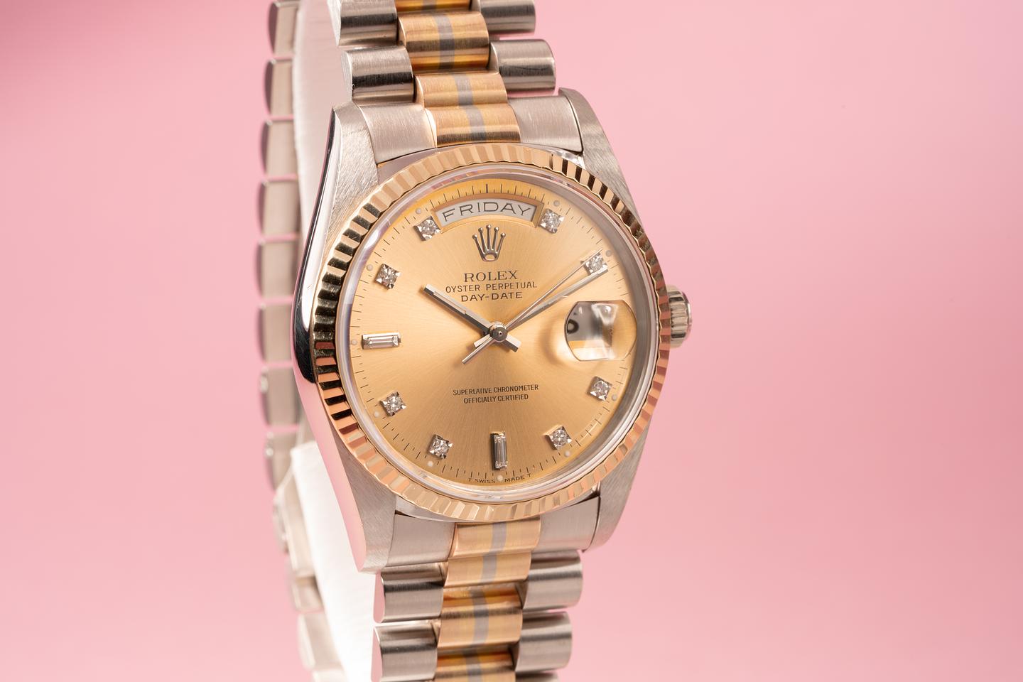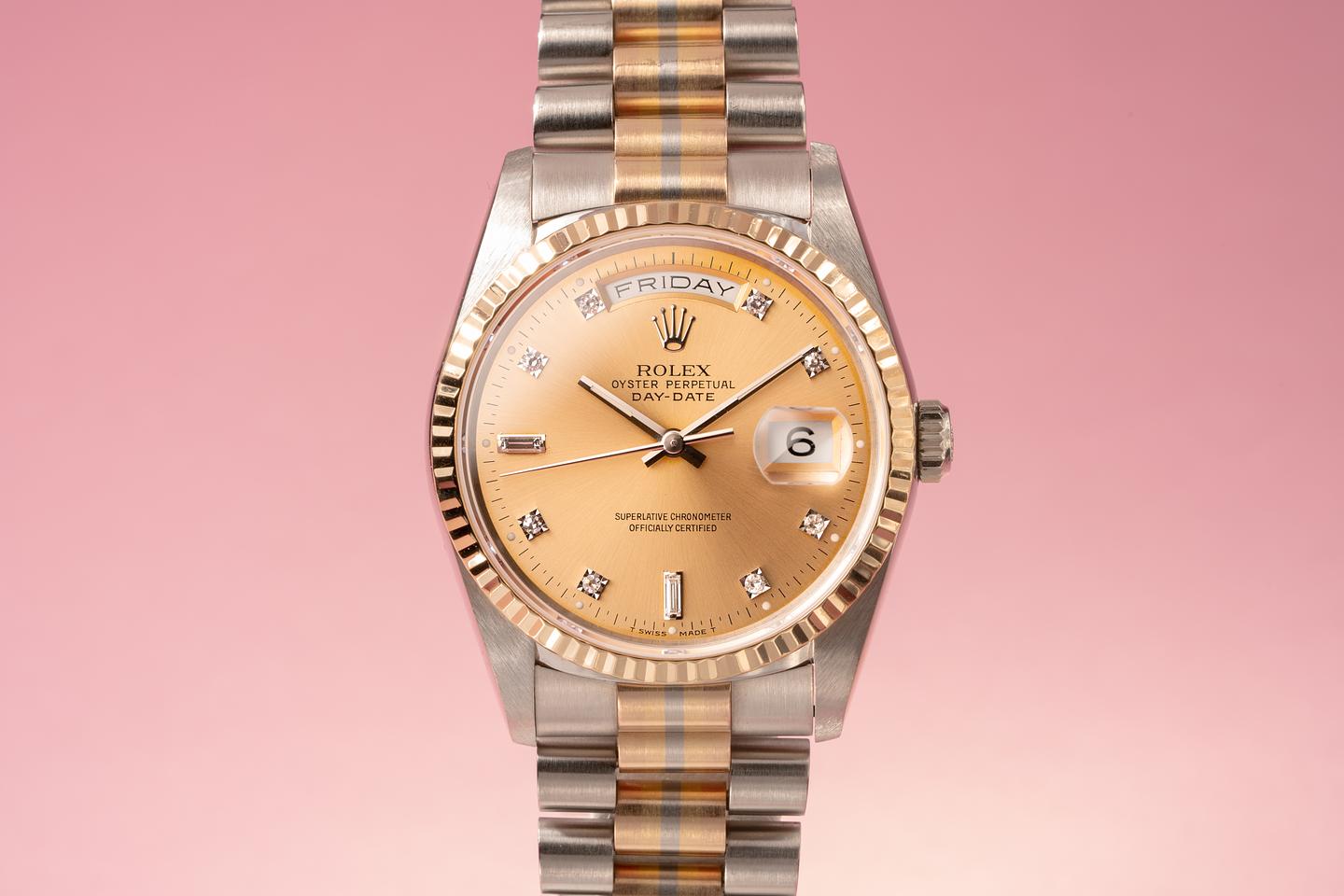 Dial: The diamond dial is excellent and shows no visible wear. The diamond markers are clean, bright, and clear. The lume plots have aged to a clean creamy hue and the hands match perfectly.