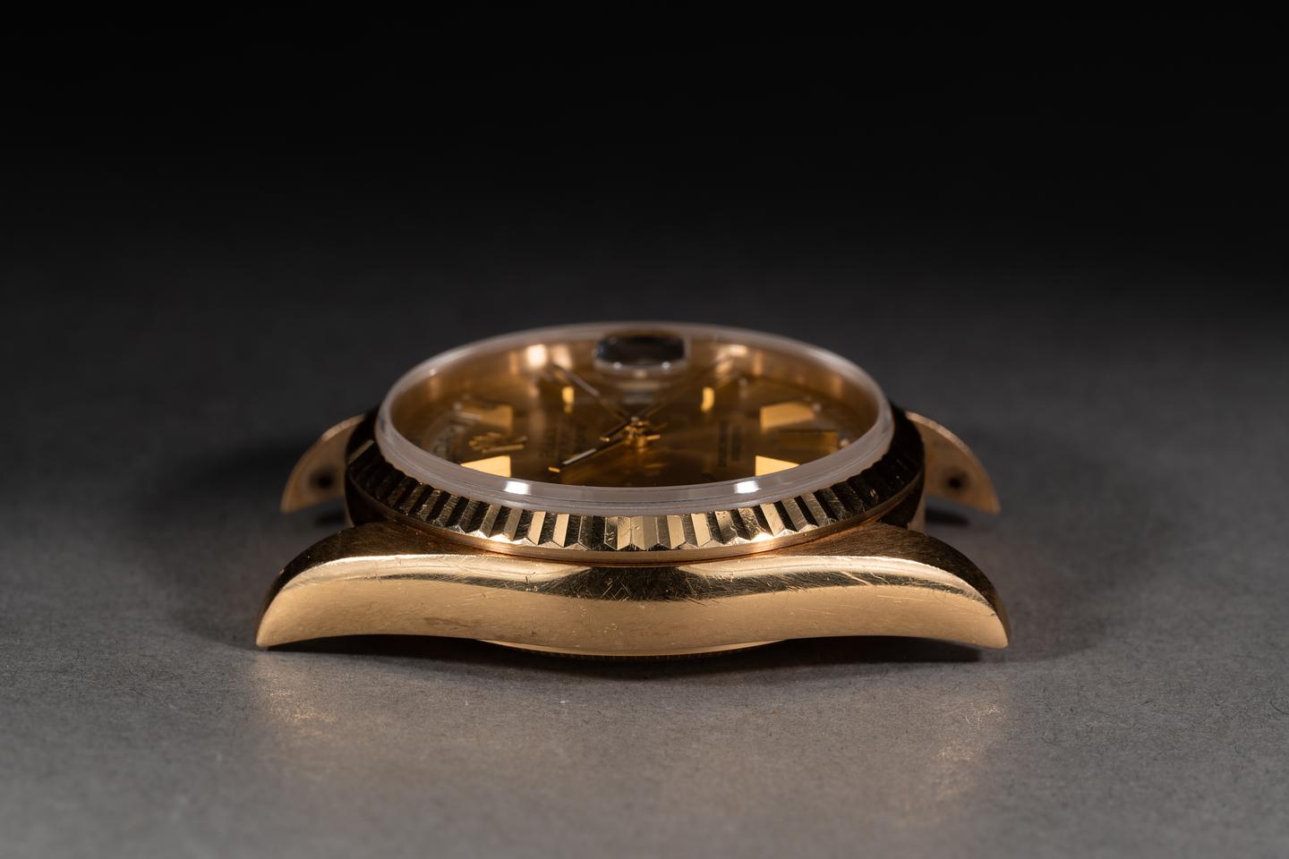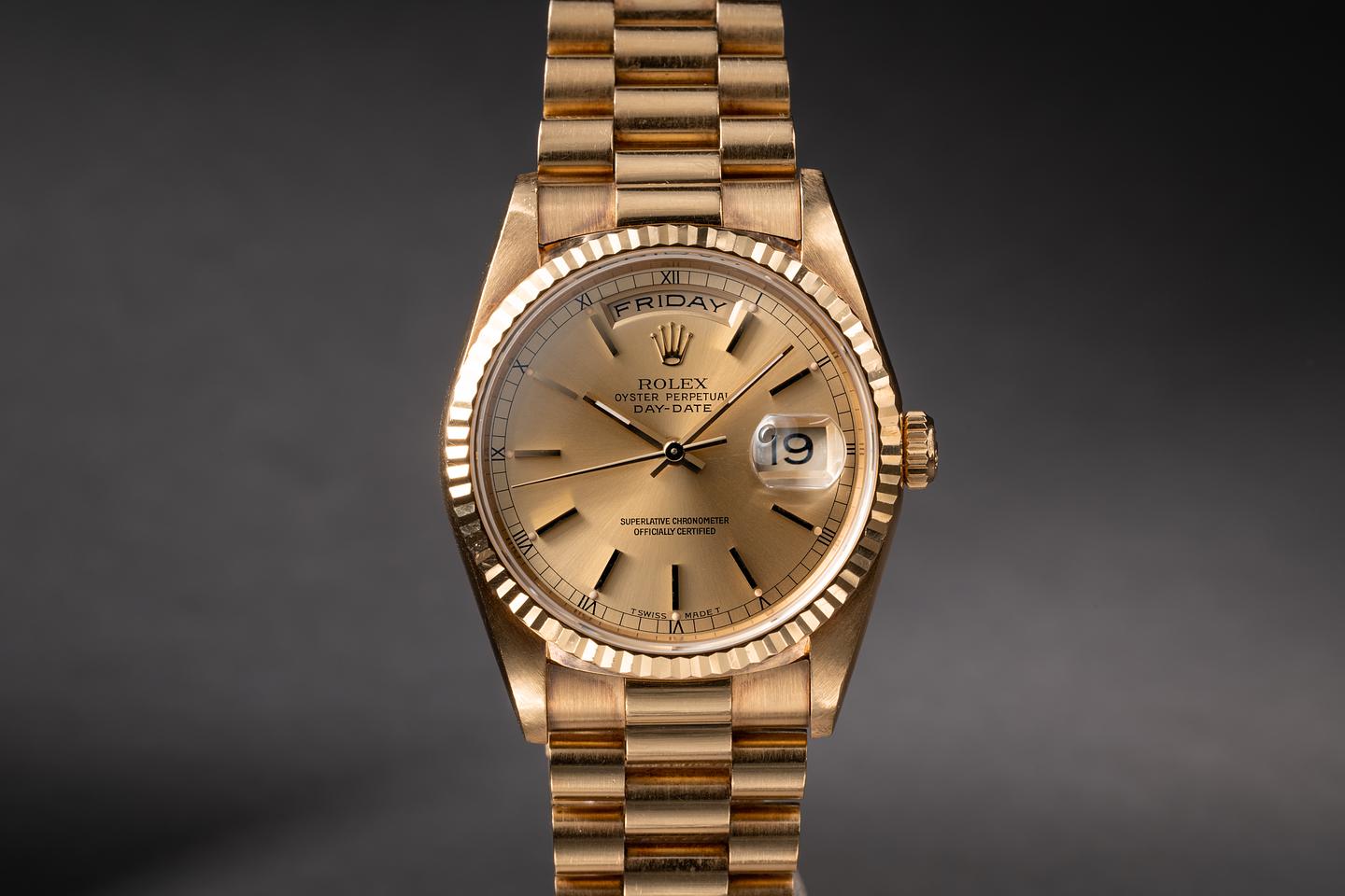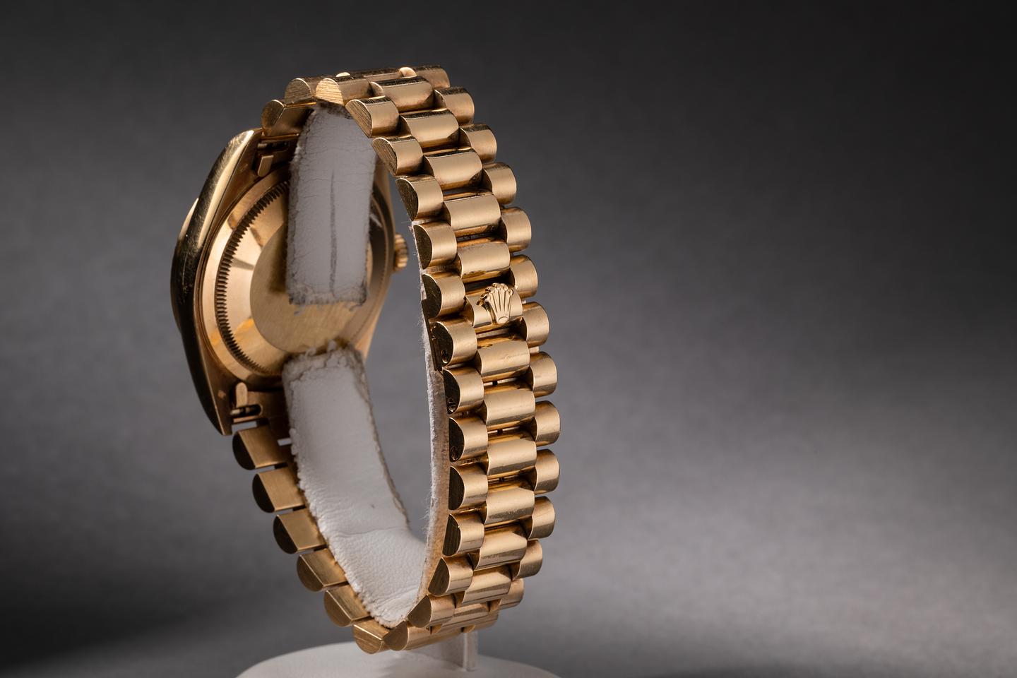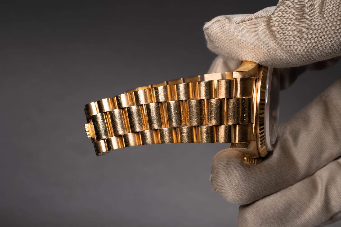 Bracelet: The 22 link 18k yellow gold president bracelet is excellent showing only light stretch for its age. The clasp is stamped with a matching 1990 date code.