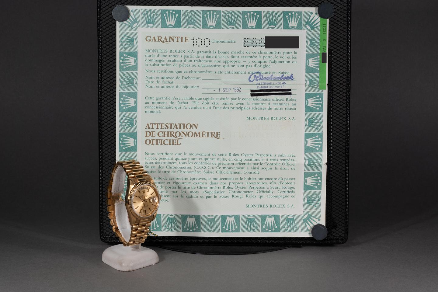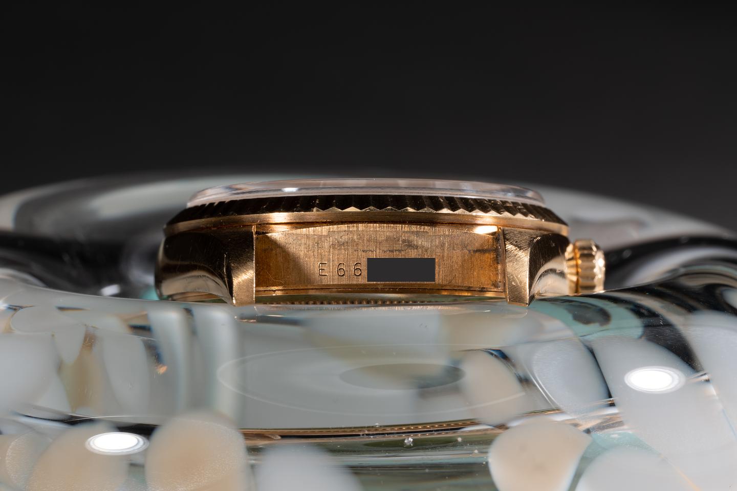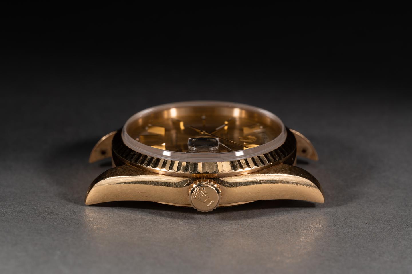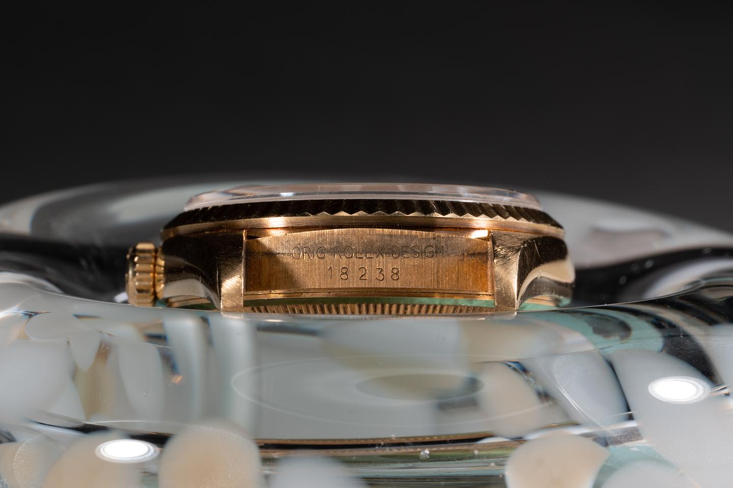 Bracelet: The 22 link 18k yellow gold president bracelet is excellent showing only light stretch for its age. The clasp is stamped with a matching 1990 date code.