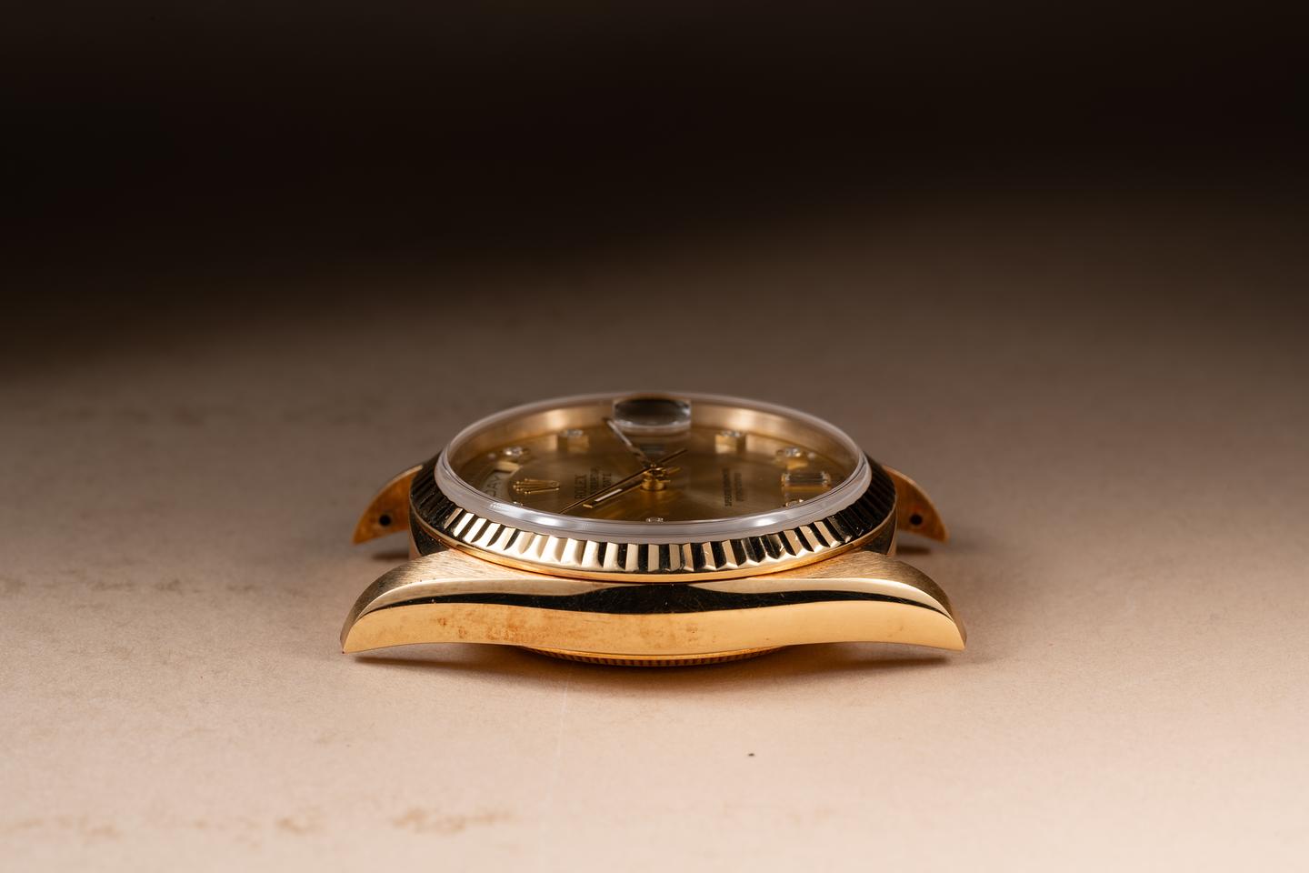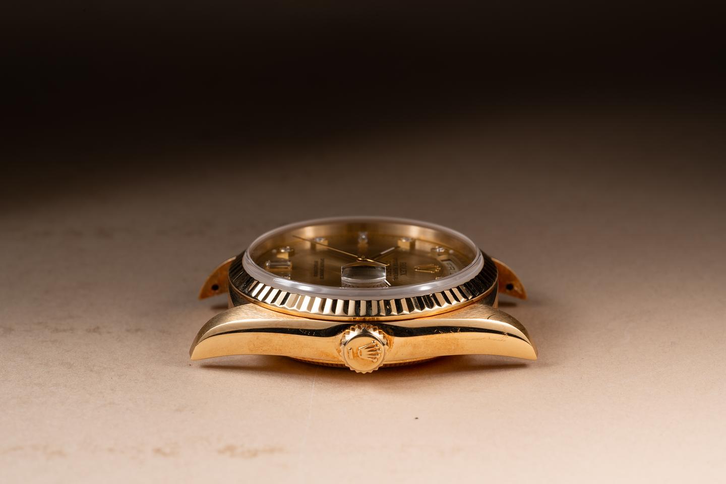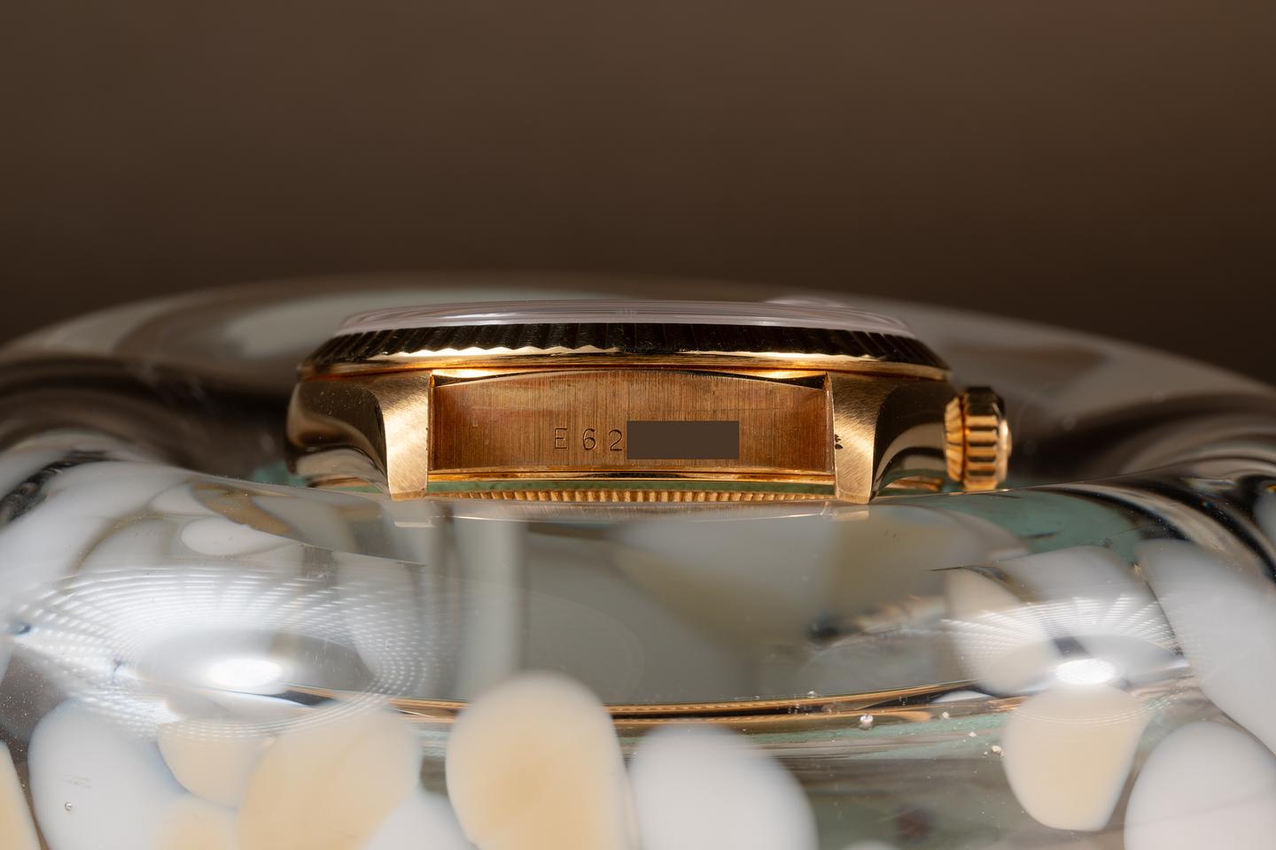 Case: The thick 18k yellow gold case is excellent showing some light wear from use. The 18k yellow gold fluted bezel is also in excellent condition showing