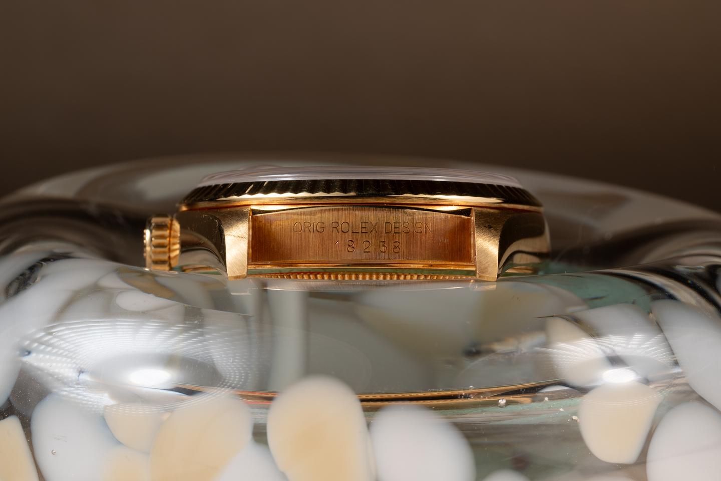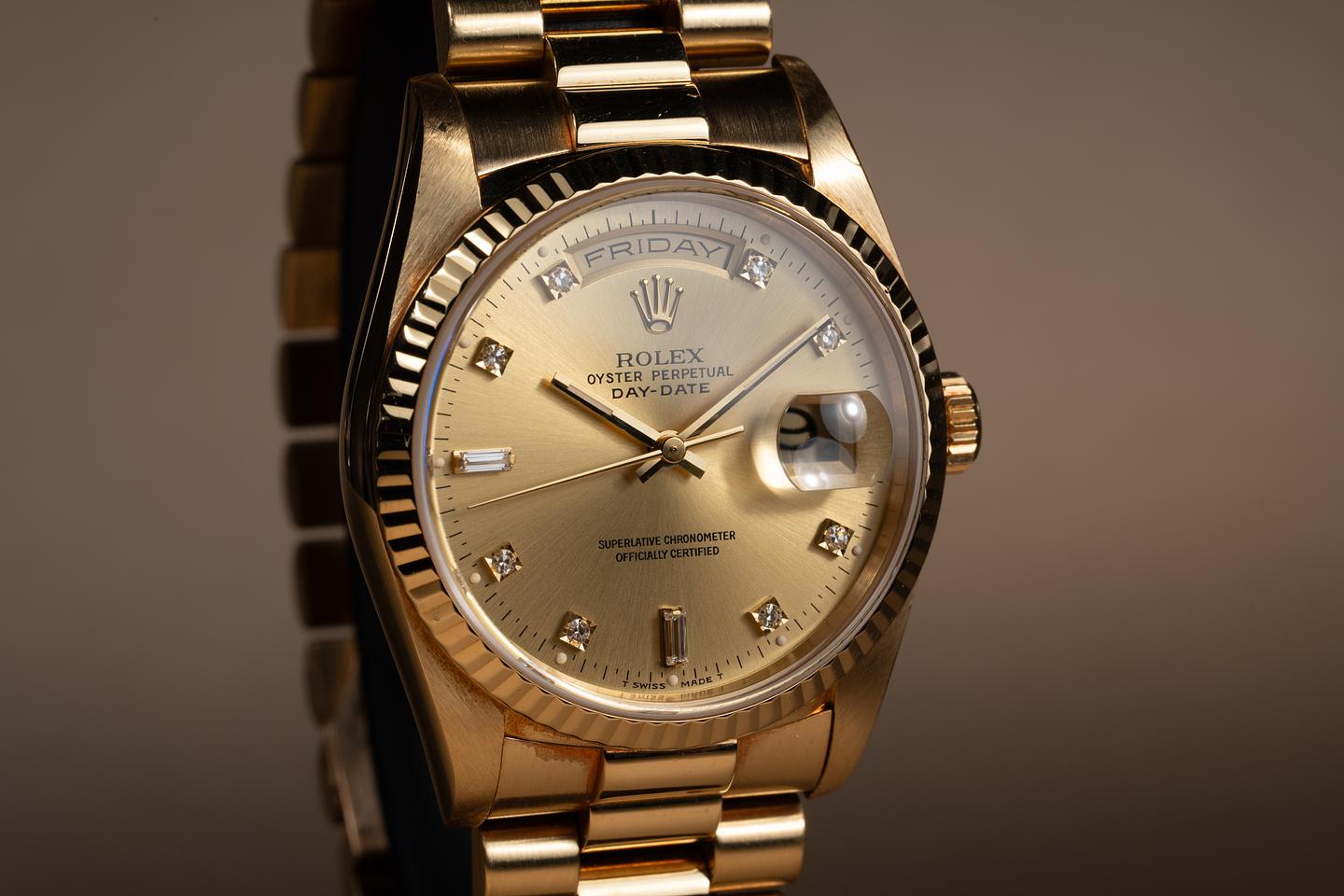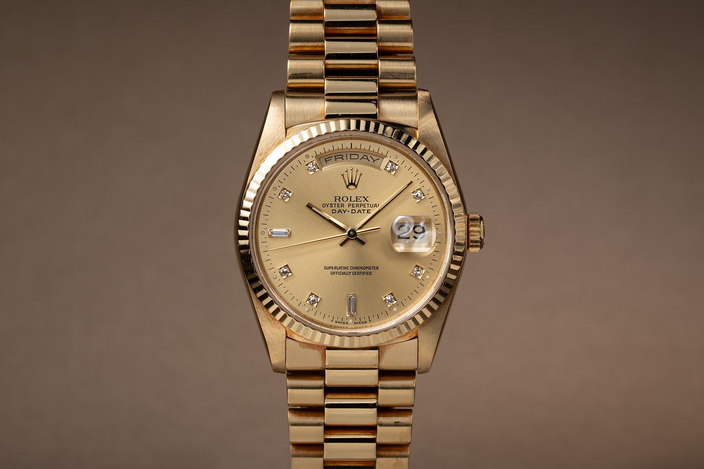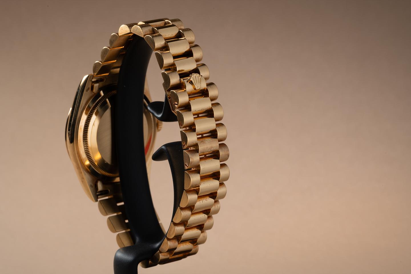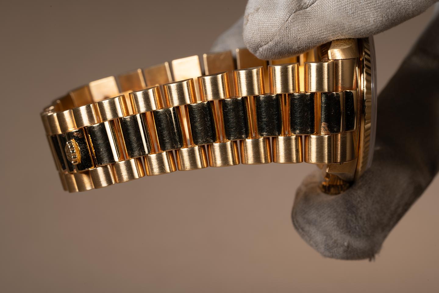 Bracelet: The 23 link 18K yellow gold President bracelet is excellent showing only light stretch for its age. The clasp is stamped with a matching 1990 date code.