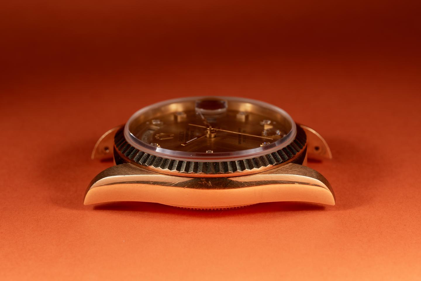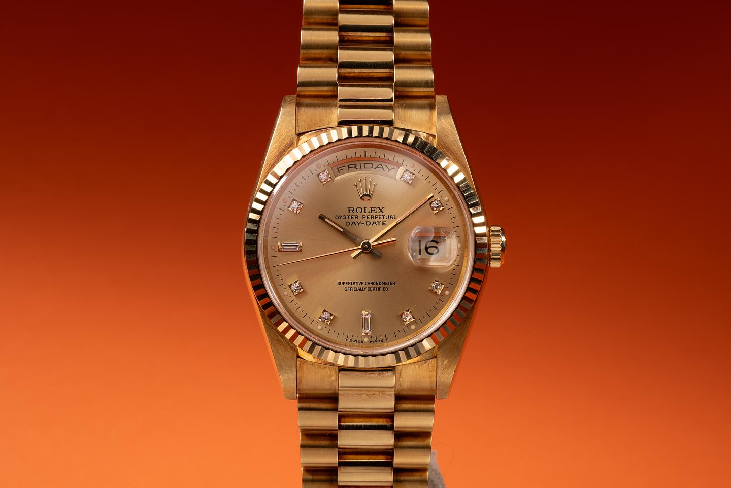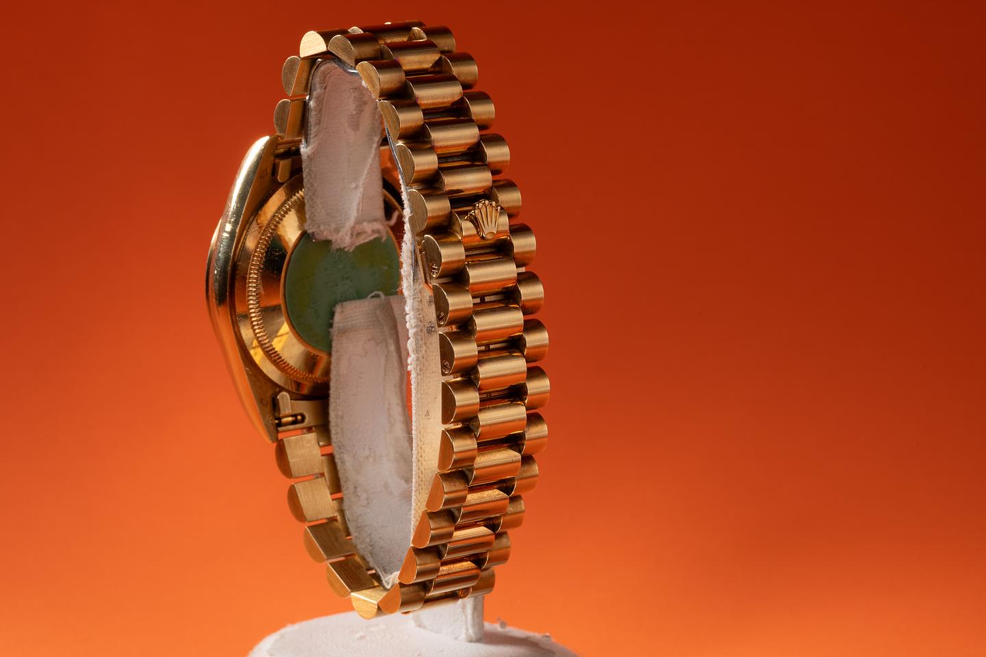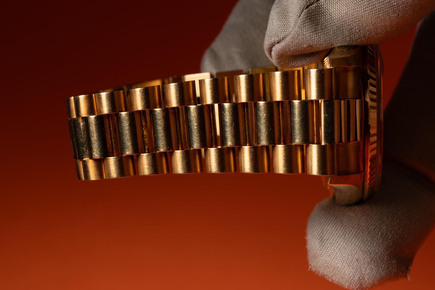 Bracelet: The 22 link 18K yellow gold President bracelet is excellent showing only very light stretch for its age. The clasp is stamped with a matching 1990 date code.