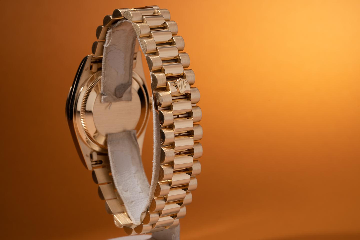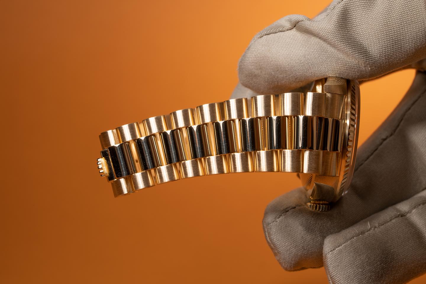 Bracelet: The 23 link 18k yellow gold president bracelet is also in excellent condition showing only very light stretch for its age.