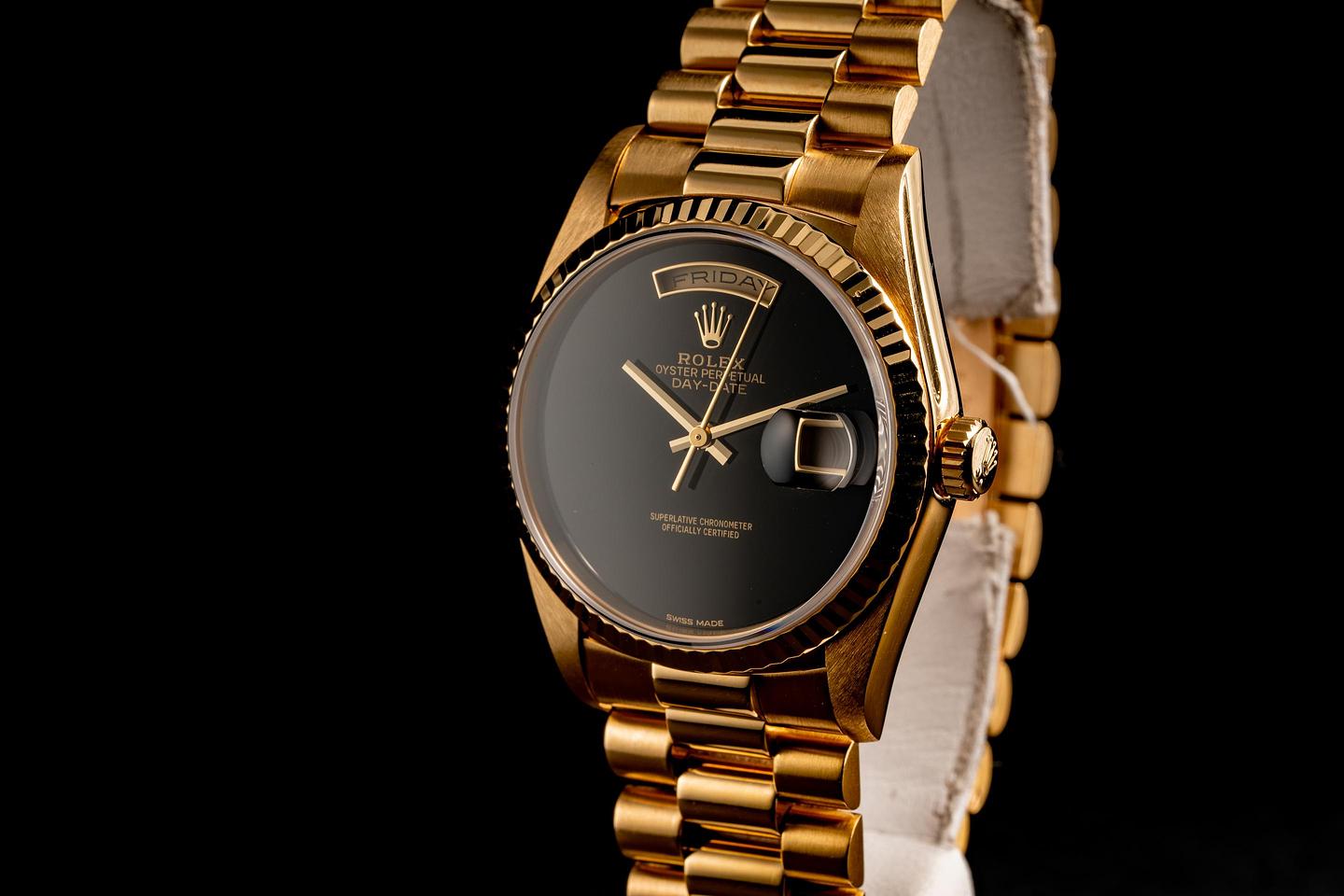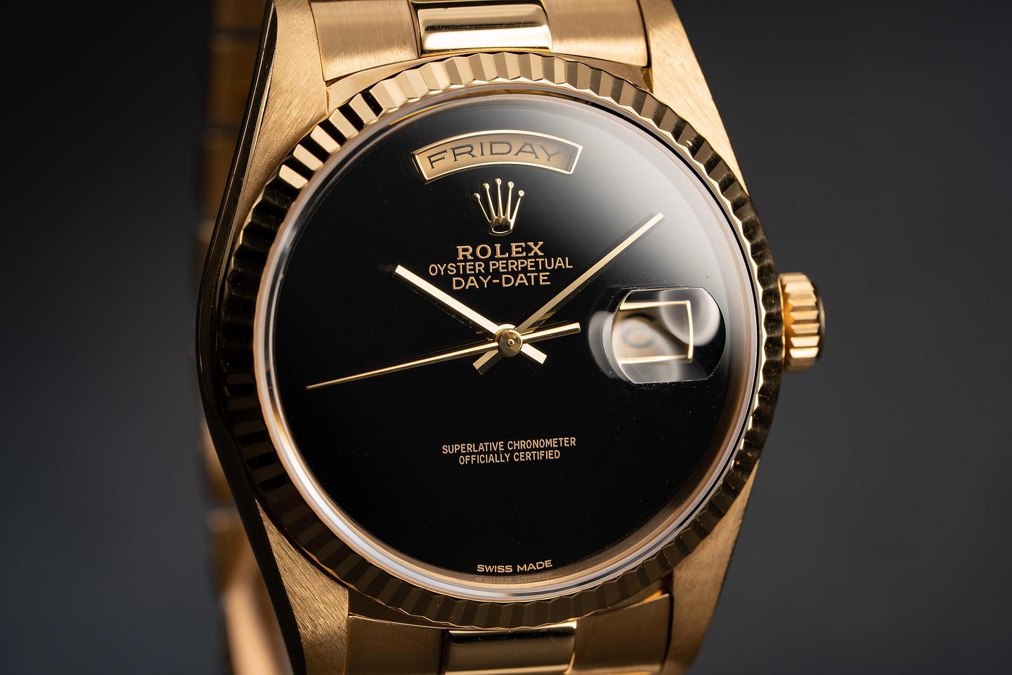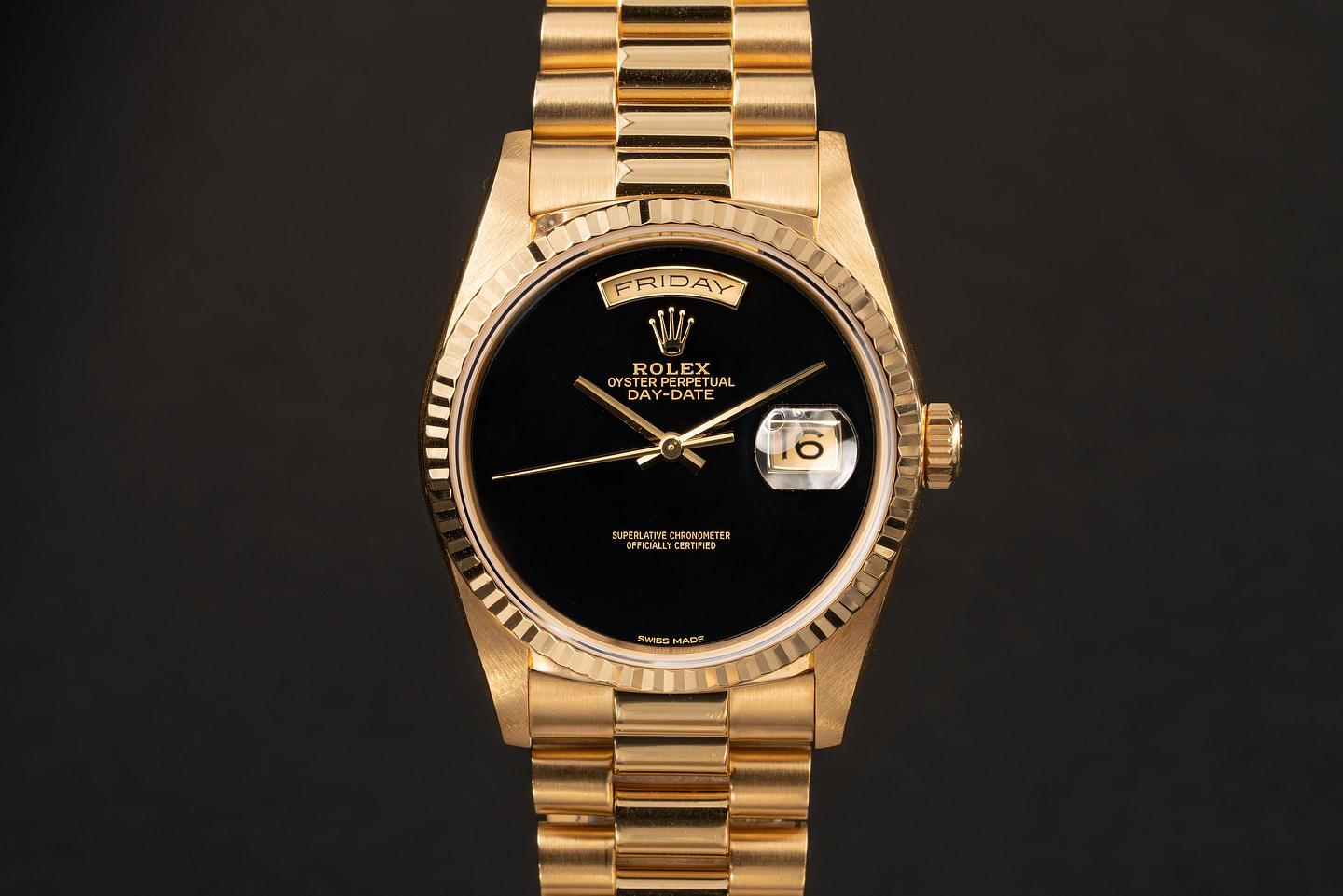 Dial: The black onyx stone dial is excellent with no wear, chipping, or cracking present. The 18k yellow gold factory none lume hands are matching.