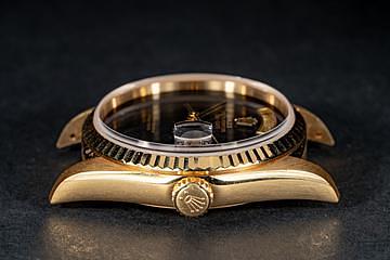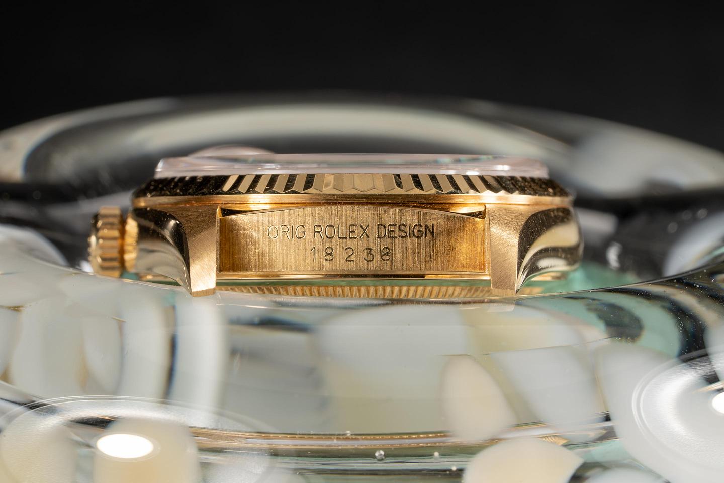 Case: The thick and even 18k yellow gold case is excellent showing only light wear from use. The 18k yellow gold fluted bezel is sharp and shows only light wear from use.