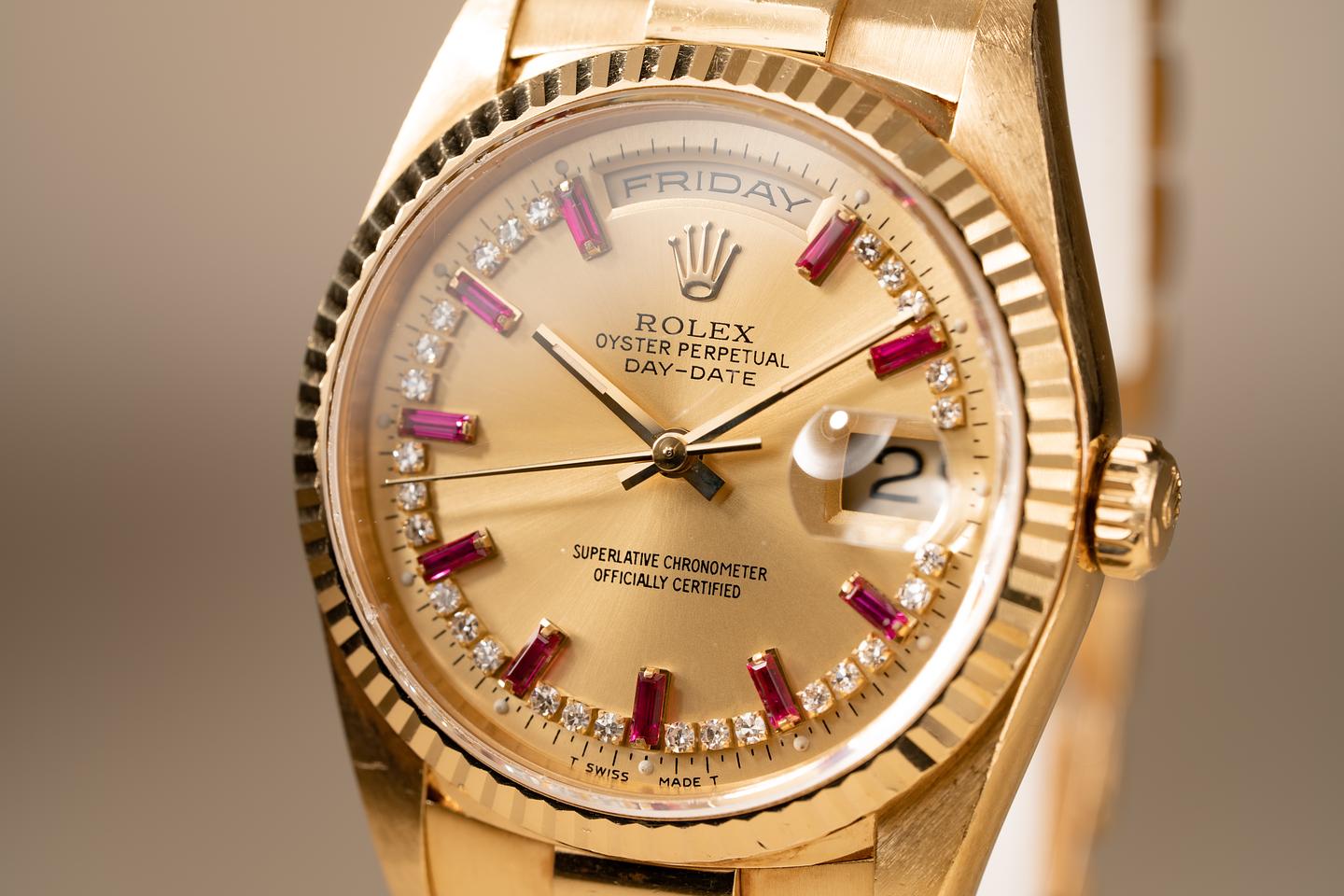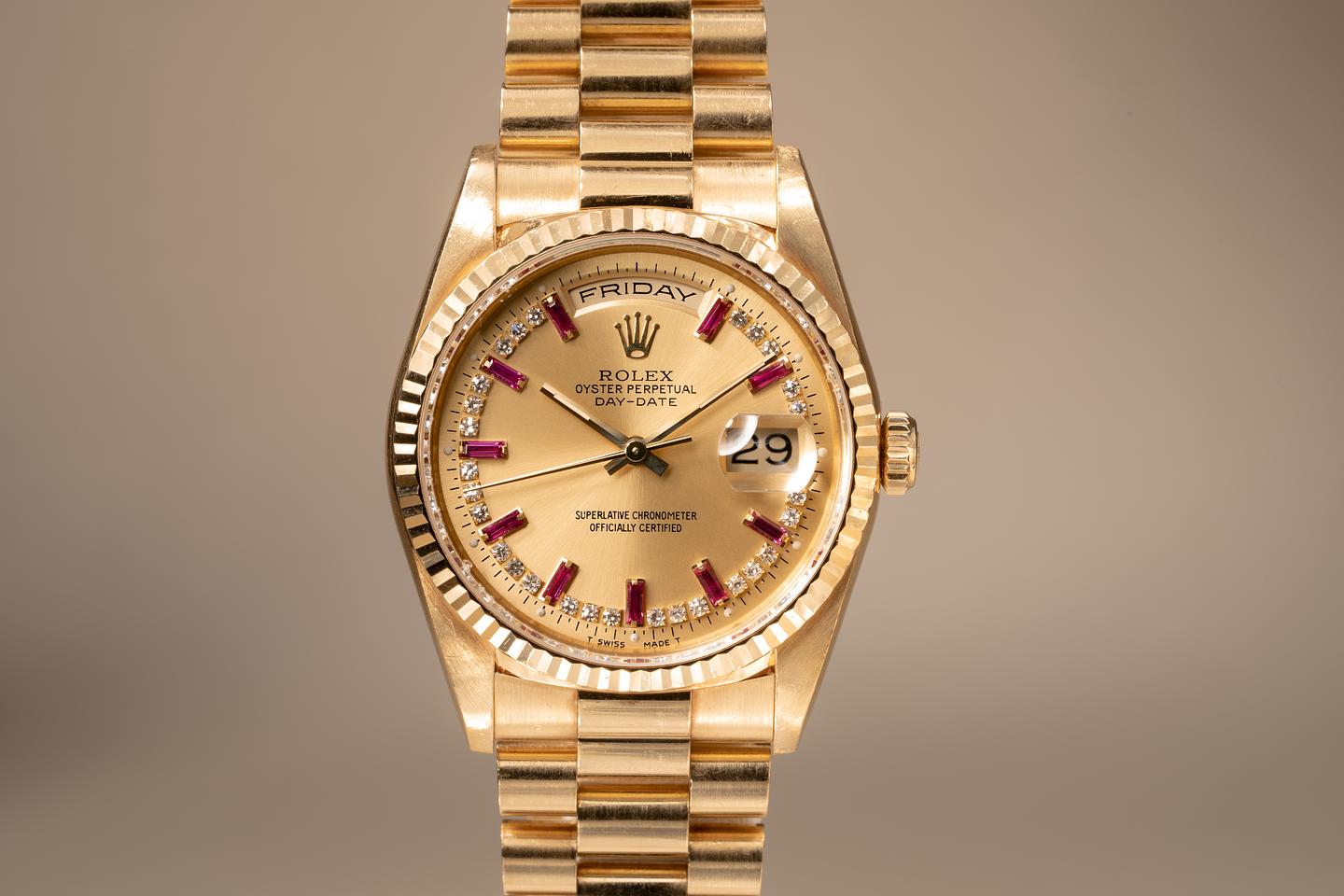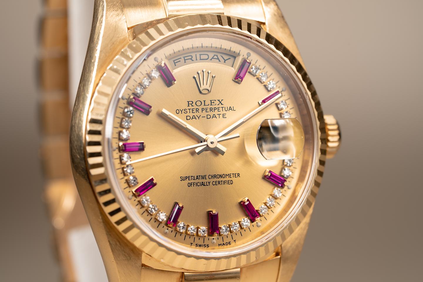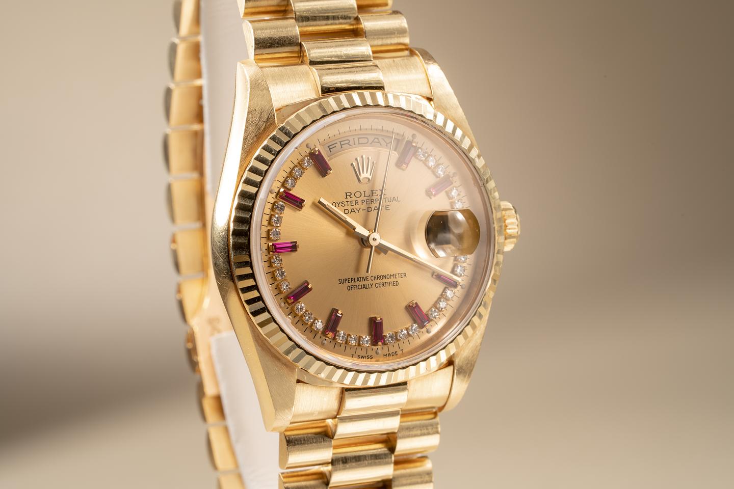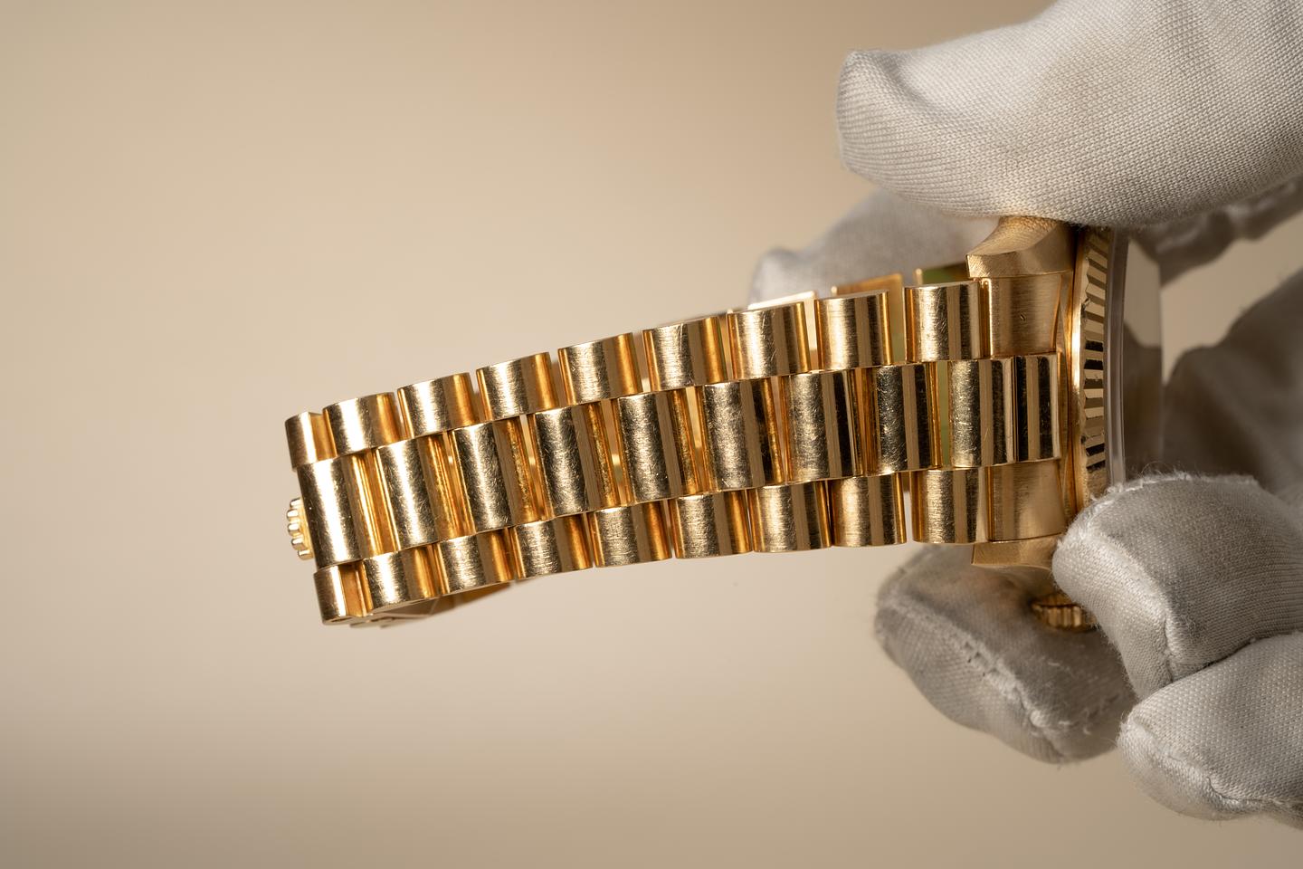 Bracelet: The 23 link 18k yellow gold president bracelet is excellent and shows average stretch for its age.