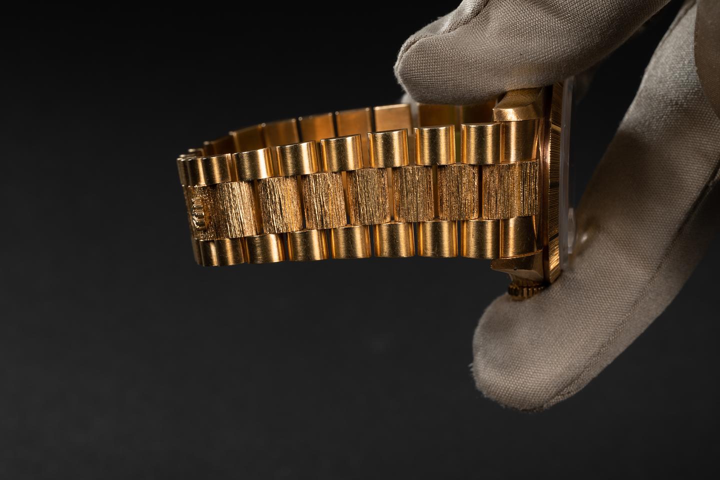 Bracelet: The 21 link 18K yellow gold President bark bracelet is excellent showing only very light stretch for its age. The clasp is stamped with a 1991 date code.
