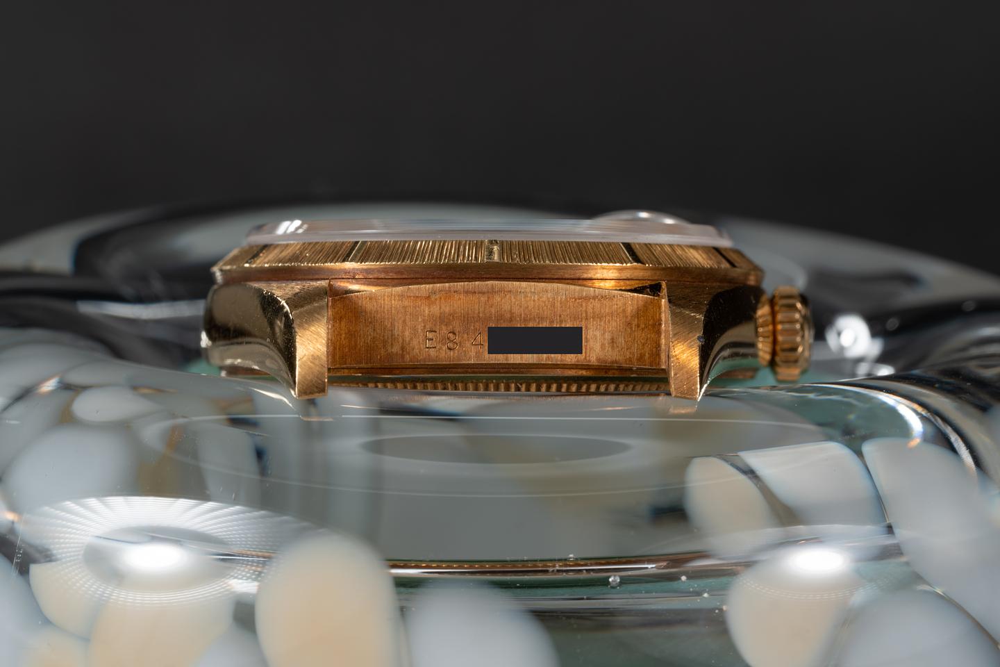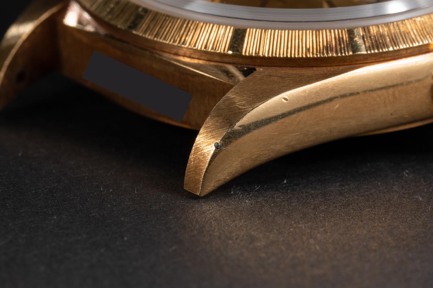 Case: The thick and even 18k yellow gold case appears to be unpolished showing only light wear from use. There is a very tiny spot of metal on the edge of the 5 o'clock lug mostly likely from a previous owner welding while wearing the watch. The sharp 18k yellow gold bark bezel is also in excellent condition showing only light wear from use.