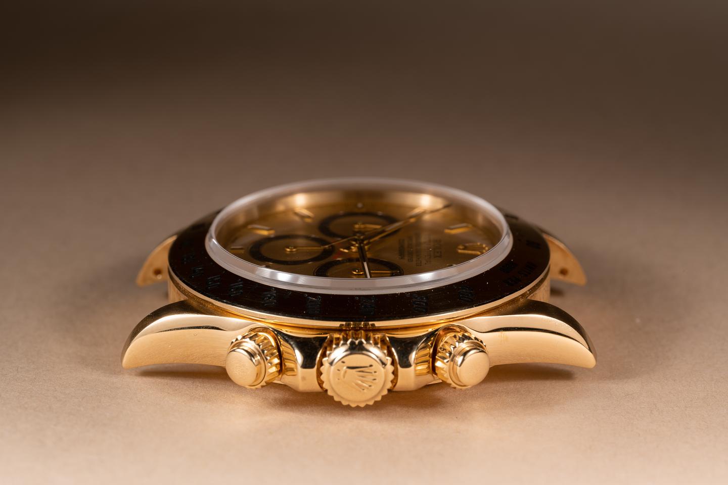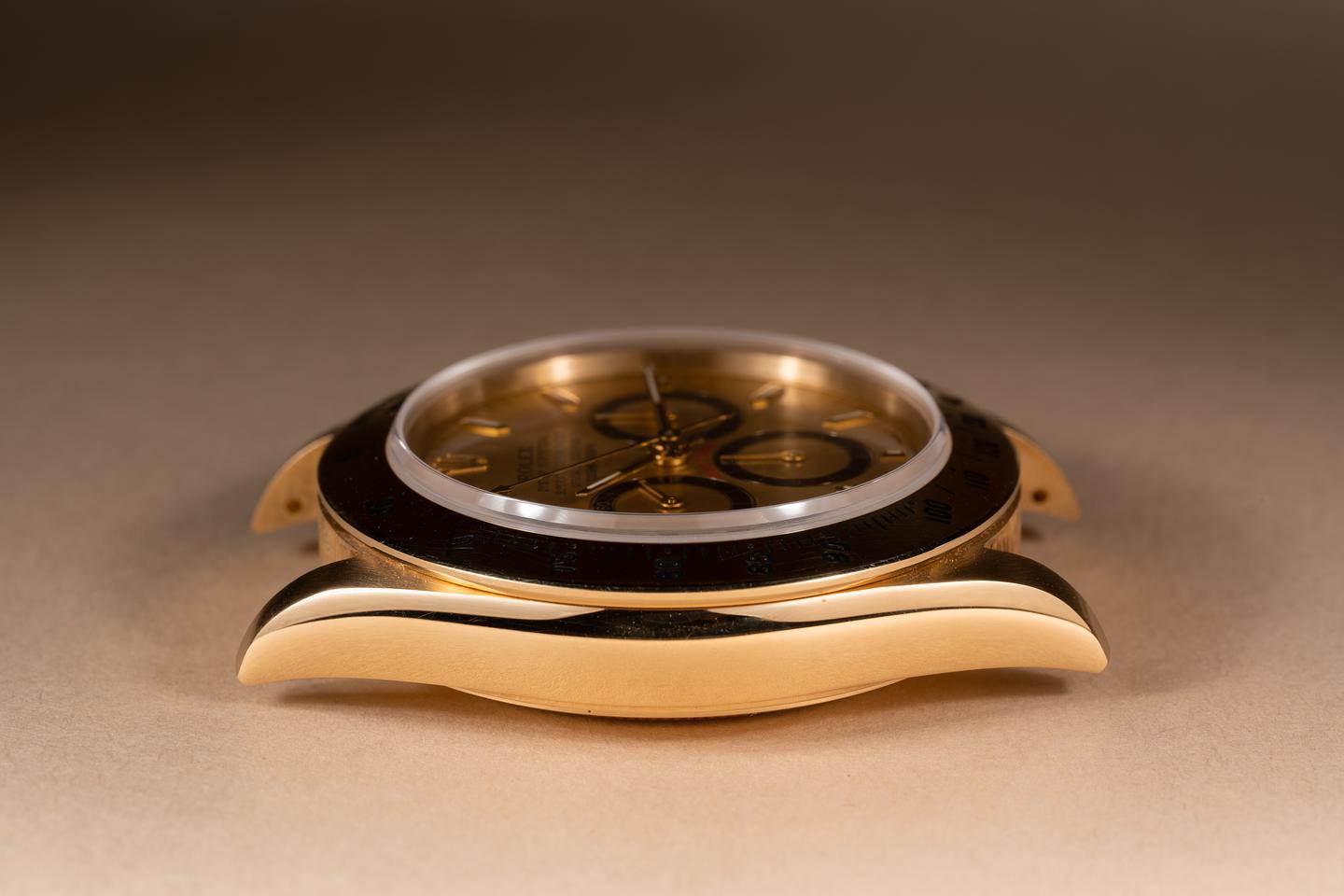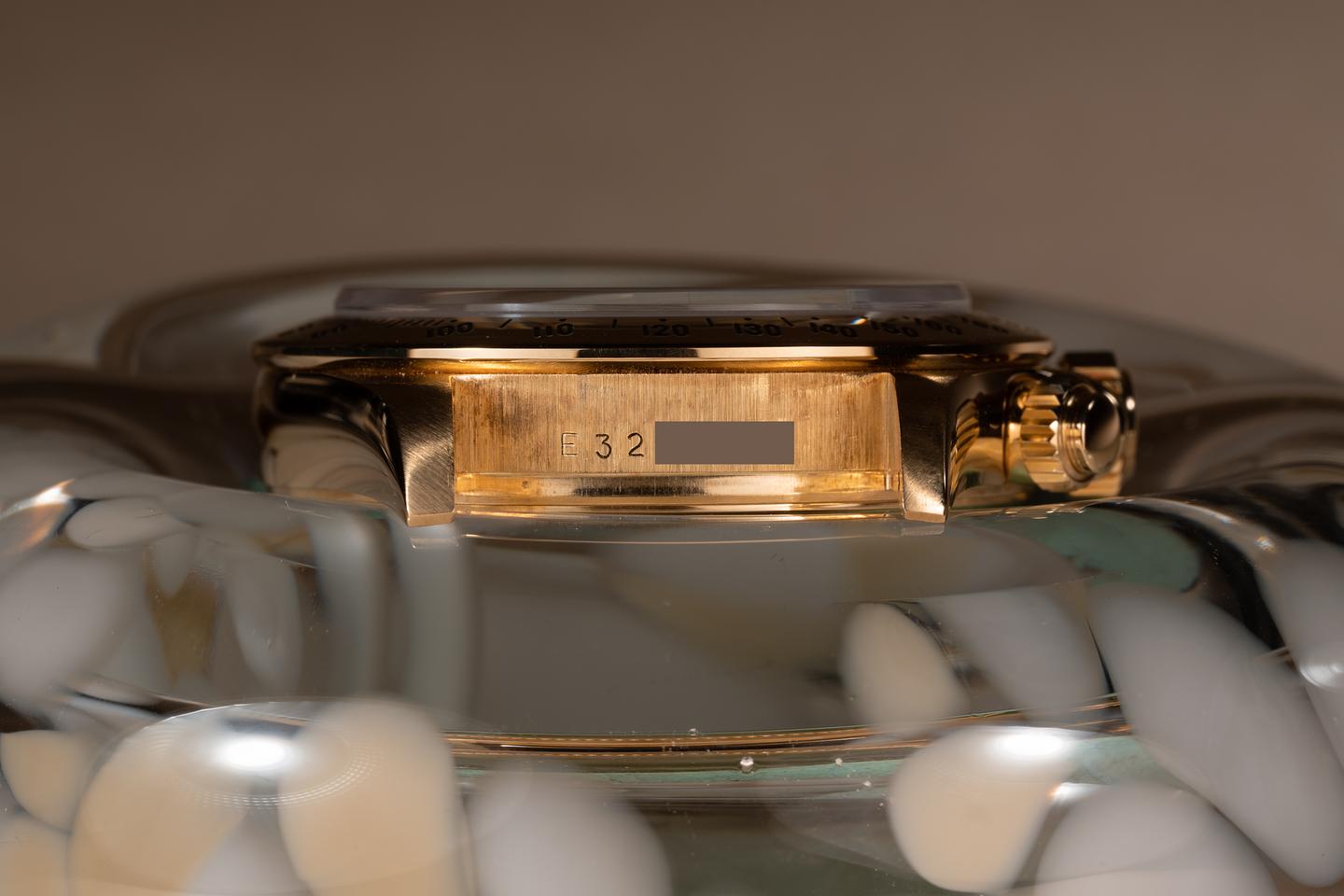 Case: The previously polished 18k yellow gold case is excellent showing only very light wear from use. The previously polished 28k yellow gold bezel is also excellent showing only extremely light wear from use.