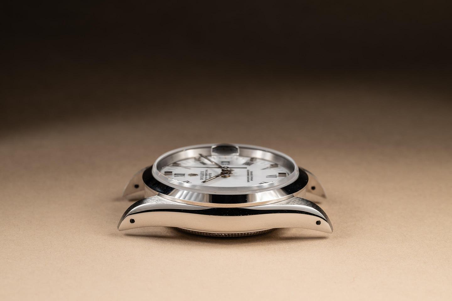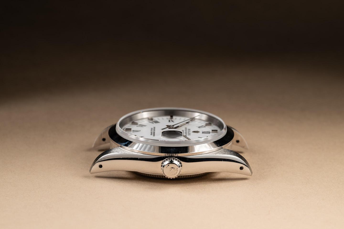 Dial: The white Roman numeral index dial is excellent, showing no visible wear. The lume has aged to a warm creamy hue, and the hands match perfectly.