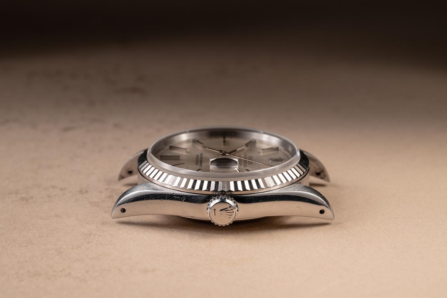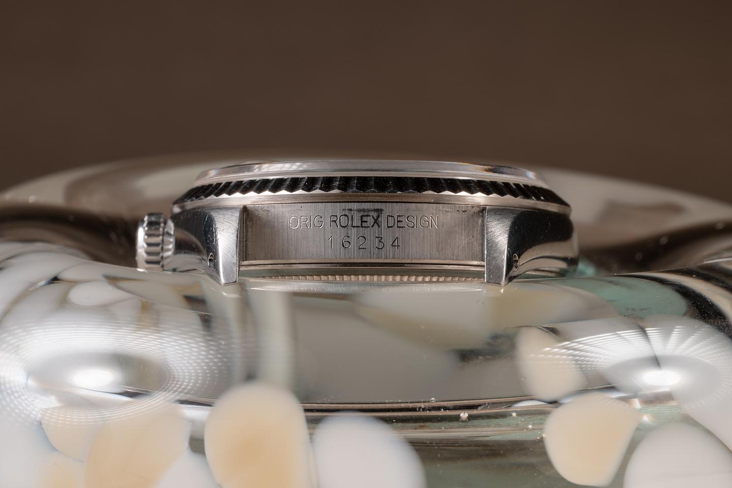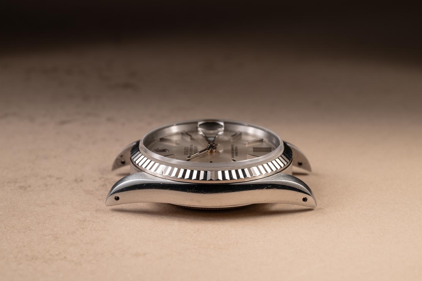 Case: The sharp 36mm case is excellent, showing only light wear from use. The sharp 18K white gold fluted bezel is also in excellent condition, showing only light wear from use.