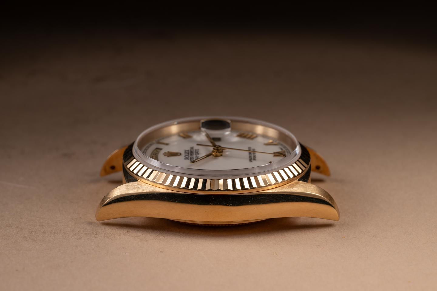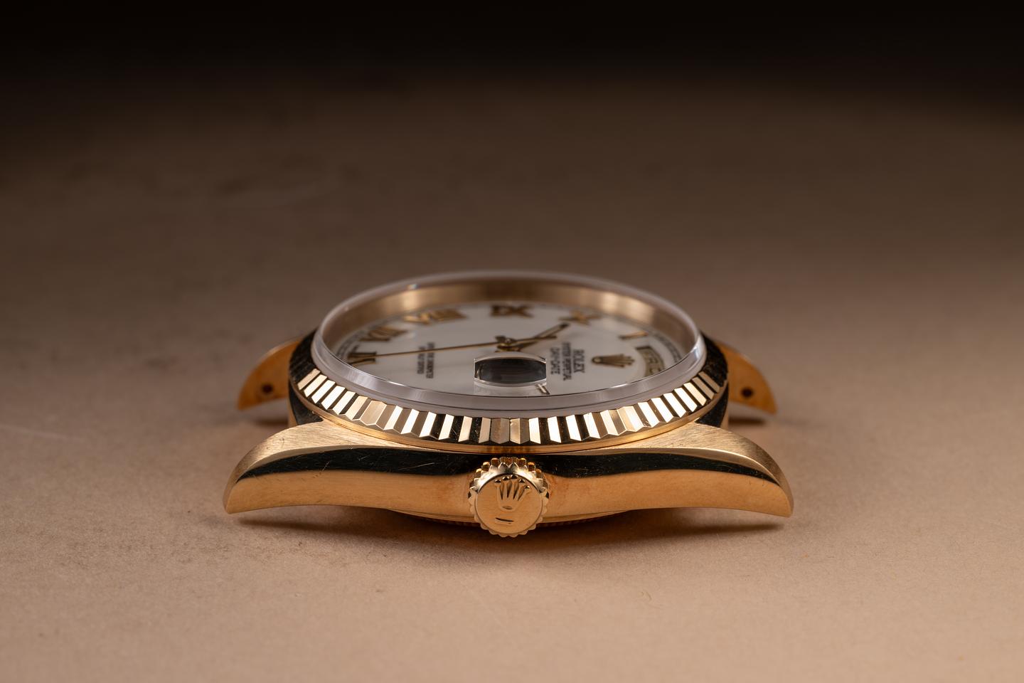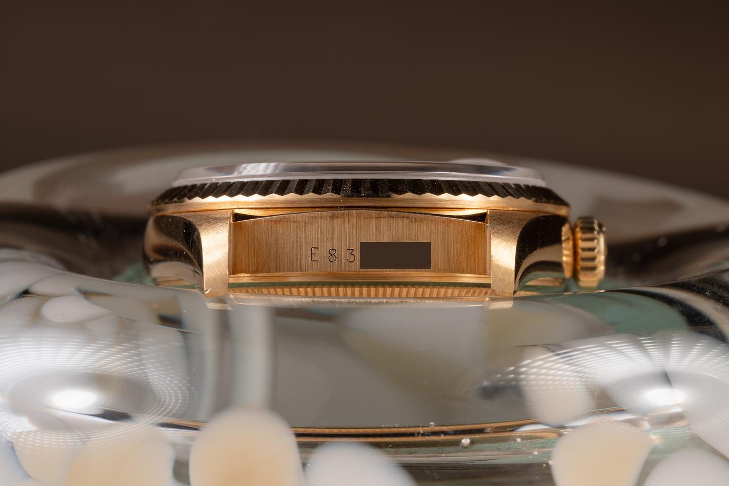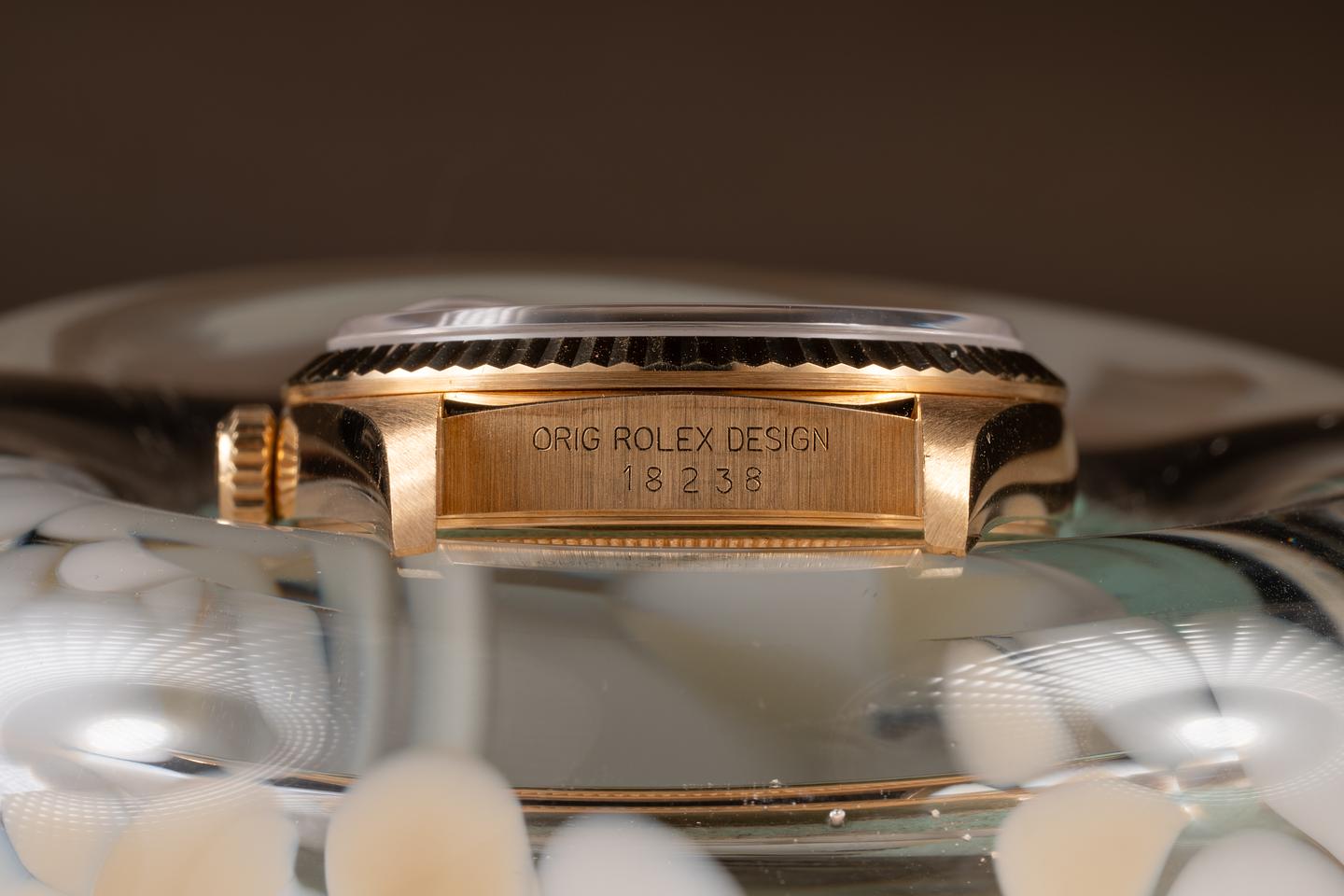 Case: The sharp 36mm 18K yellow gold case is excellent, showing only very light wear from use. The sharp 18K yellow gold fluted bezel is also in excellent condition, showing only very light wear from use.