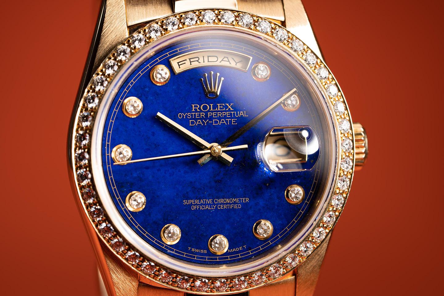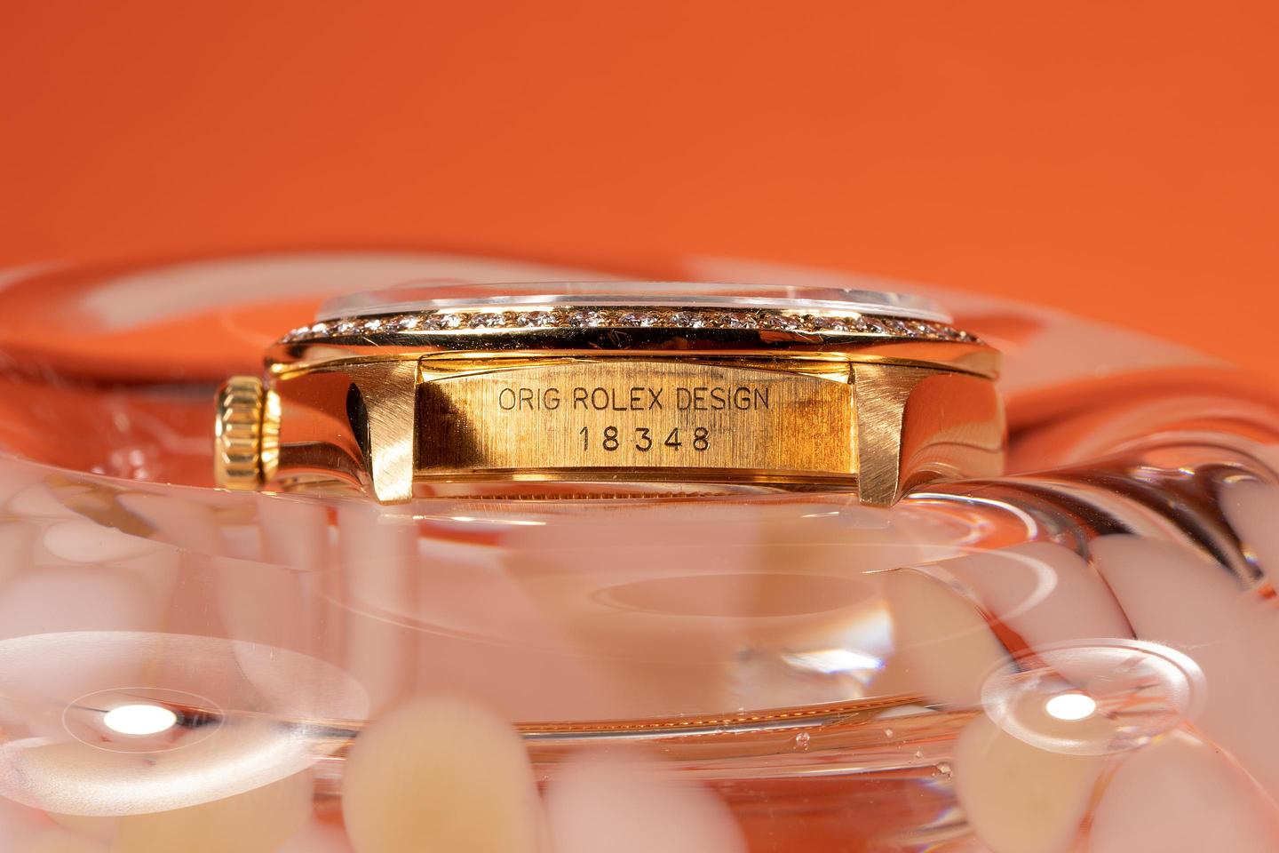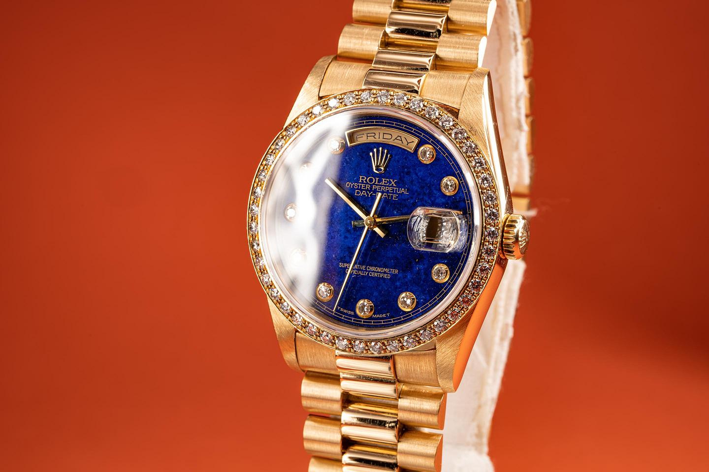 Notes: A 18348 with a Lapis pinball dial is already an exceptionally rare sight, and factory diamond bezel on this piece adds yet another layer of rarity to this stunning watch.