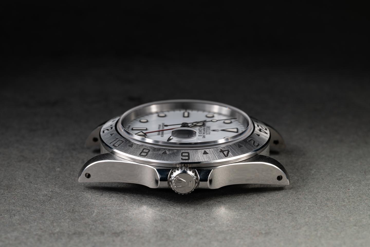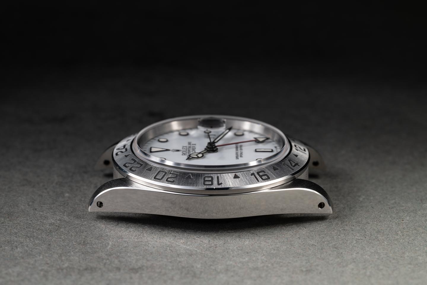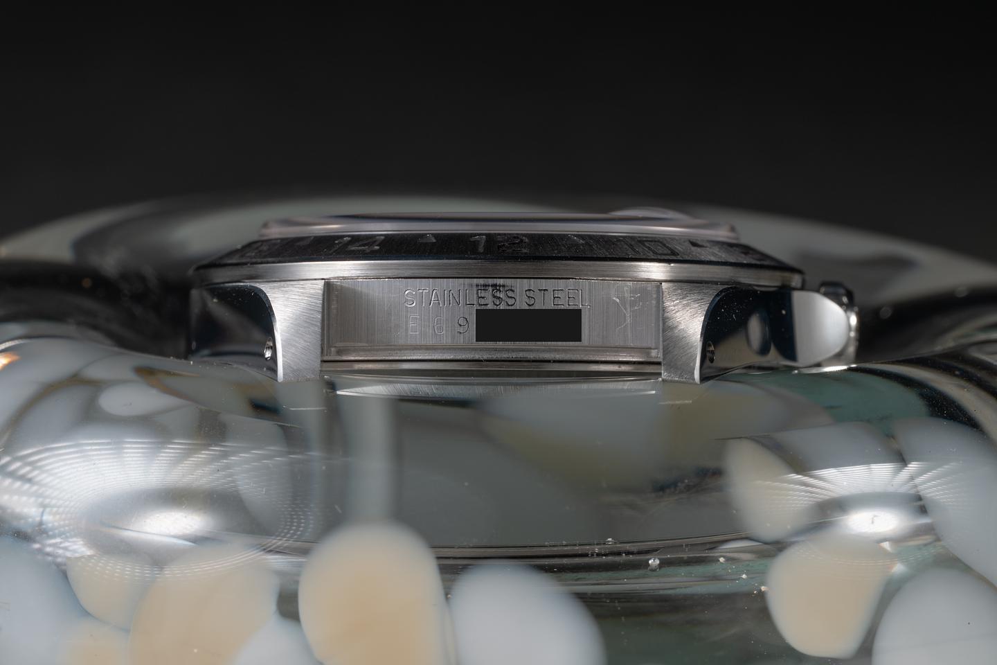 Case: The recently polished case is excellent, showing sharp, prominent bevels and only very light wear. The stainless bezel is also in excellent condition, showing a sharp, well-defined sunburst finish and only very light wear..