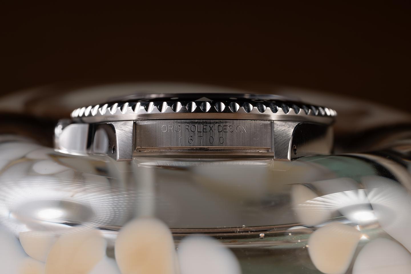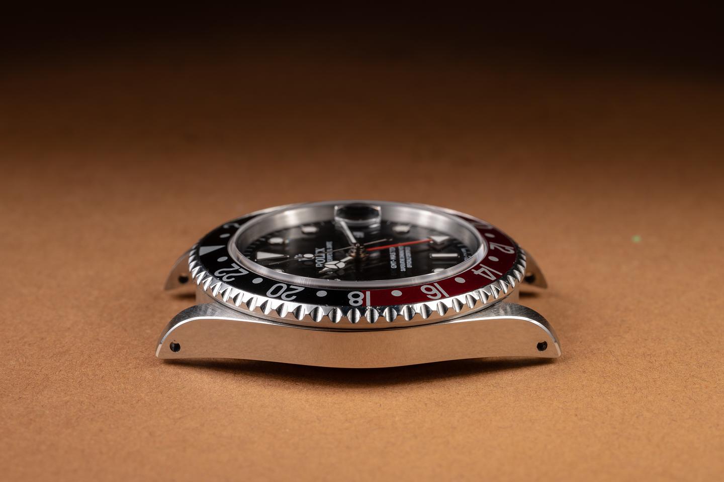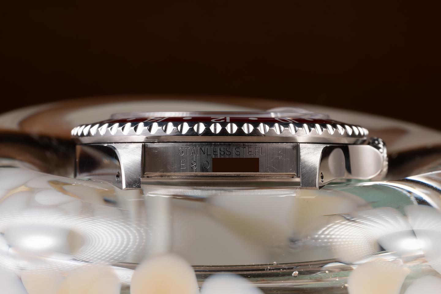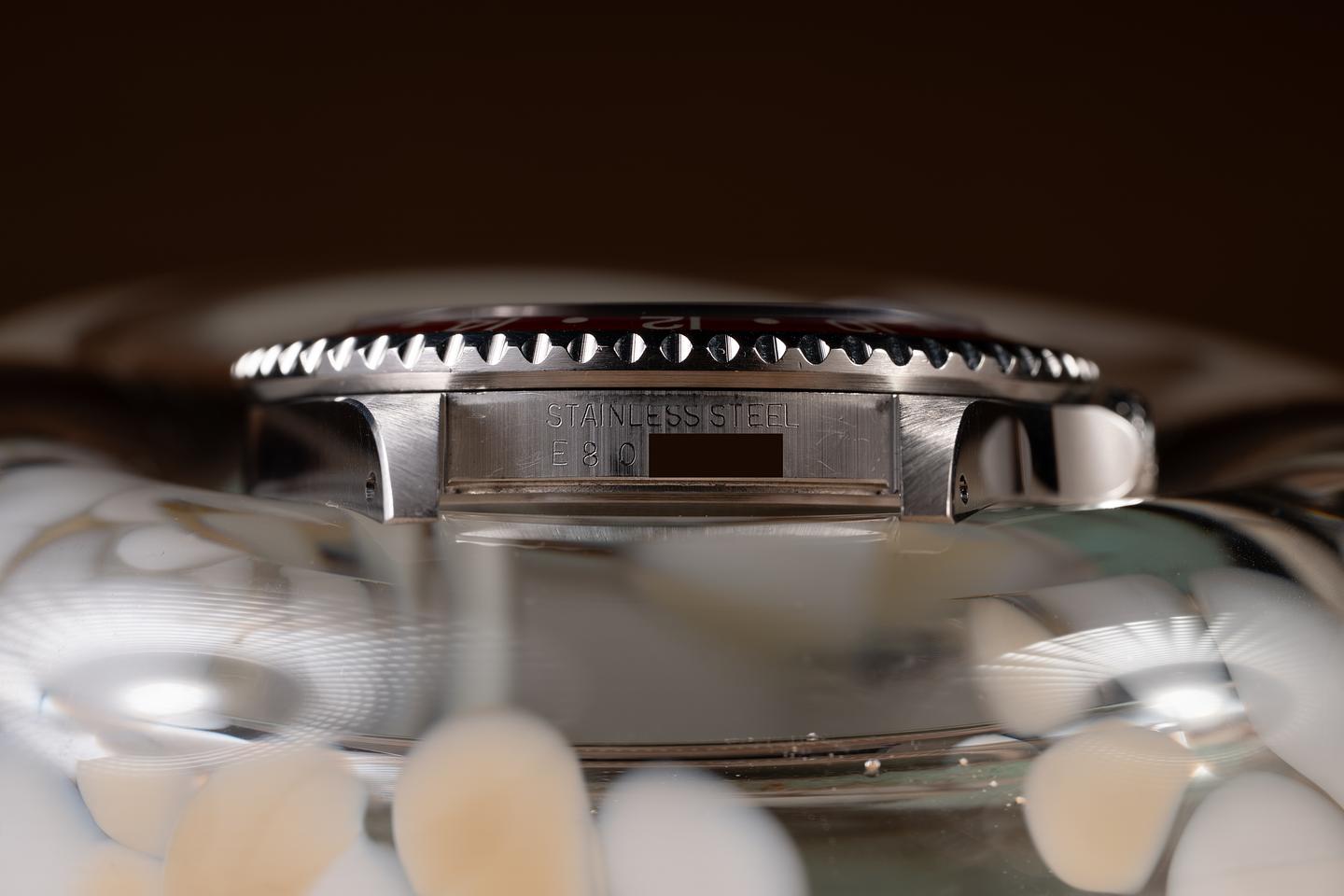 Case: The recently polished case is excellent, showing sharp, prominent bevels and only very light wear from use. The black and red "Coke bezel insert is also in excellent condition, showing some light fading to the red portion of the insert.