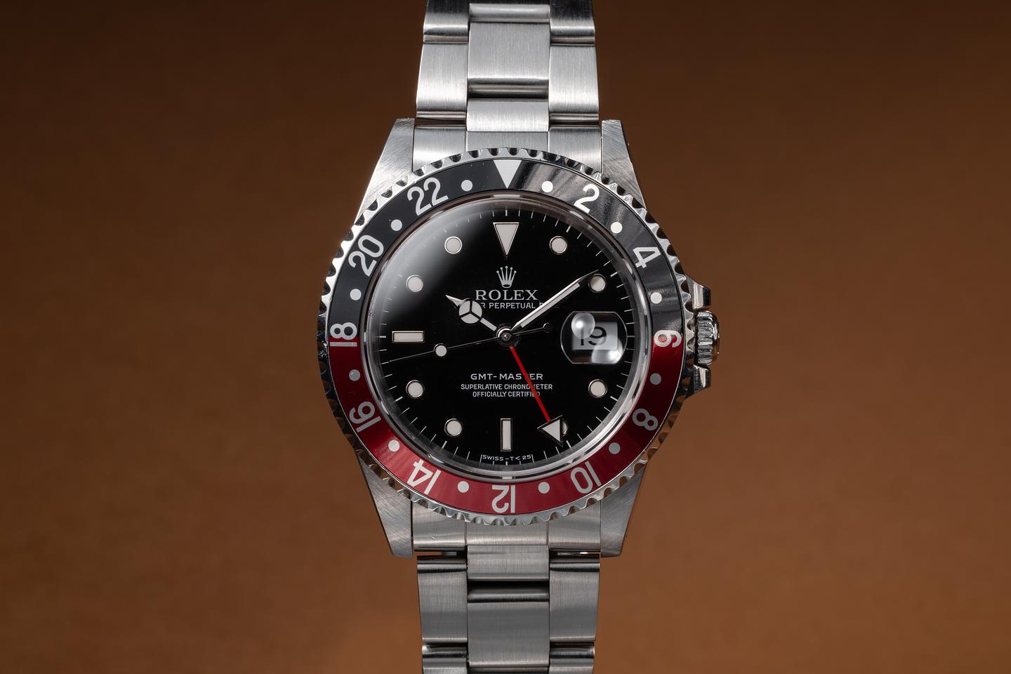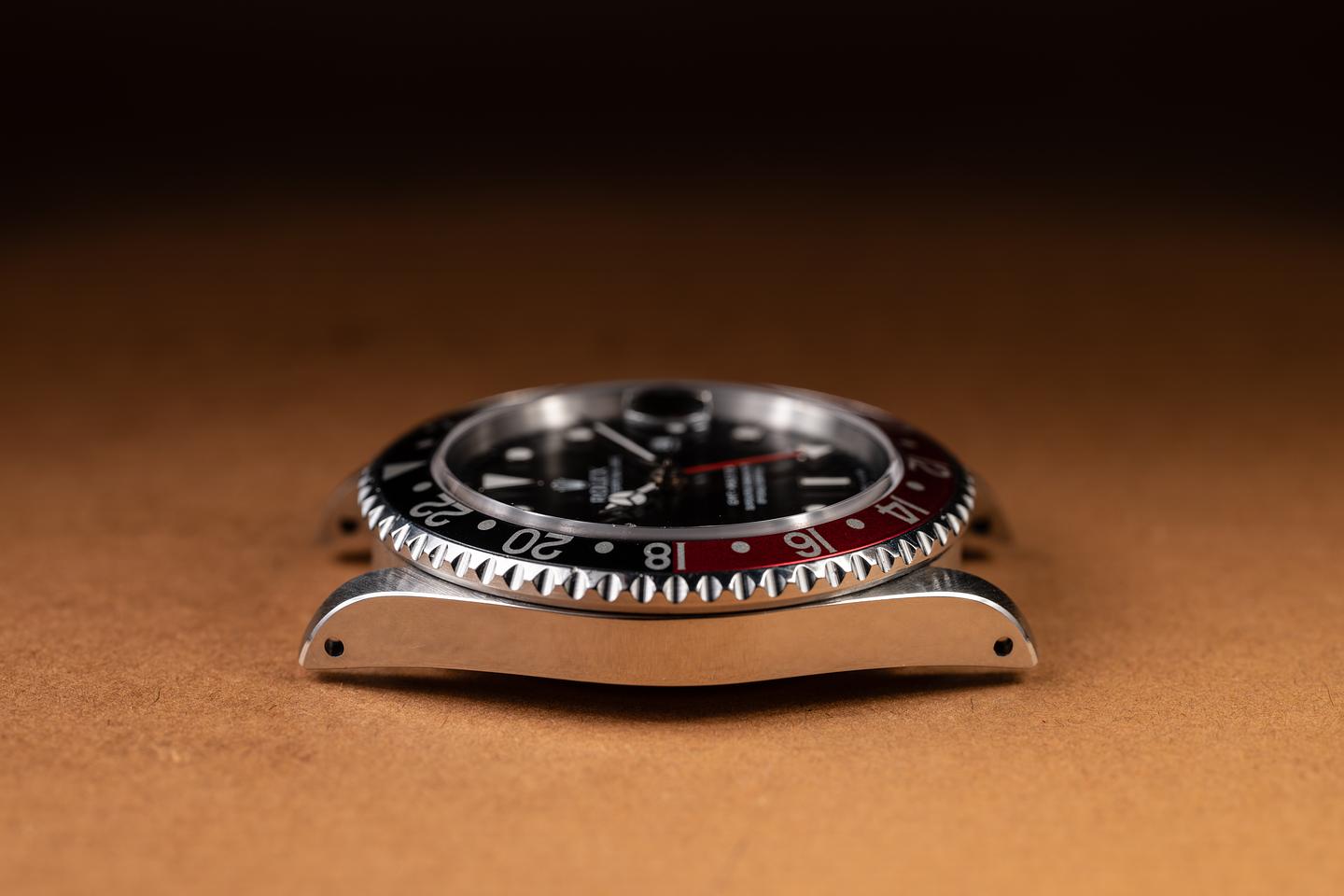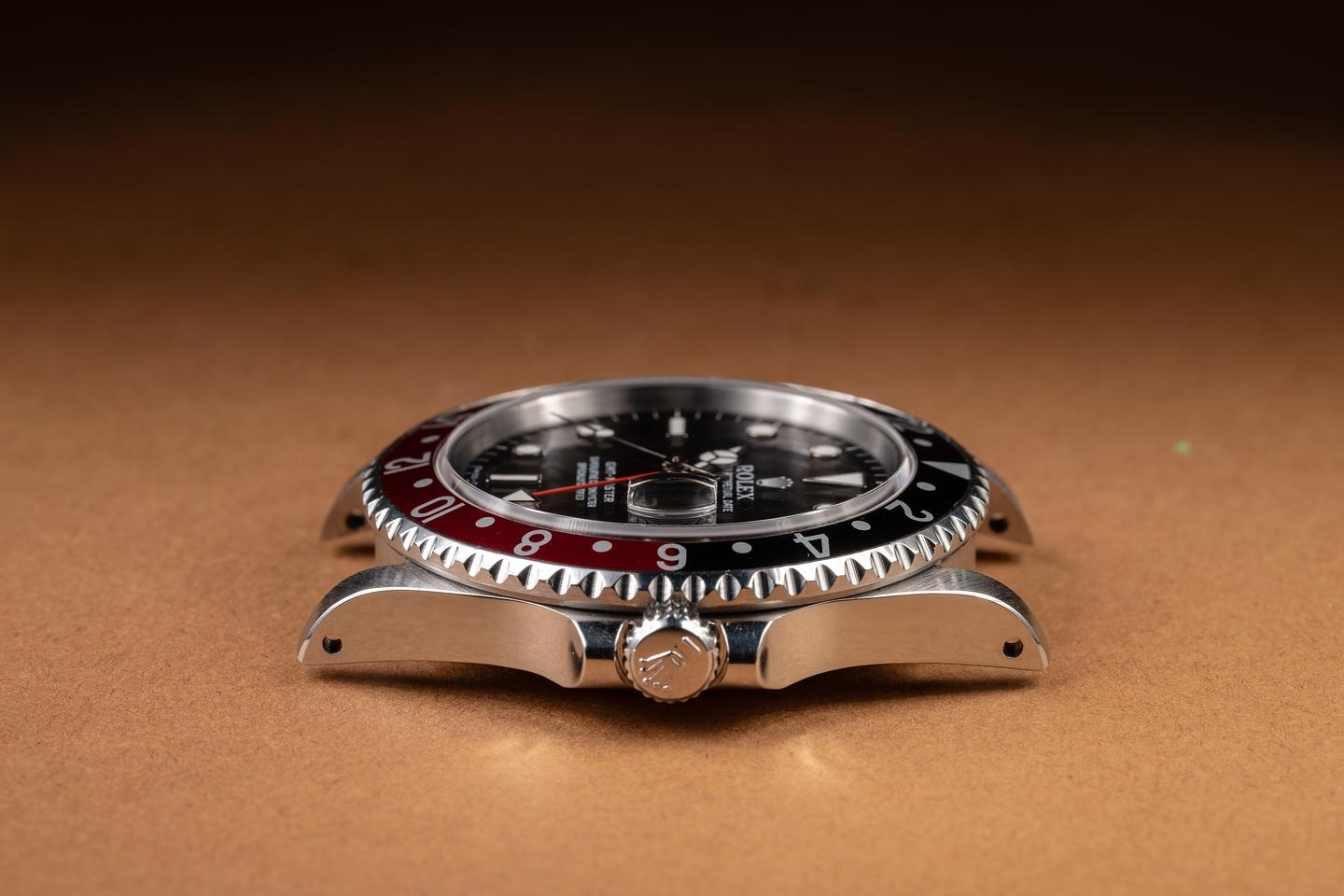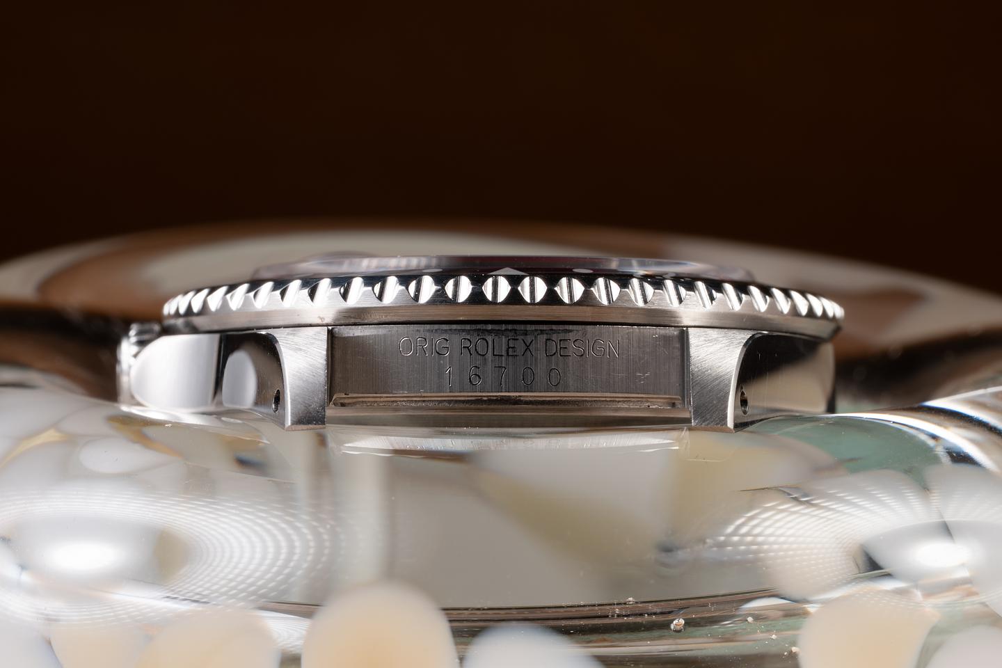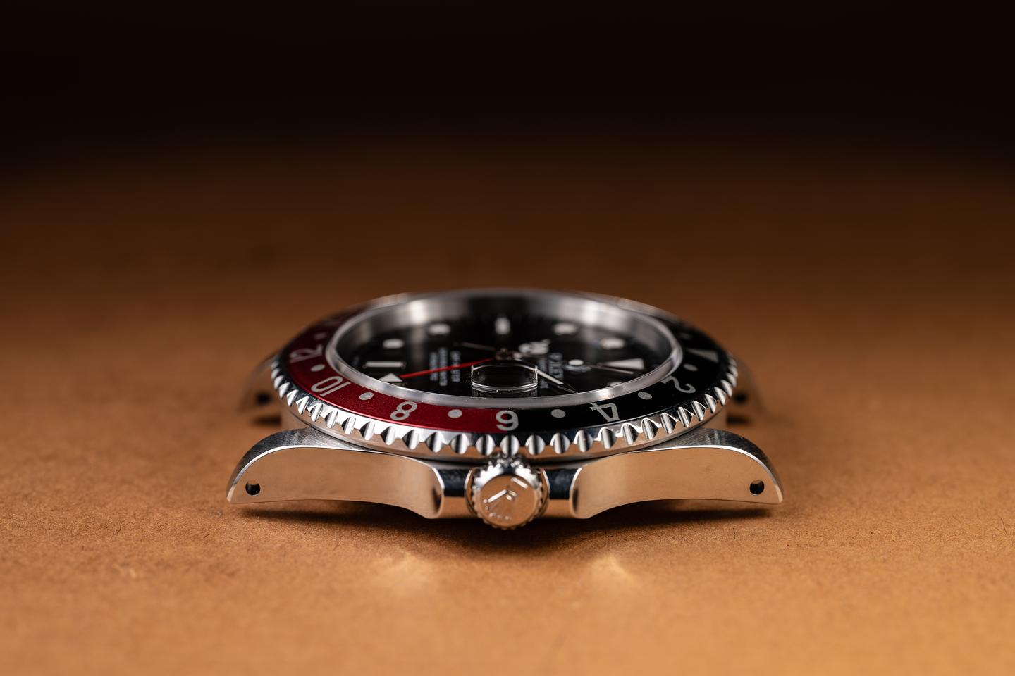 Case: The recently polished case is excellent, showing sharp, prominent bevels and only very light wear from use. The black and red "Coke bezel insert is also in excellent condition, showing some light fading to the red portion of the insert.