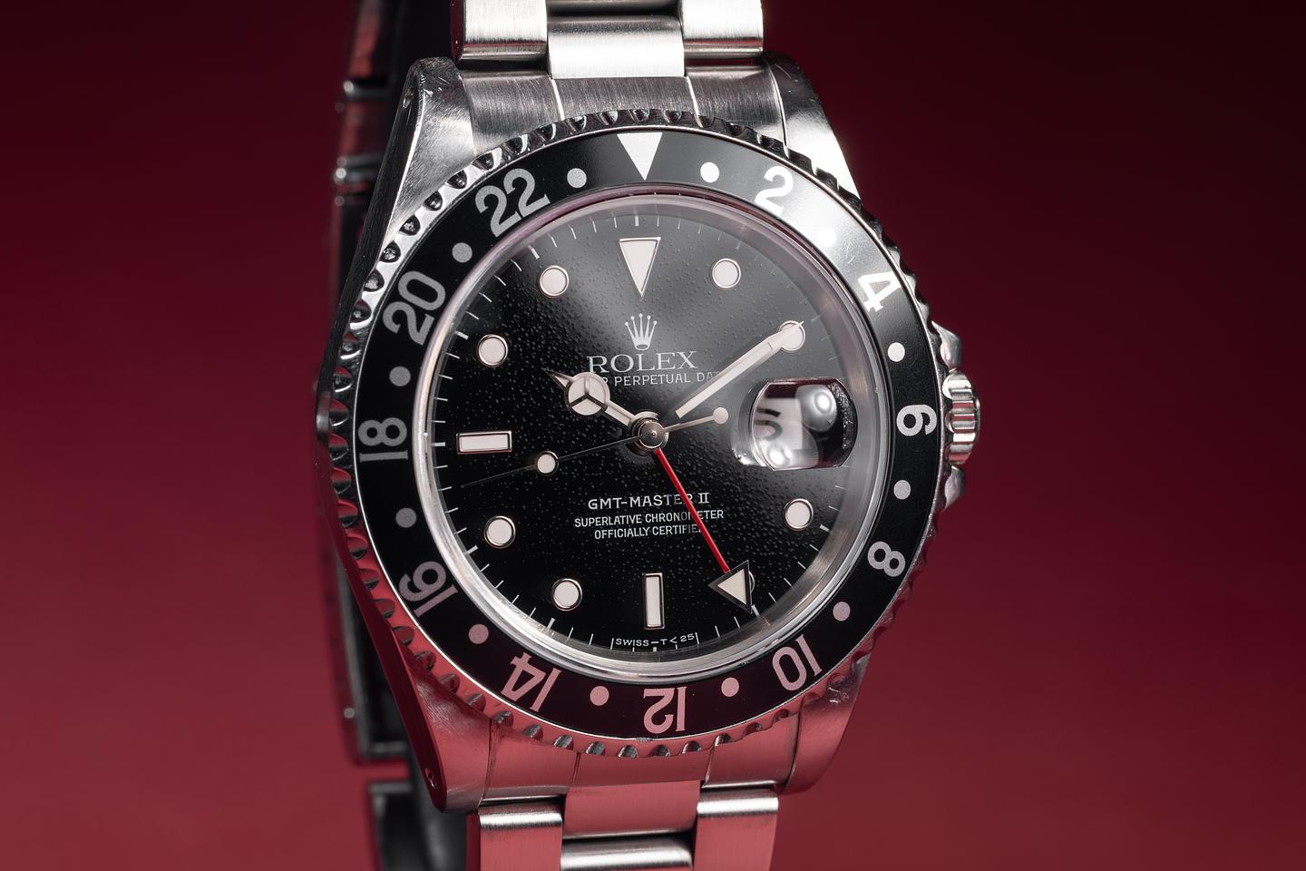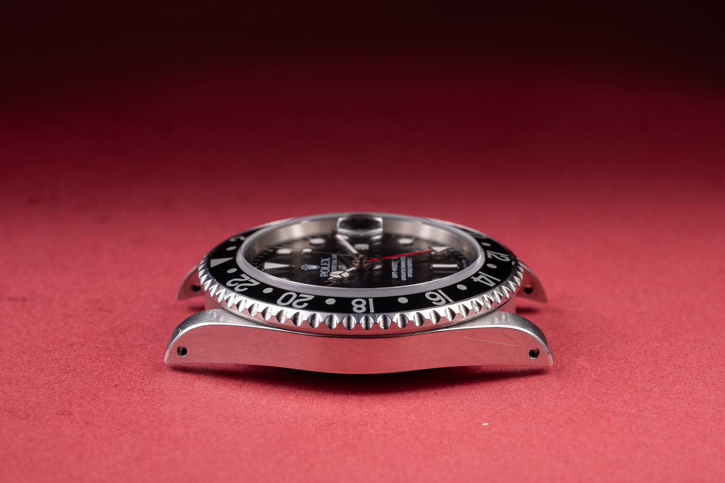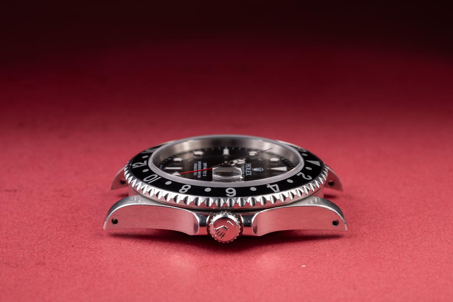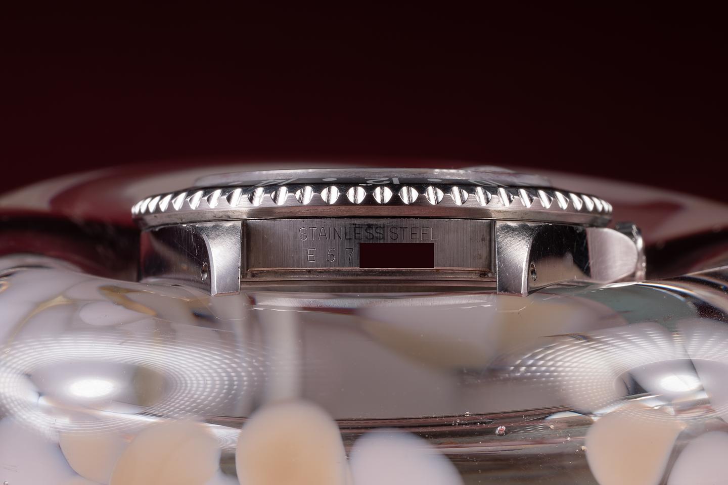 Case: The unpolished case is excellent, showing sharp, prominent bevels and light to average wear from use. The black bezel insert is also in excellent condition, showing only light wear from use.
