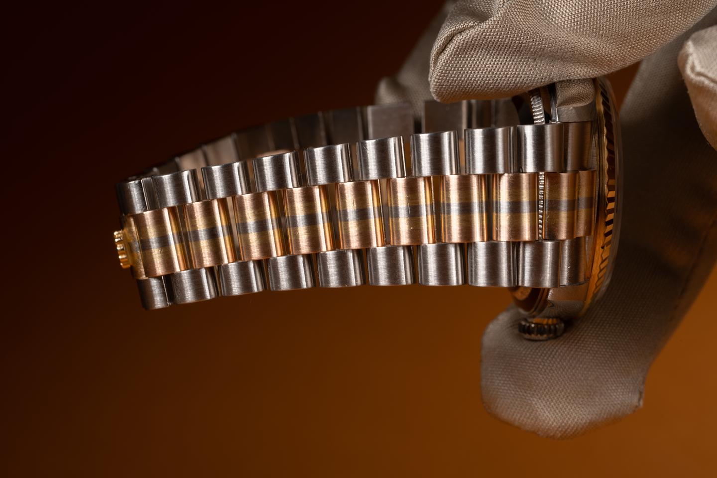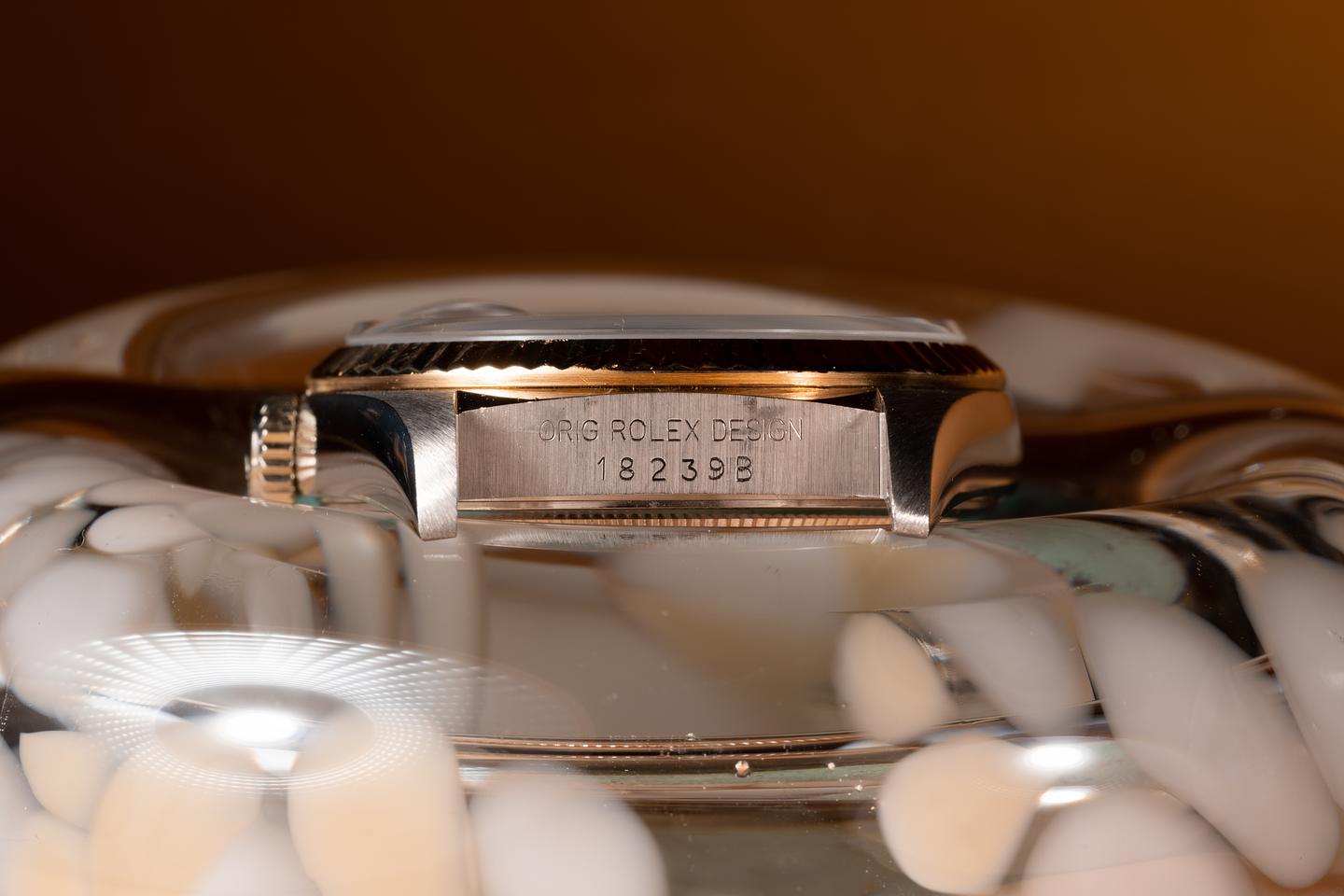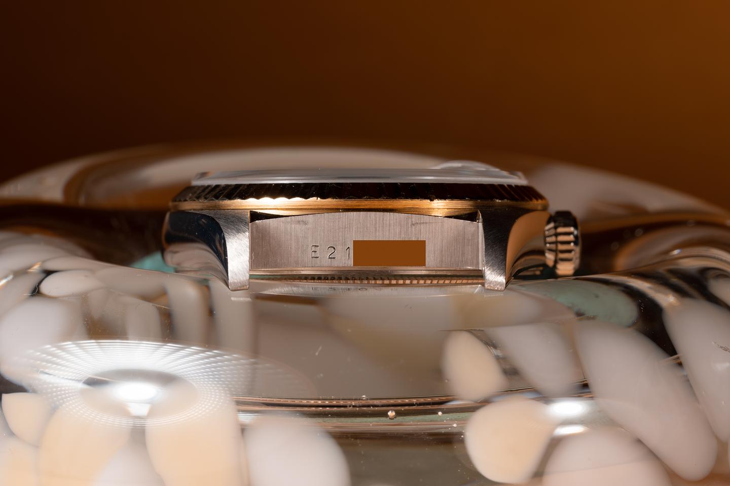 Case: The excellent 18k white gold case has just returned from polishing showing sharp symmetrical lugs. The freshly polished 18k yellow gold fluted bezel is also in excellent condition.
