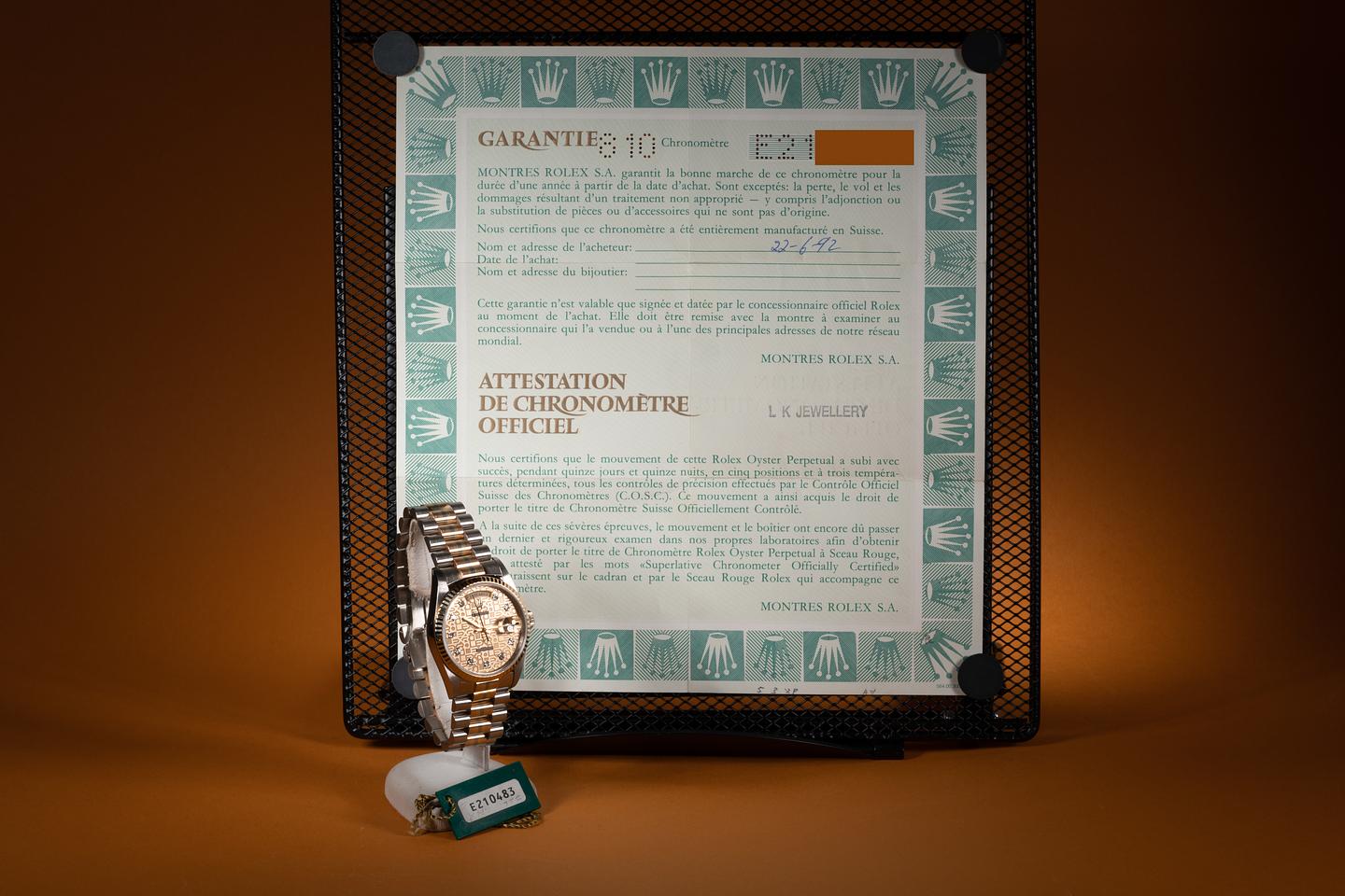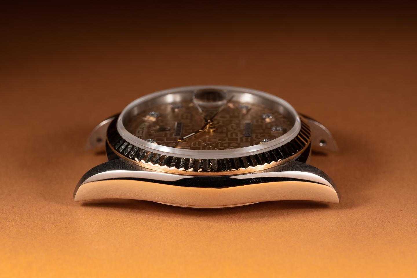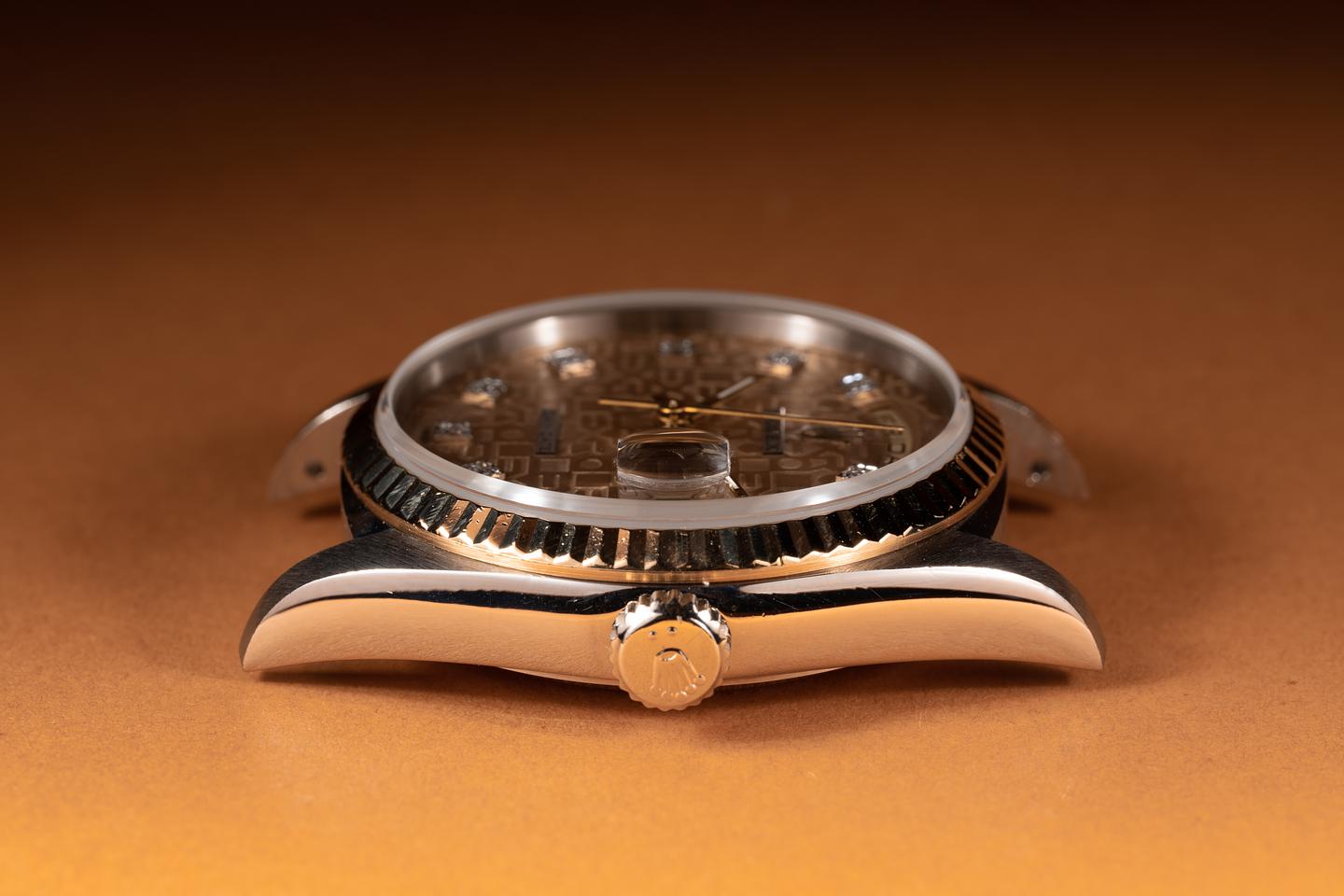 Case: The excellent 18k white gold case has just returned from polishing showing sharp symmetrical lugs. The freshly polished 18k yellow gold fluted bezel is also in excellent condition.