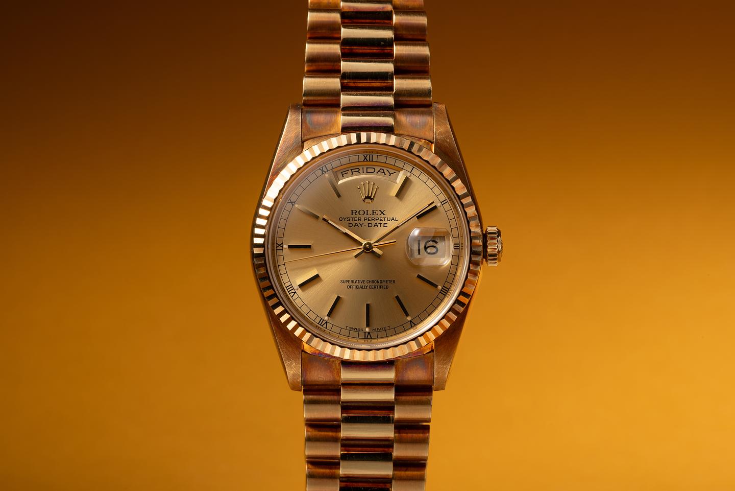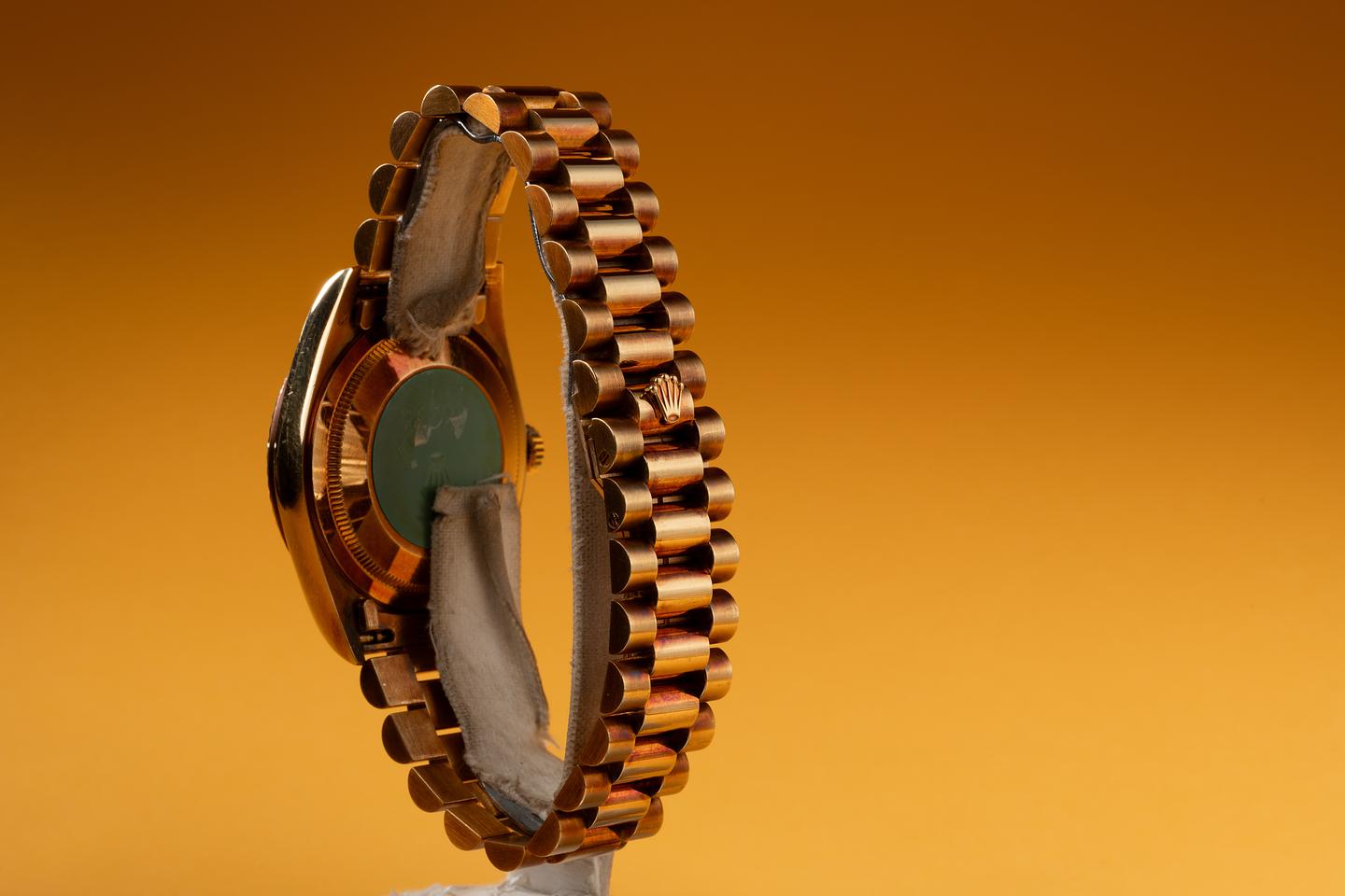 Bracelet: The 23 link 18k yellow gold President bracelet is excellent showing no perceivable. The clasp is stamped with a matching 1990 date code.