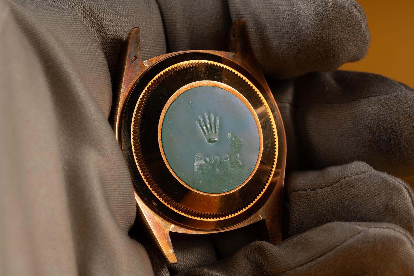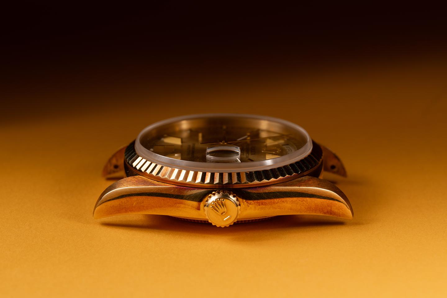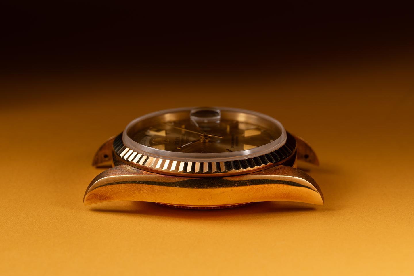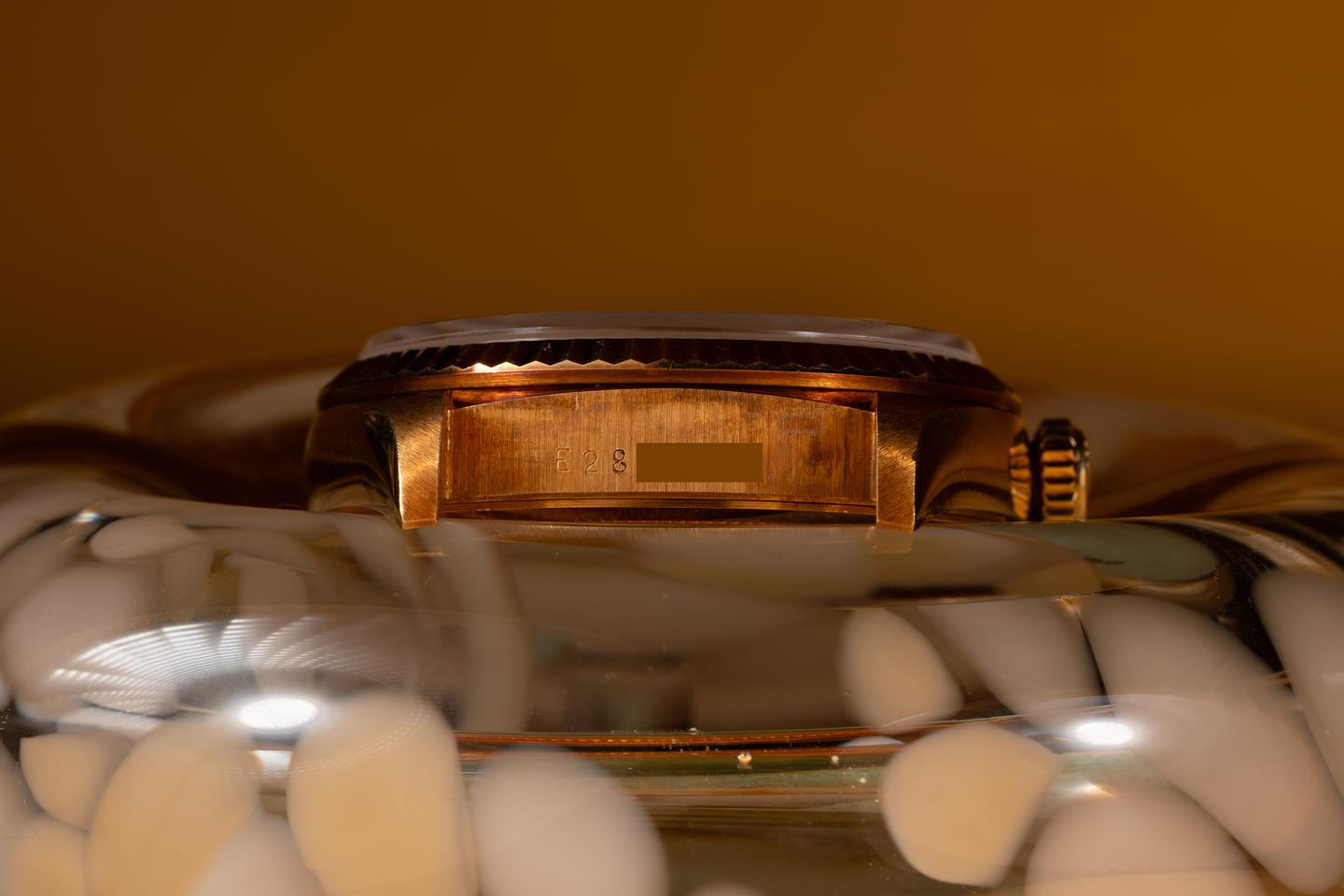 Case: The unpolished 18k yellow gold case is excellent showing a warm vibrant rosy hue from and only light shop wear. The unpolished 18k yellow gold fluted bezel is also excellent showing a warm rosy patina that matches the case.