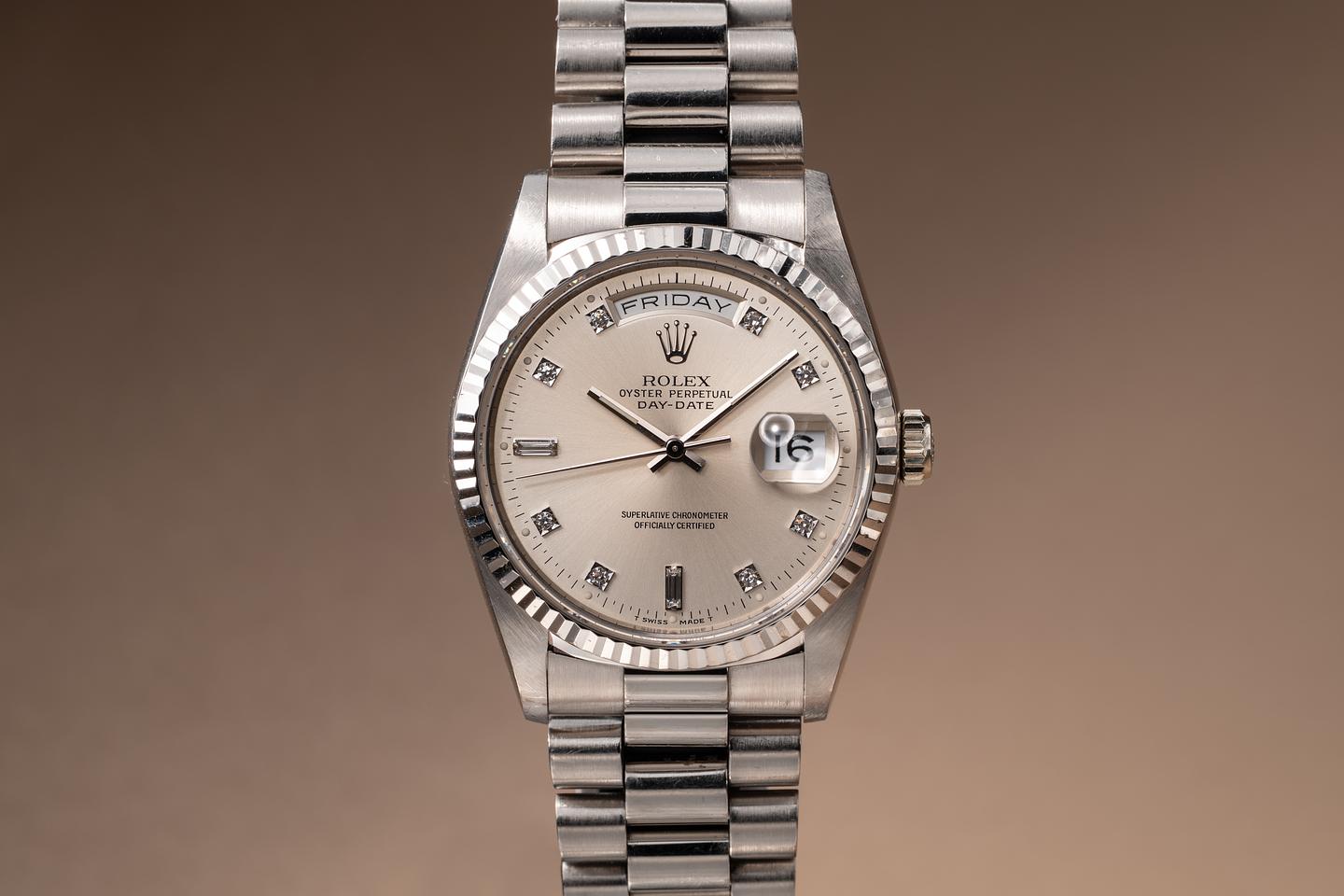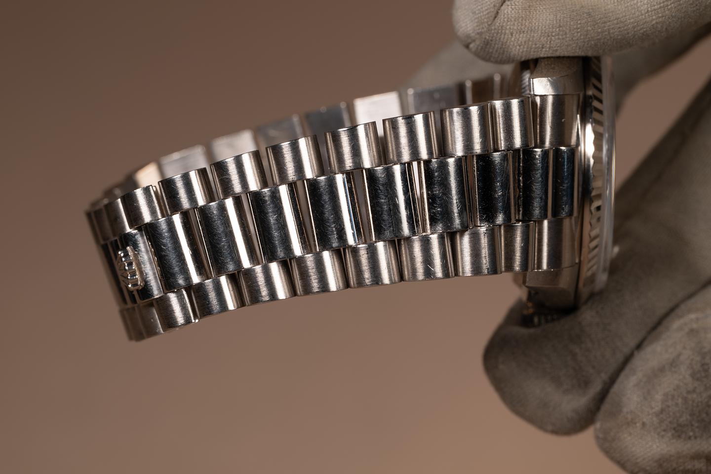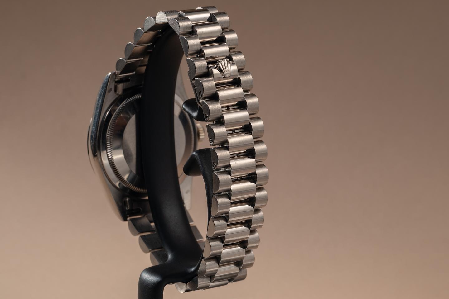 Bracelet: The 22-link 18K white gold President bracelet is excellent, showing only light stretch for its age. The clasp is stamped with a matching 1995 date code.