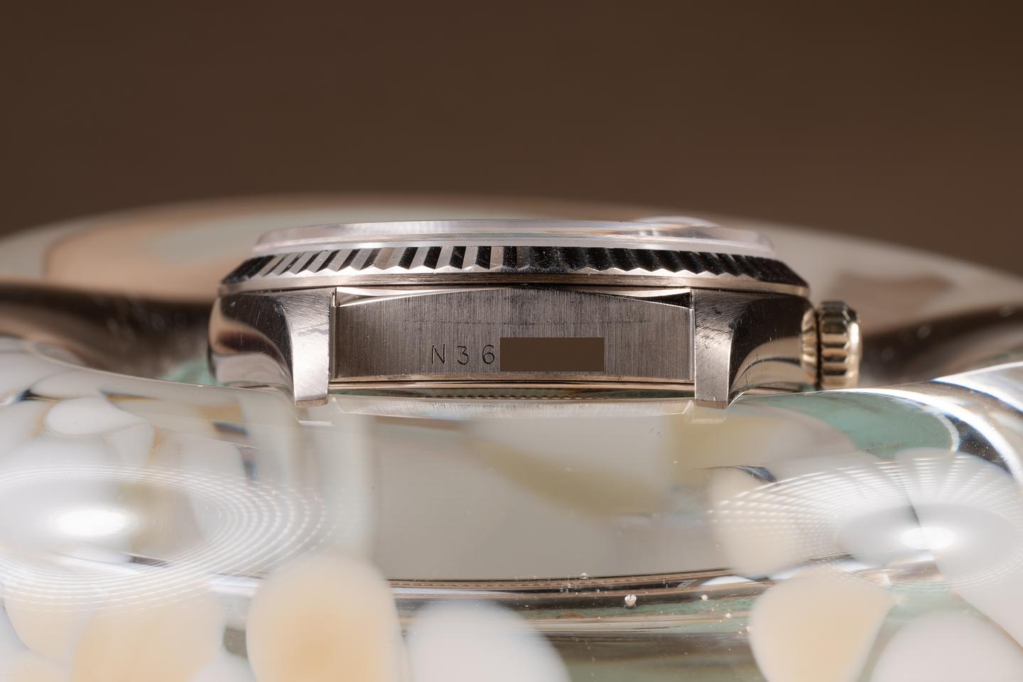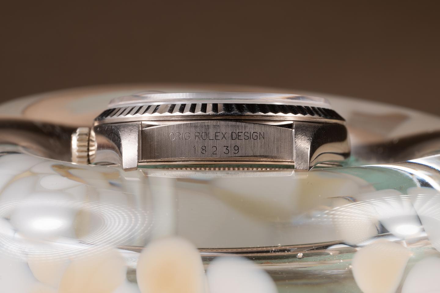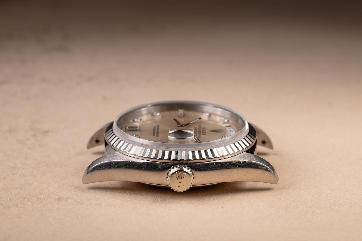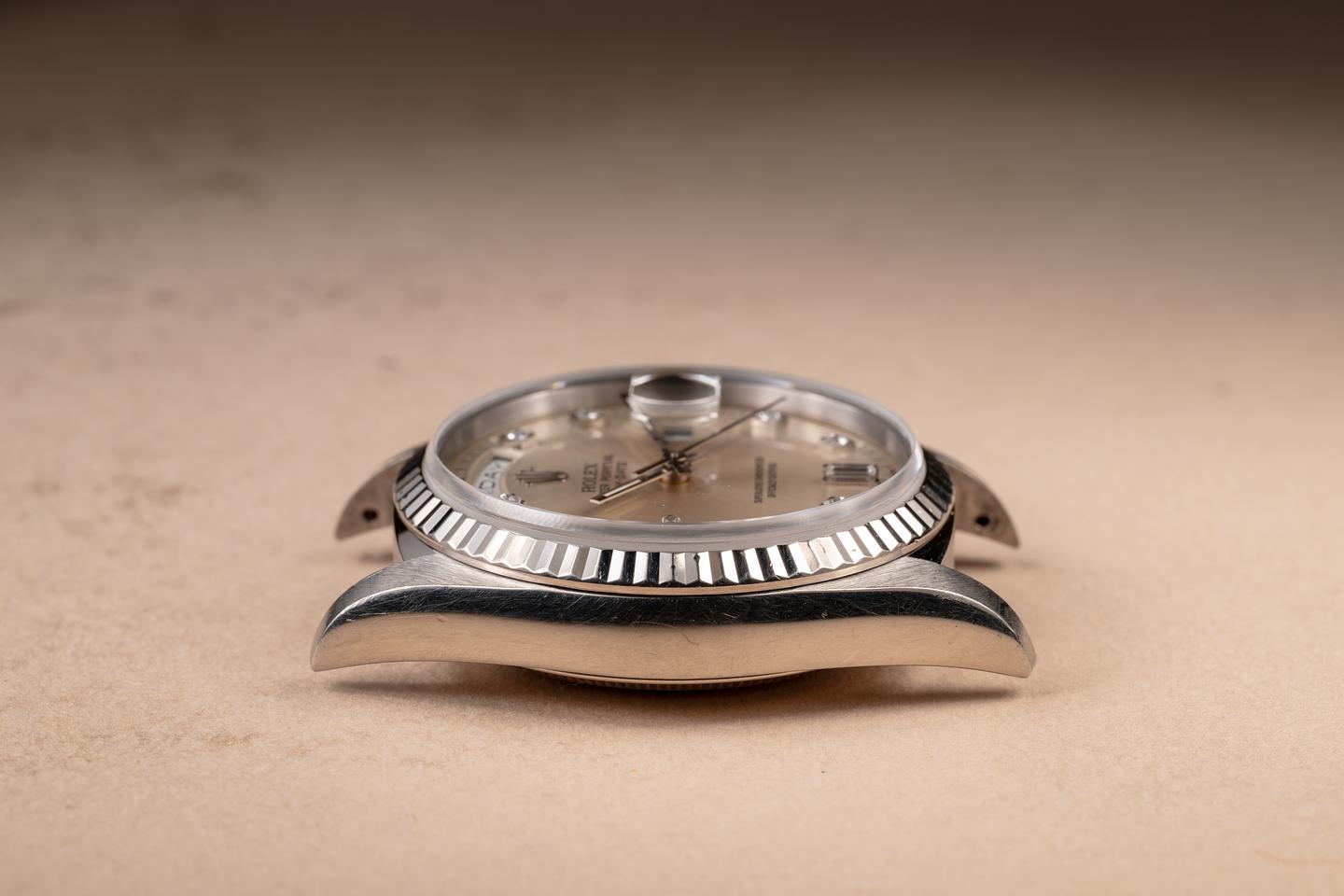 Case: The thick, even 18K white gold case is excellent, showing some light wear from use. The 18K white gold fluted bezel is also in excellent condition, showing only light wear from use.