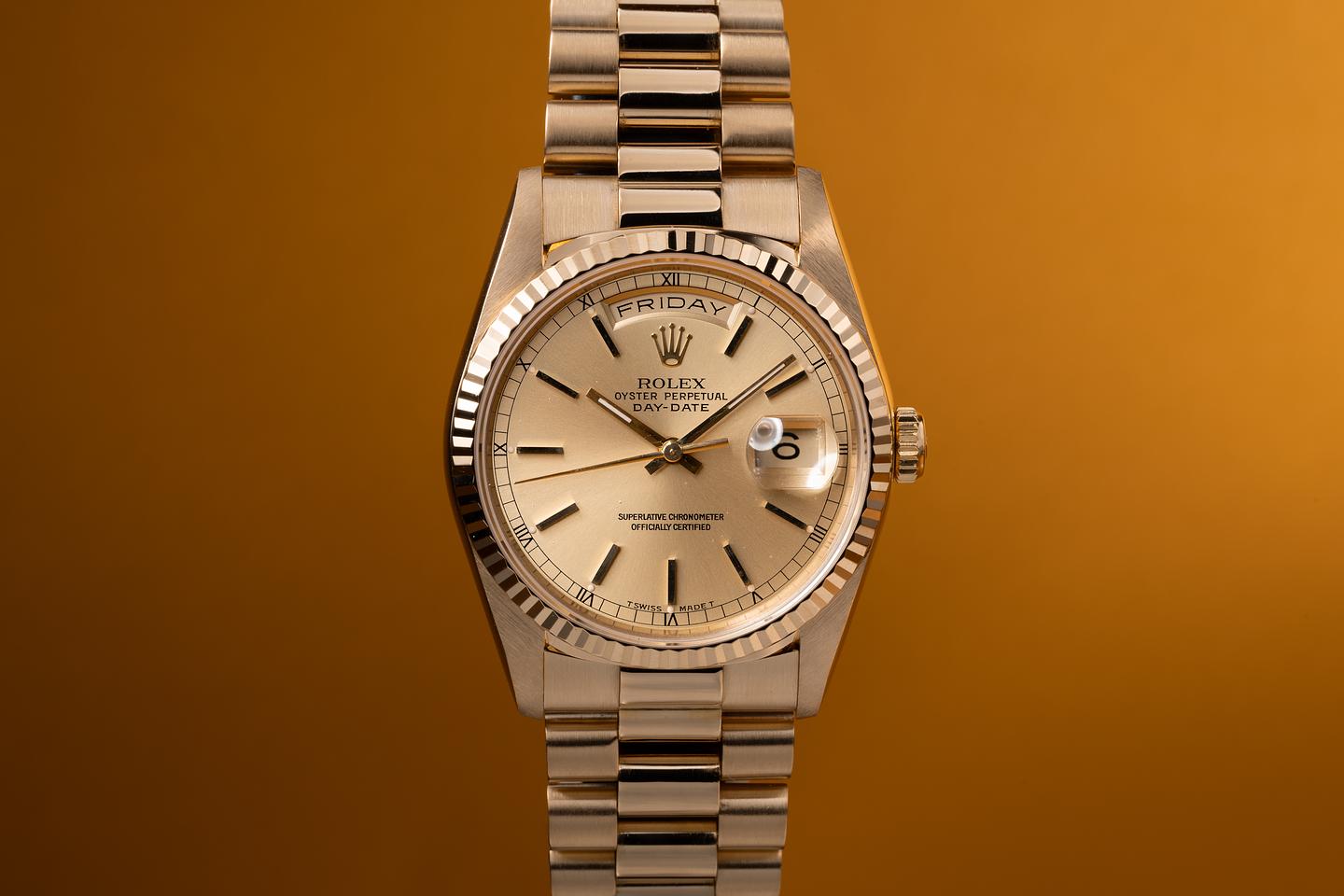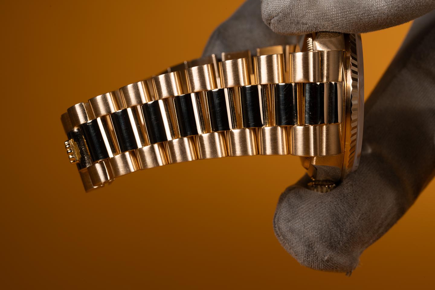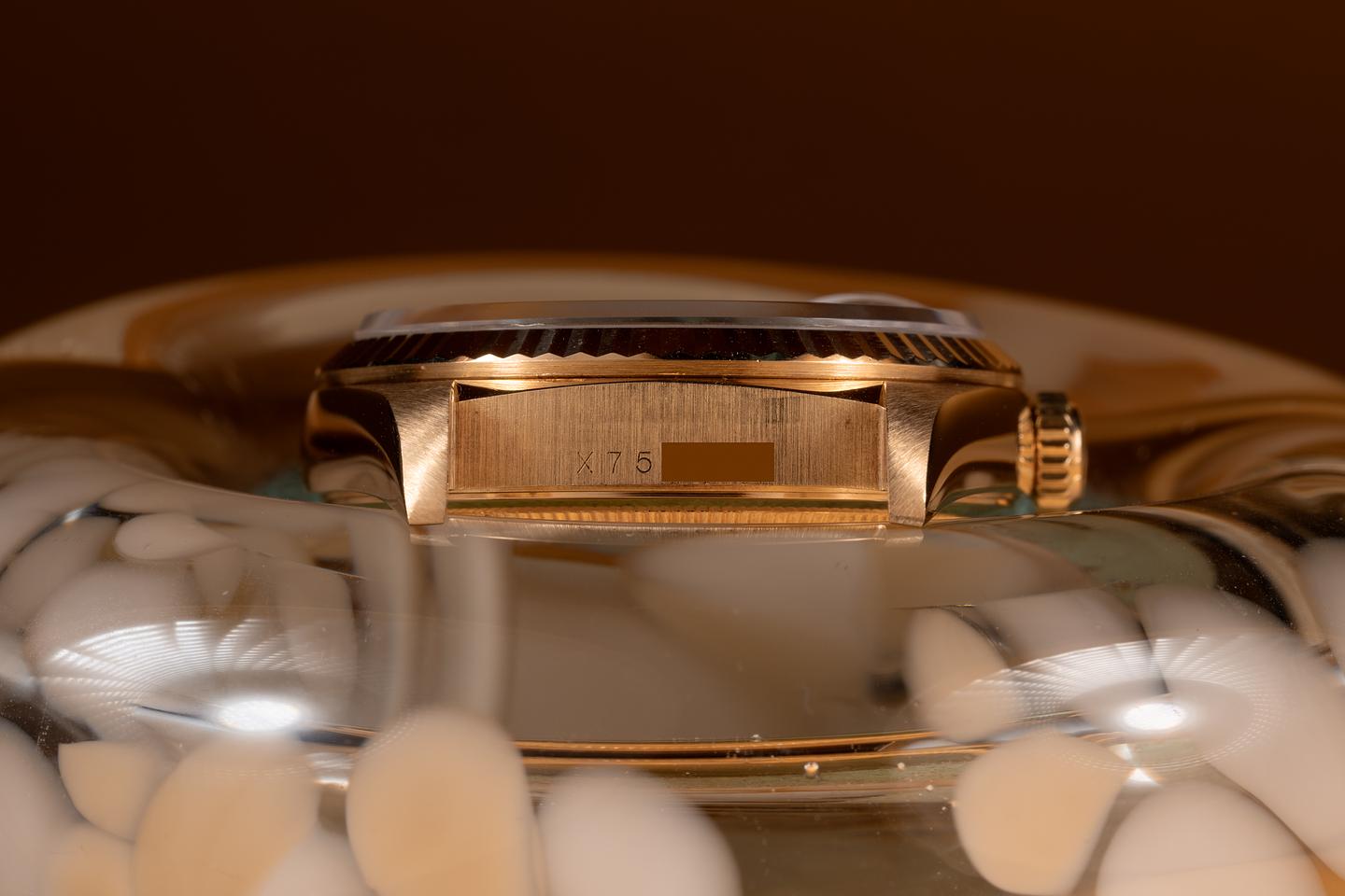 Bracelet: The 22 link 18k yellow gold president bracelet is excellent showing only light stretch for its age. The clasp is stamped with a matching 1991 date code.