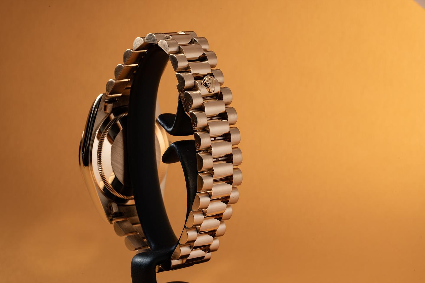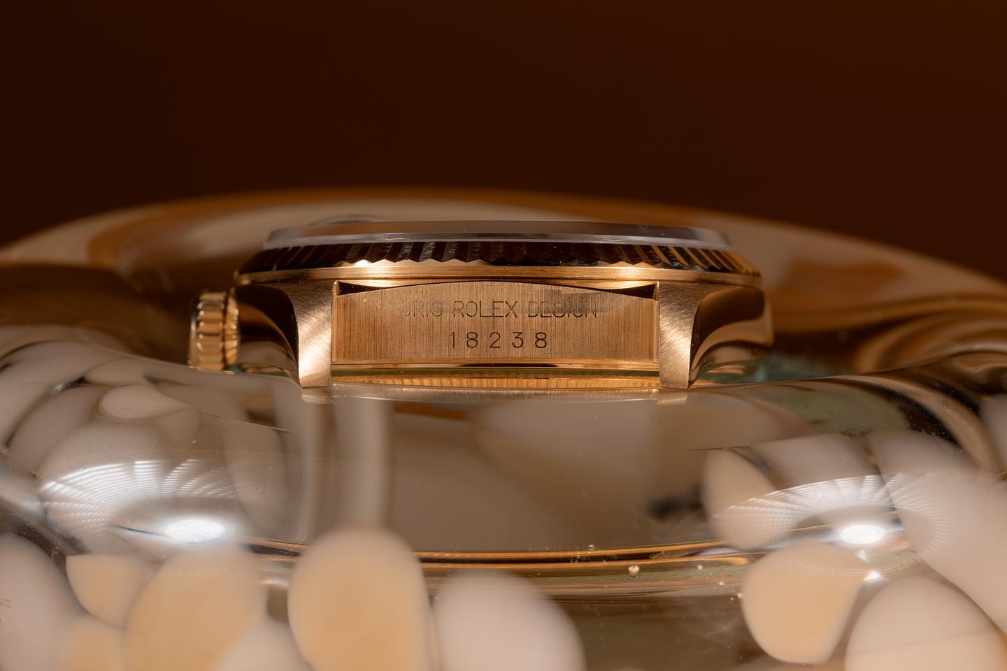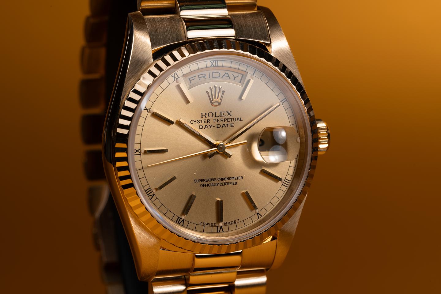 Bracelet: The 22 link 18k yellow gold president bracelet is excellent showing only light stretch for its age. The clasp is stamped with a matching 1991 date code.