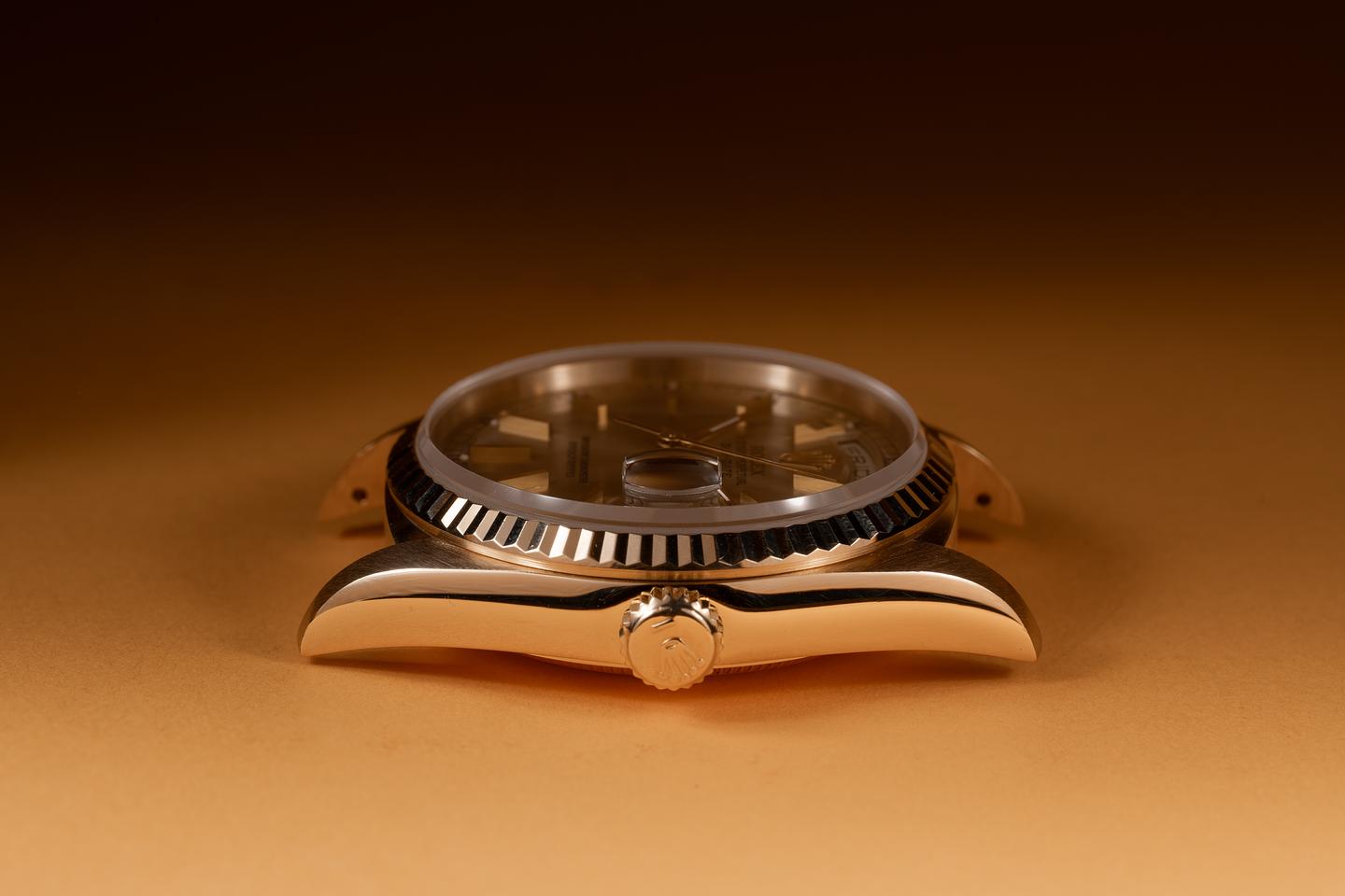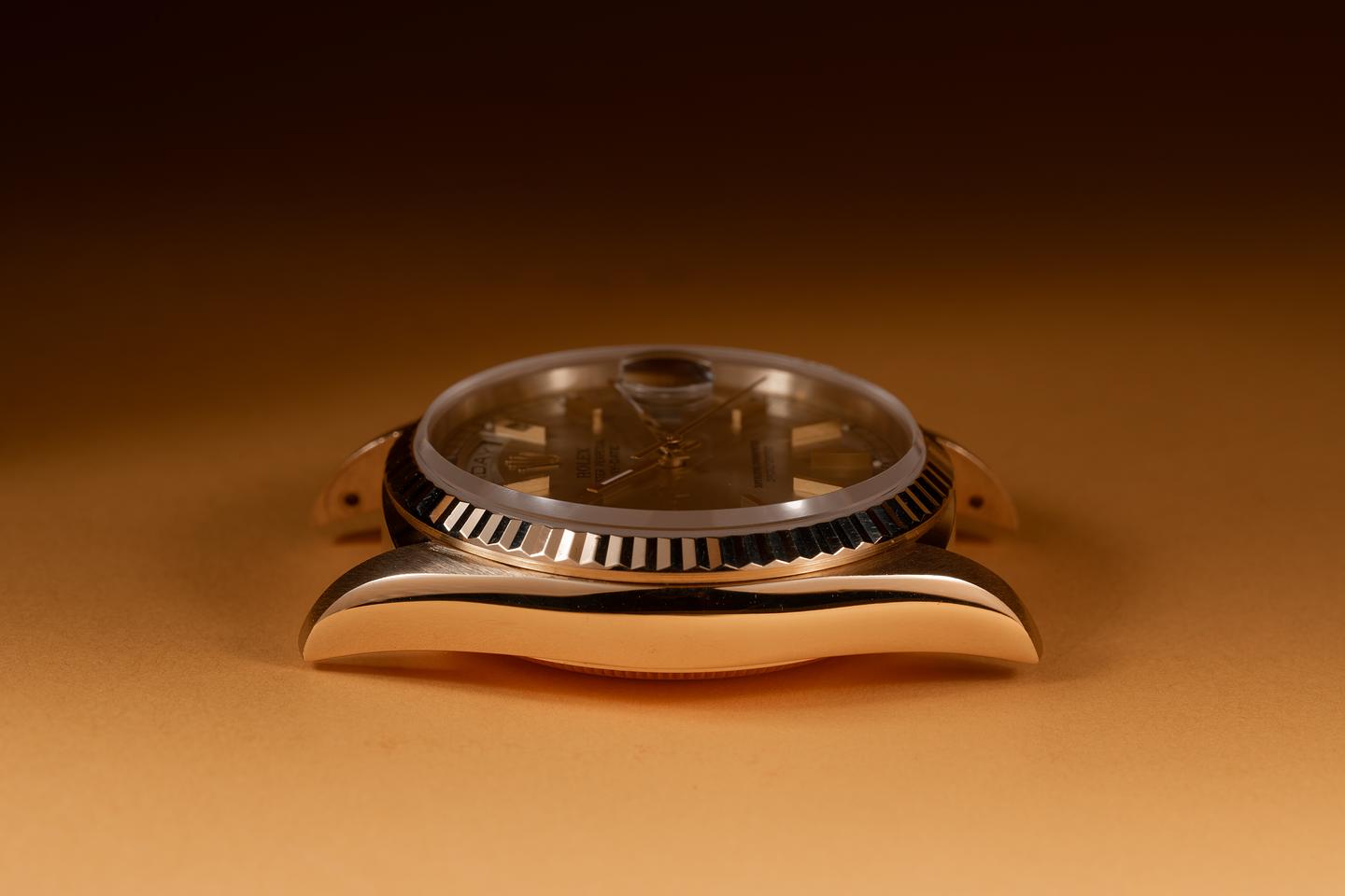 Case: The thick sharp and even 18k yellow gold case is excellent showing only very light wear. The sharp 18k yellow gold fluted bezel is also in excellent condition showing only very light wear.