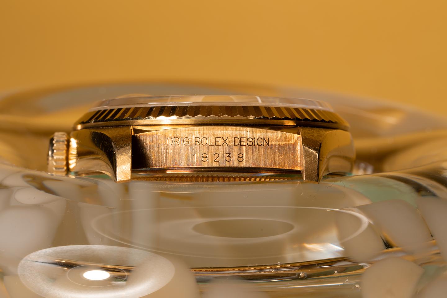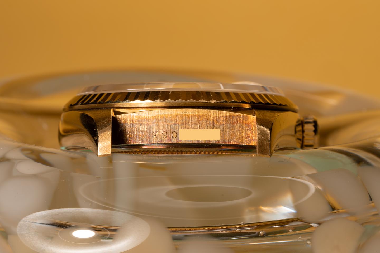 Case: The excellent and thick 18k yg case has a rosy patina and shows light wear from use. The 18k yg fluted bezel is sharp and shows light wear from use.