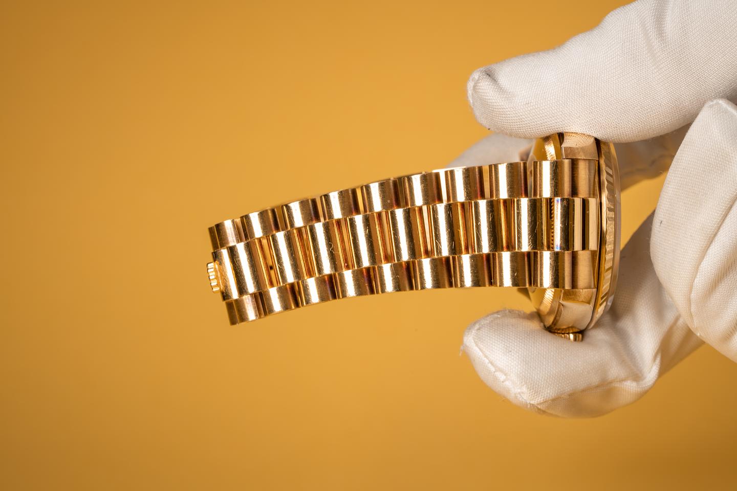 Bracelet: The 22 link 18k yg bracelet has light stretch for its age and the patina on the gold matches the case perfectly.
