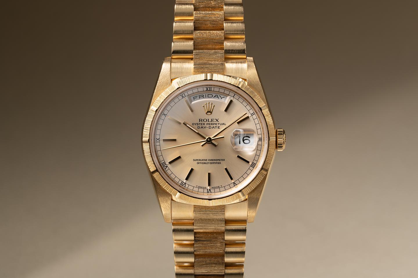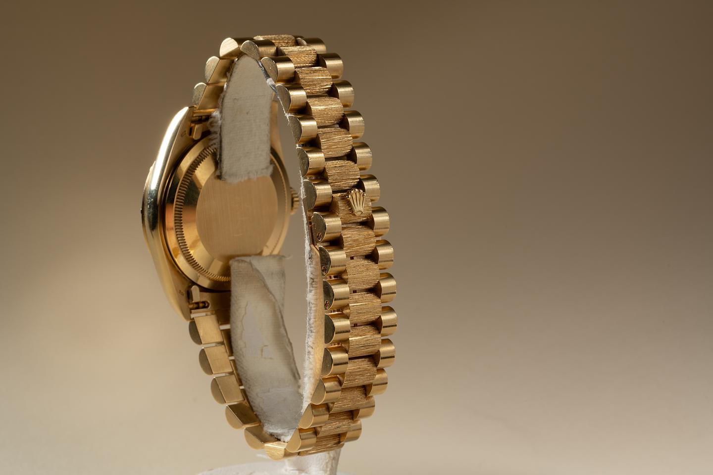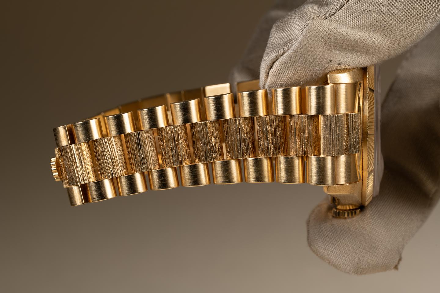Bracelet: The 23 link 18K yellow gold President bark bracelet is excellent showing only very light stretch for its age. The clasp is stamped with a matching 1991 date code.