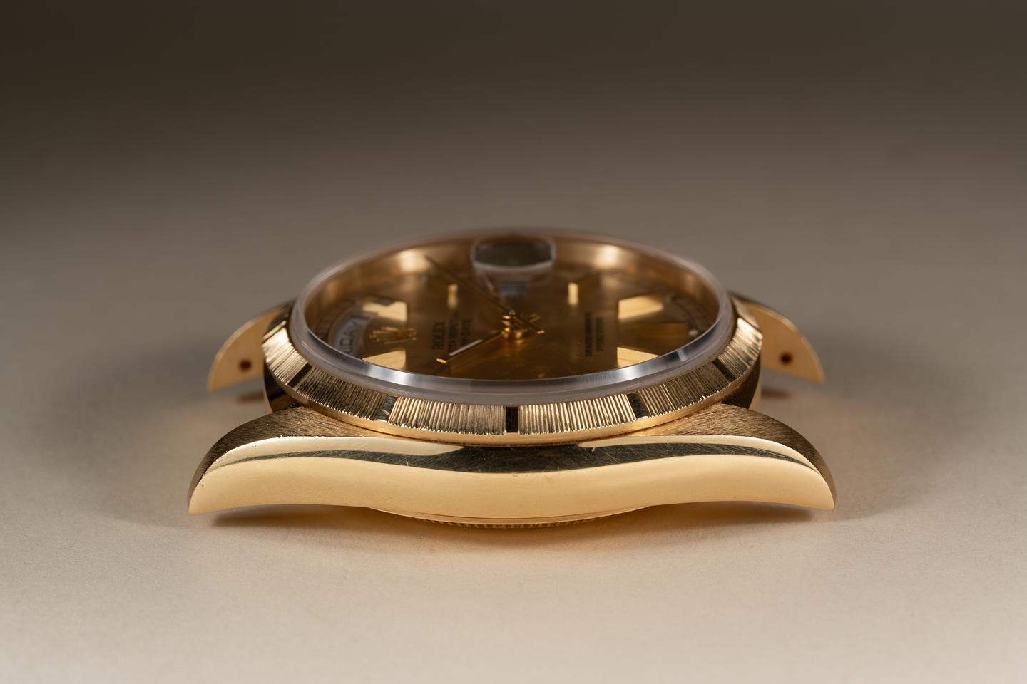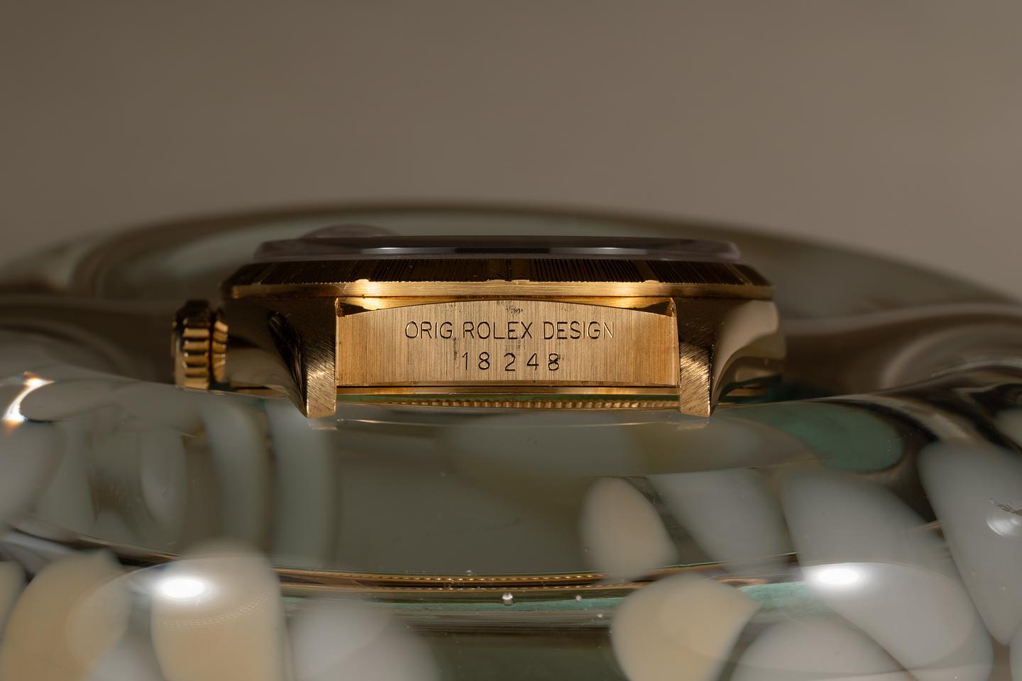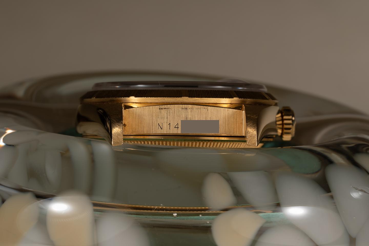 Bracelet: The 23 link 18K yellow gold President bark bracelet is excellent showing only very light stretch for its age. The clasp is stamped with a matching 1991 date code.