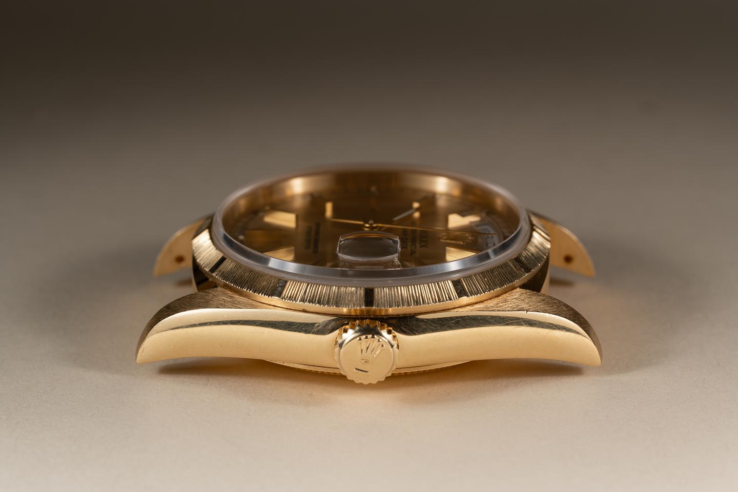 Case: The sharp 18k yellow gold case is excellent showing only light wear from use. The 18k yellow gold bark bezel is also in excellent condition showing only very light wear from use.