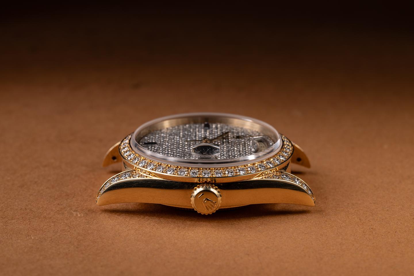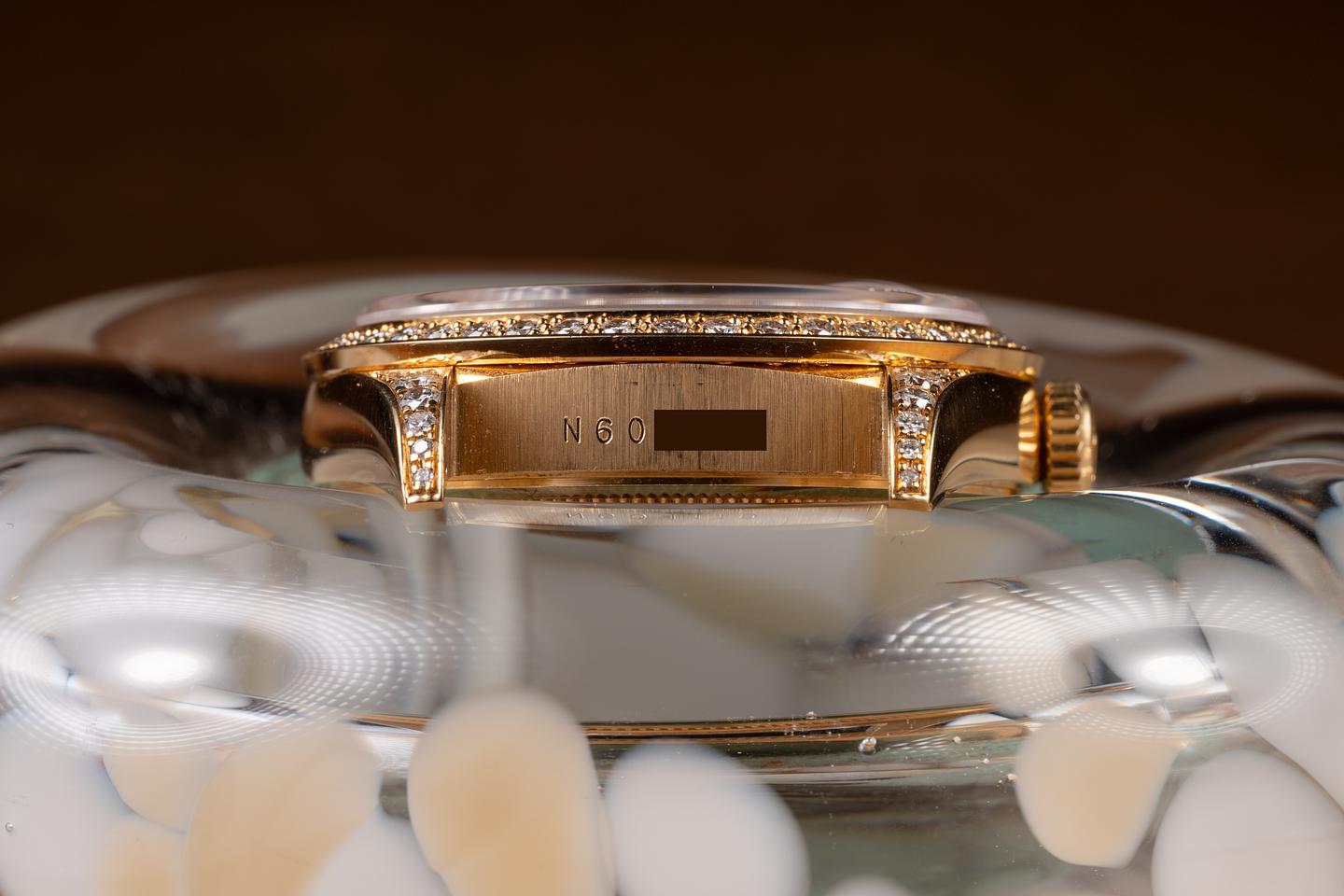 Case: The unpolished 18k yellow gold and diamond case is excellent, showing only very light wear from use. The unpolished 18K yellow gold and diamond bezel is also in excellent condition, showing only very light wear from use.