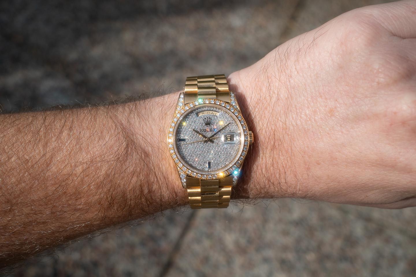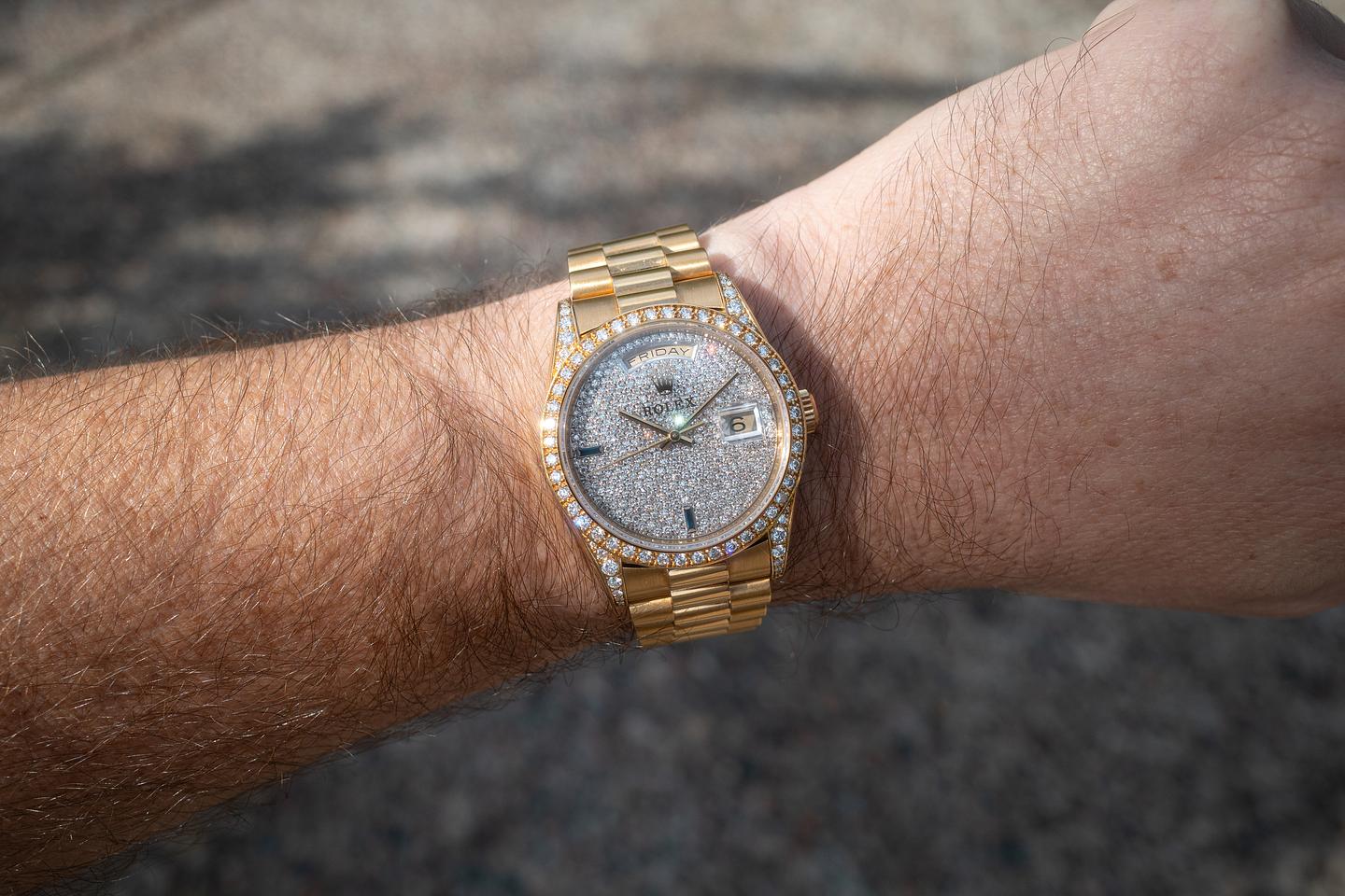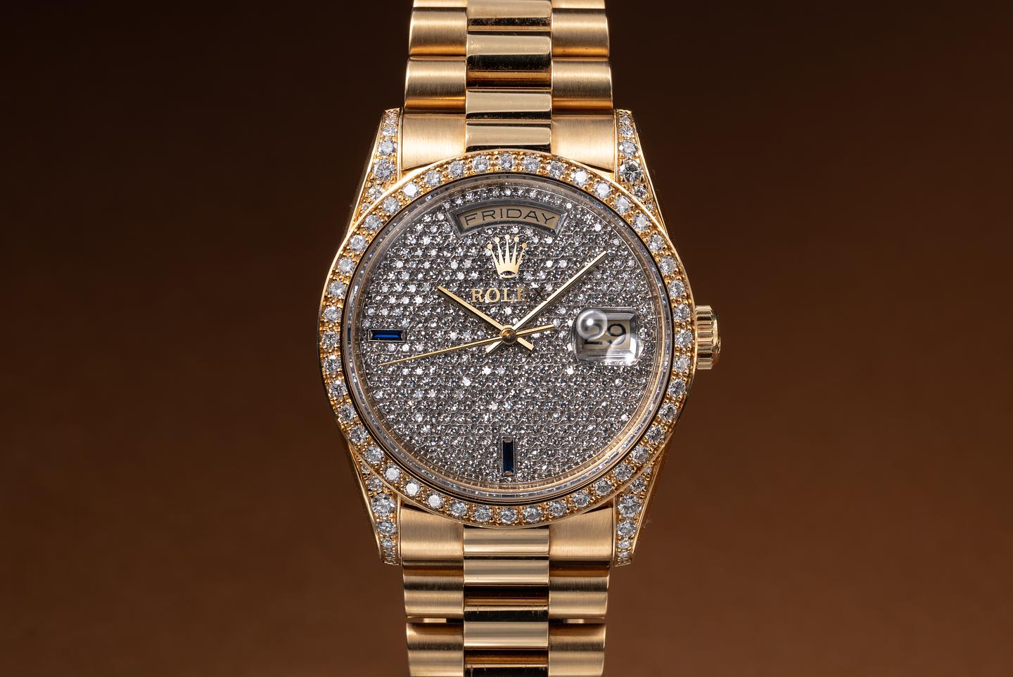 Dial: The diamond and sapphire pave dial is excellent, showing little if any wear for its age. The 18K yellow gold hands are also in excellent condition, showing no visible wear.