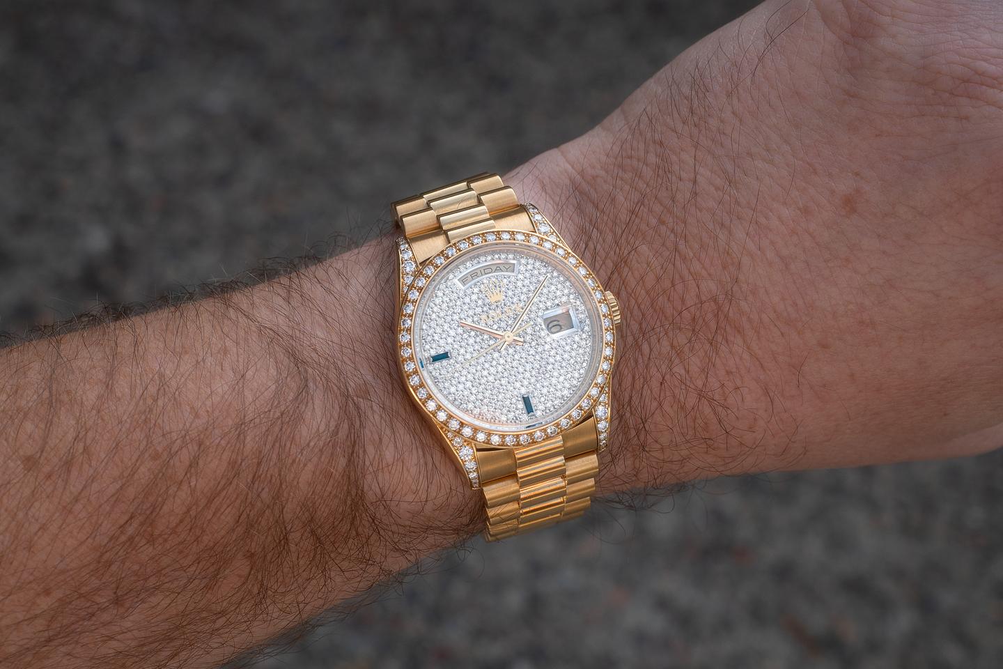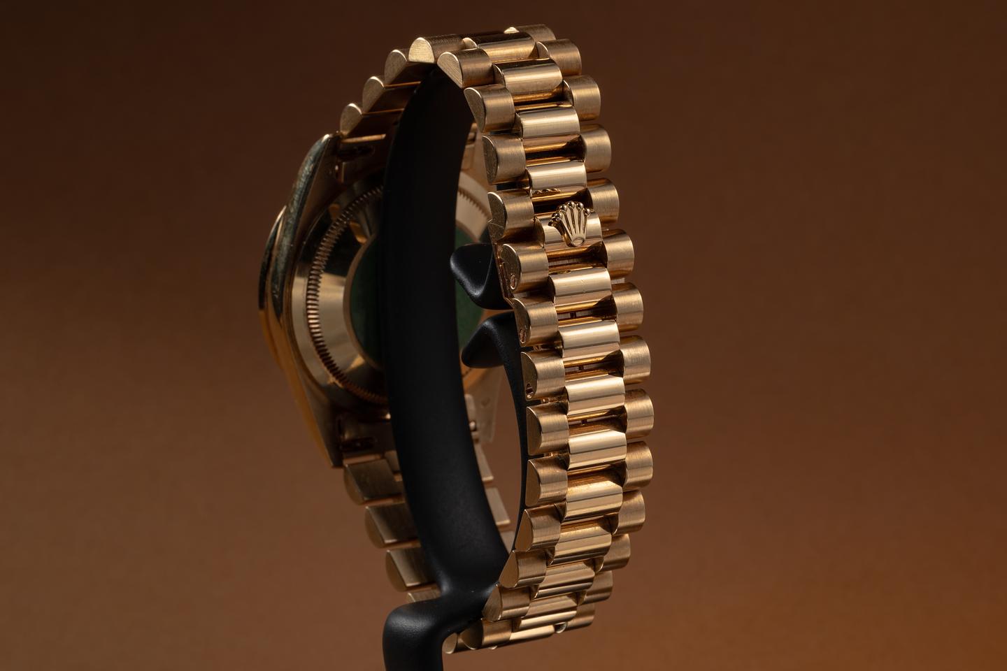 Bracelet: The 22-link 18K yellow gold president bracelet is excellent, showing only very light stretch for its age.