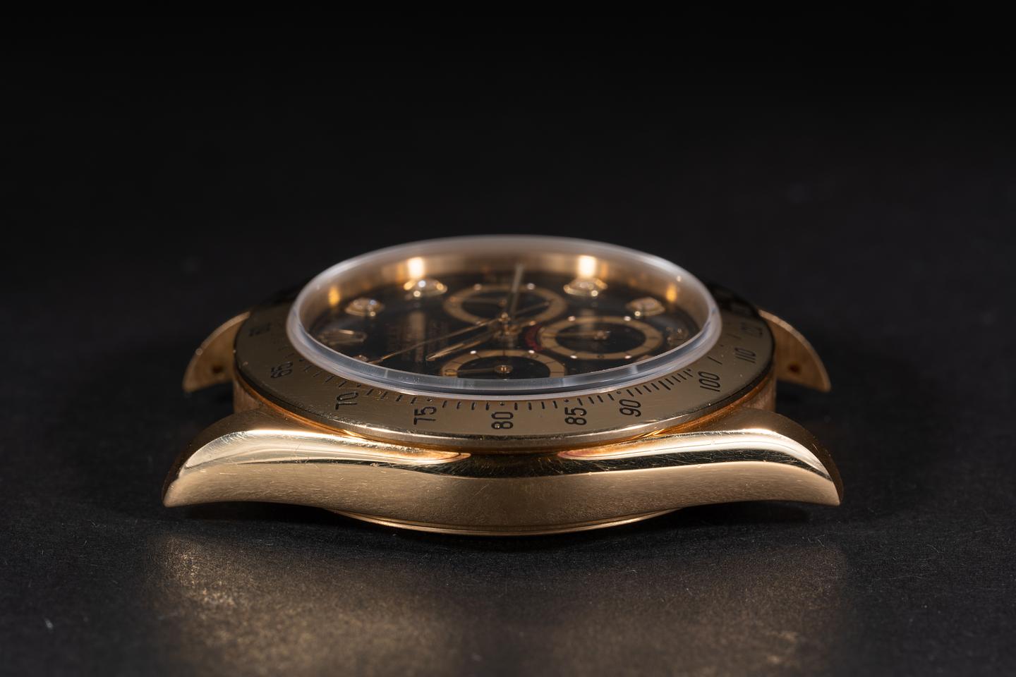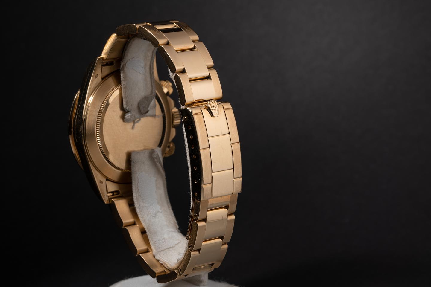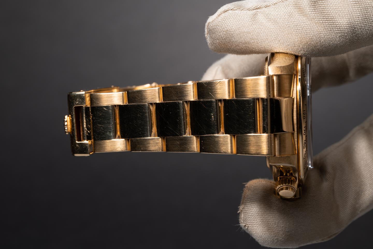 Case: The thick, sharp, and even 18k yellow gold case is excellent showing only very light wear from use. The 18k yellow gold bezel is also in excellent condition showing only very light wear from use.
